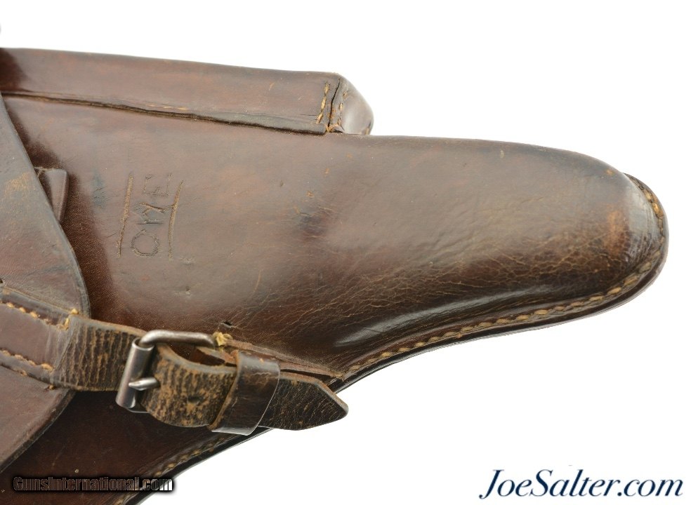 Description: This is a WWI German Military P08 marked Luger Holster brown, produced by unknown maker, stamp has a clear 1915 but I can not read the rest. The holster is in very good+ condition with normal wear, slight fading on top of flap caused by a tape strip and excellent tight stitching including the stitching on the belt loops. There is writing on the inside of the flap but I can not make it out but the initials OWE are on the body and flap. The hardware is in excellent working condition with no verdigris. Nice usable, supple holster.; SOLD |
