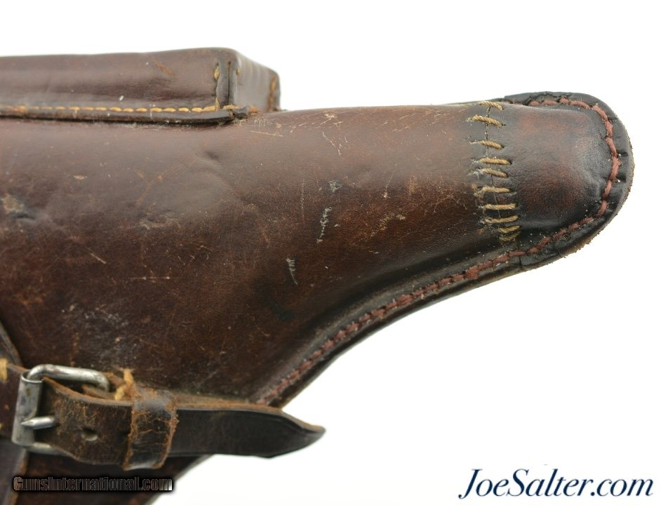 Description: This is a WWI German Military P08 marked Luger Holster brown, F.Fisoher K.g.b. 1916. The holster is in very good+ condition with normal wear, slight fading on top of flap and excellent tight stitching including the stitching on the belt loops. There is writing on the inside of the flap but I can not make it out. The hardware is in excellent working condition with the smallest amount of verdigris. The pistol release strap is fine but the Luger tool stud is broken. There has been an excellent repair to the toe of this holster. Please see pictures for details. SOLD |
