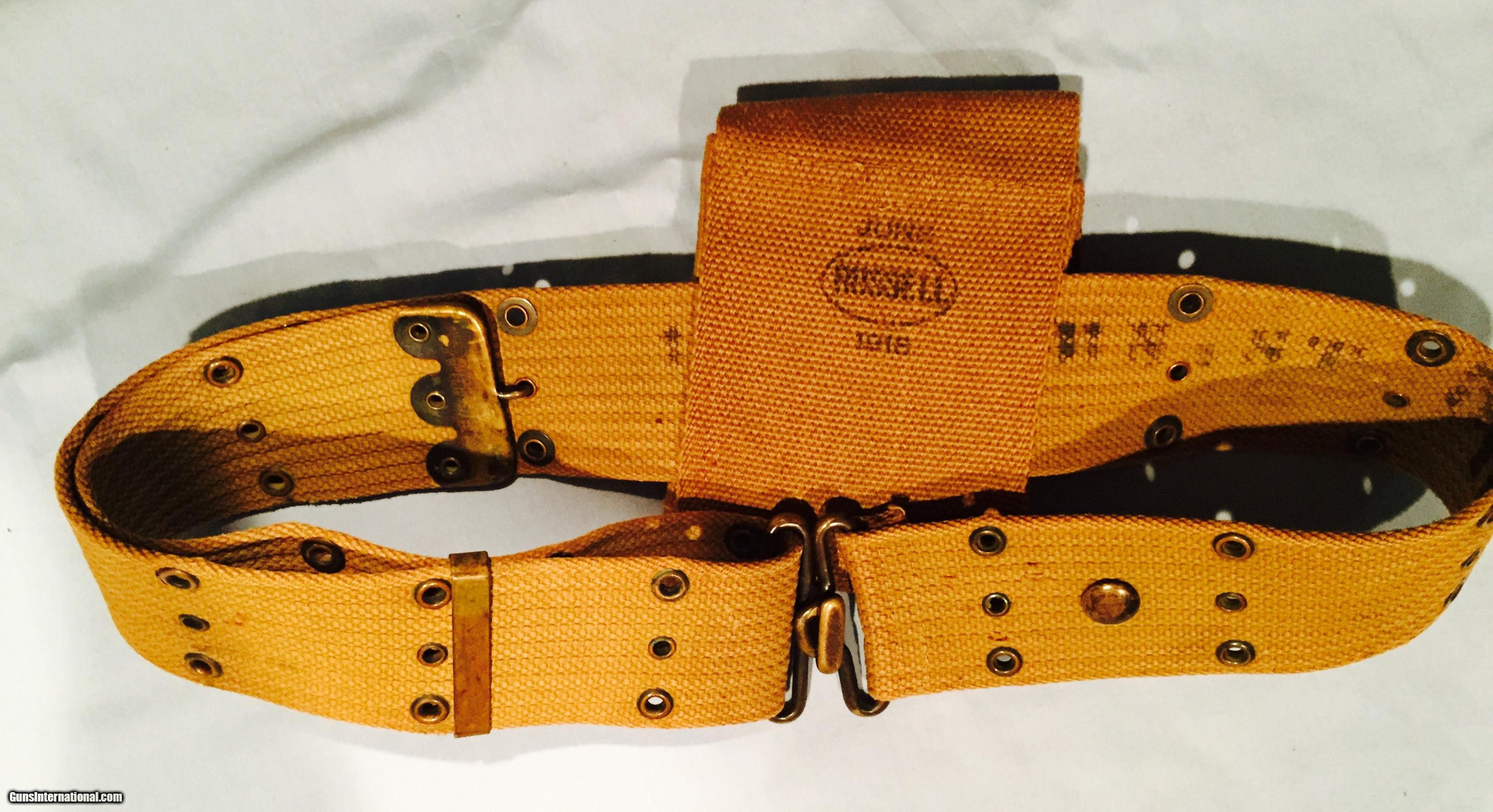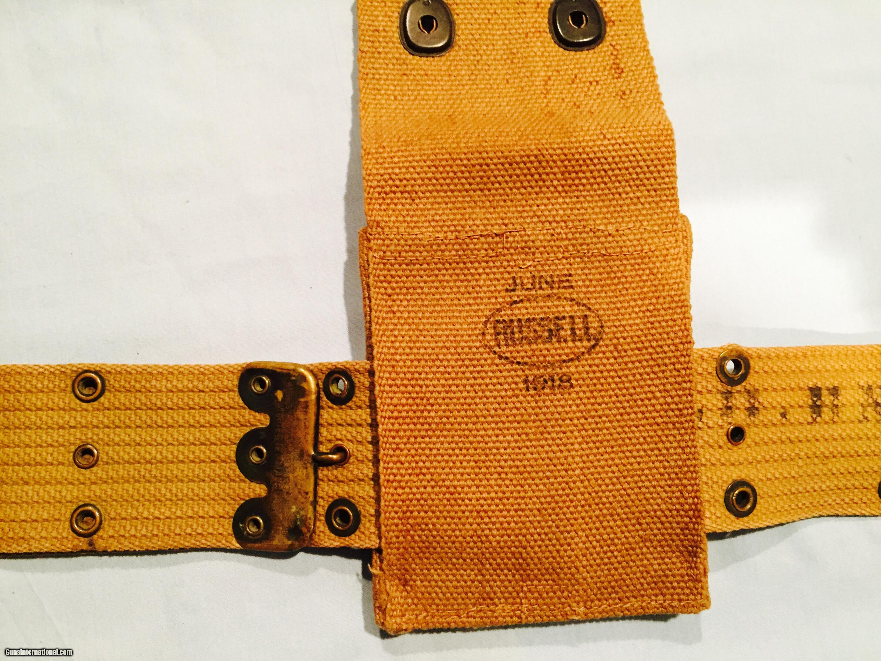Description: Original WWI tan army assorey belt with magazine pouch dated June 1918 by Russel a assessory contractor that made clothing for the US Army. SOLD |
