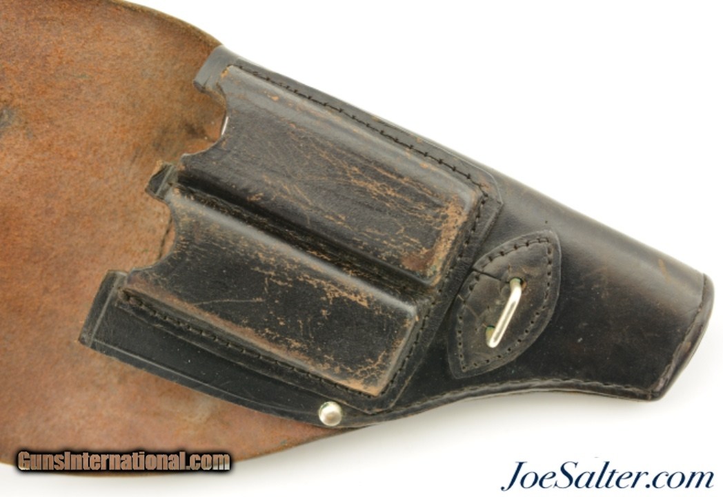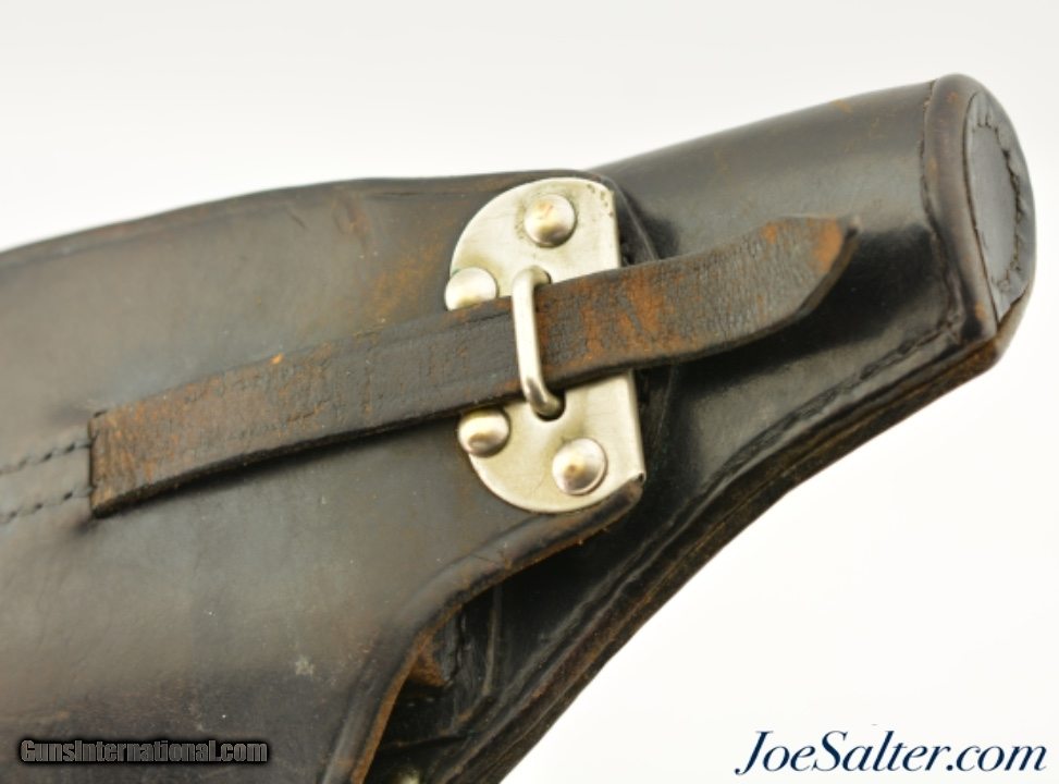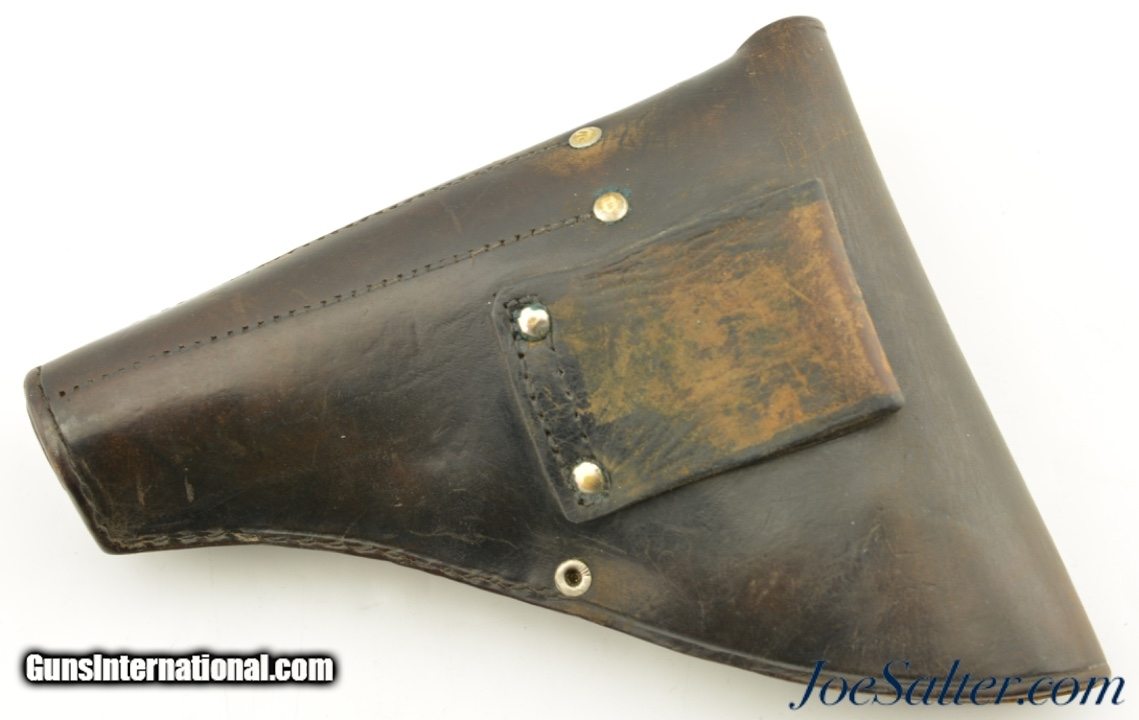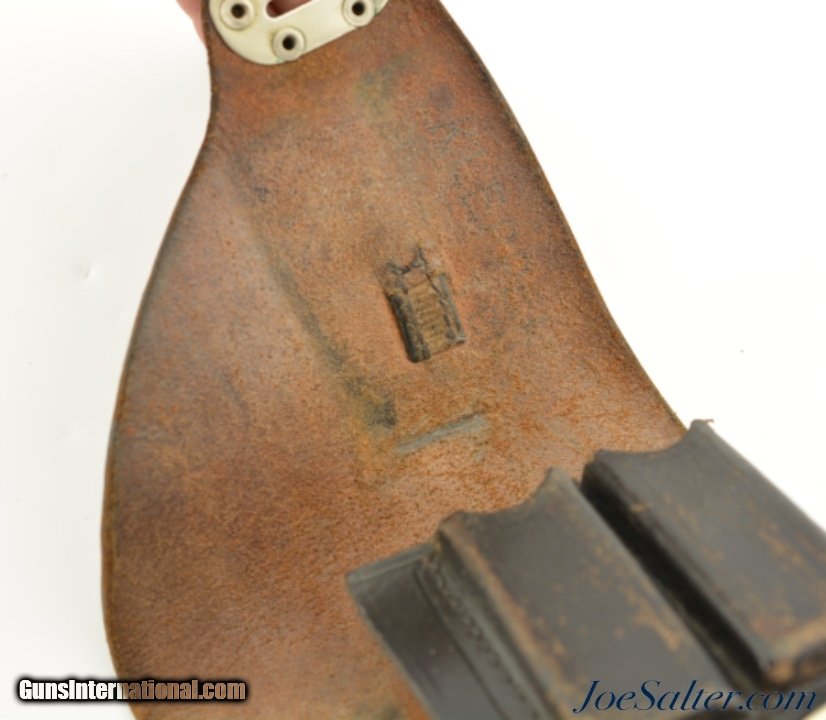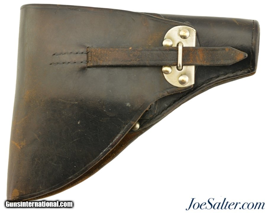 Description: This is a WWII Belgian Holster for the FN1910/1922 and would have been built between 1920's and 1940. The holster is in excellent condition with some wear on the top of the flap and belt loop hanger. The leather is still nice and pliable and easy to use. The hardware is nickle-brass and has only the lightest verdigris. This holster has two mag slots and one slot the cleaning rod which is included. Fill this holster and strap it on and have many more years of service. Excellent for display in your collection. SOLD |