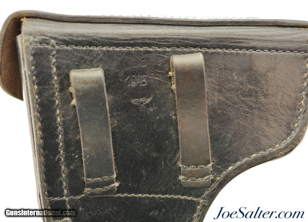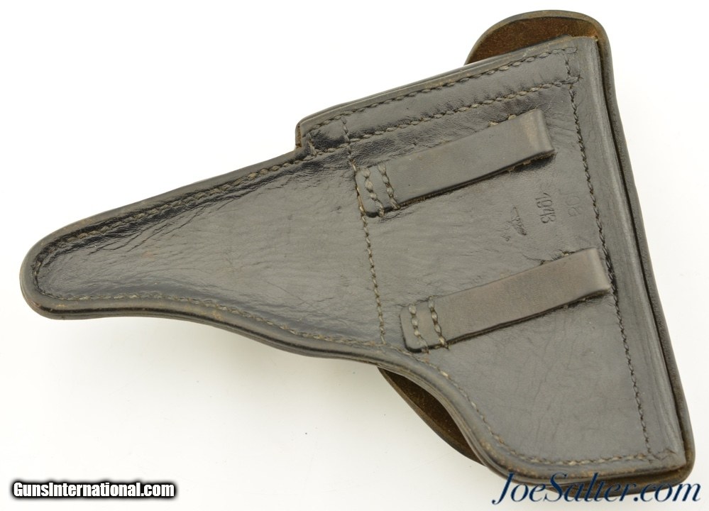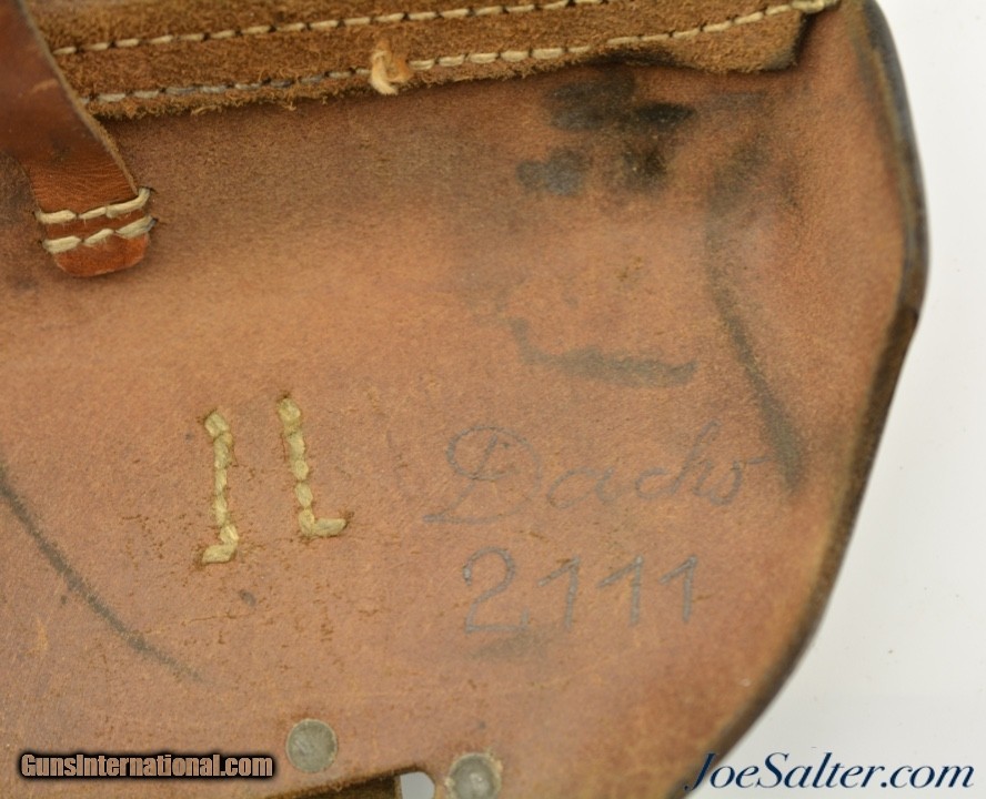Description: This is a WWII P-38 Hard Shell Holster built in 1943, marked JOA built by Dresclner Koffer u Taschen Fabrik and marked "Dacho 2111", inside flap. The condition is excellent with supple leather and almost all of the original finish and tight stitching. SOLD |