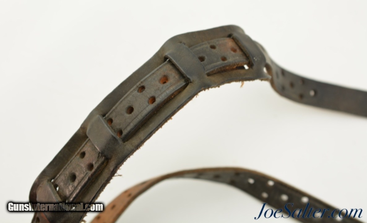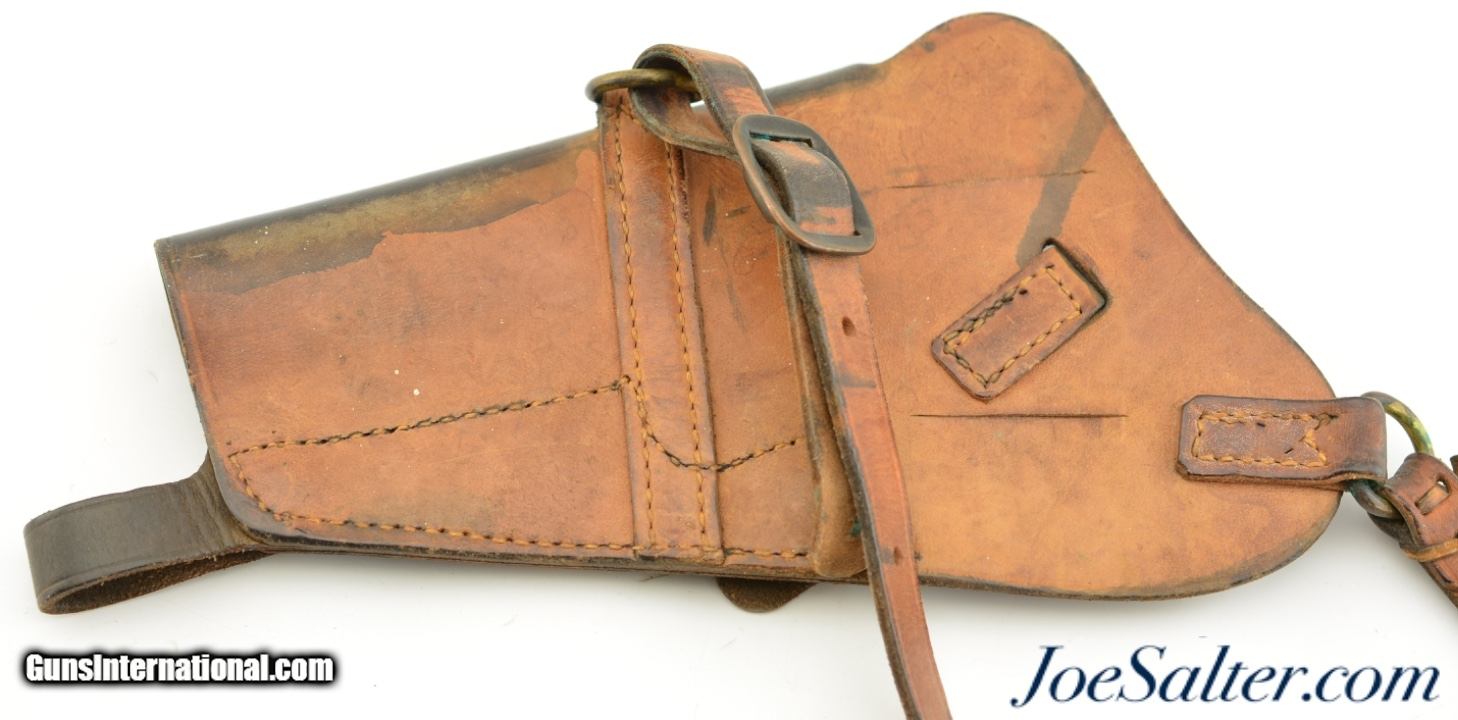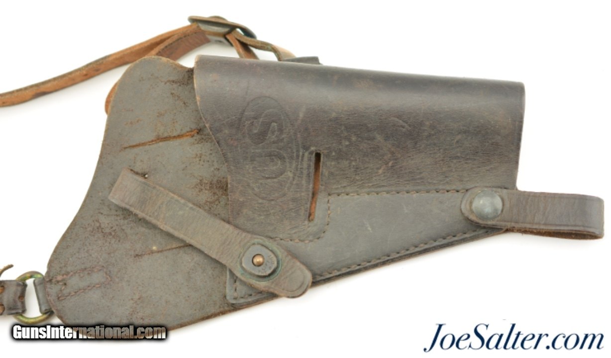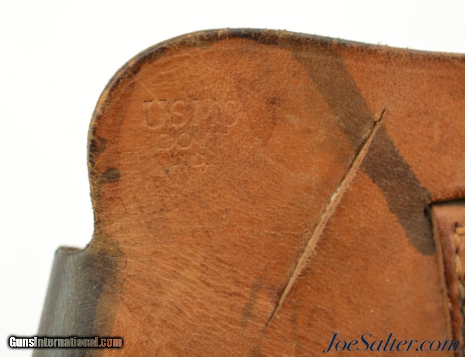 Description: This is an original USGI issued M7 shoulder holster for the 1911 pistol. It is marked "USMC / Boyt / 44" on the back and was issued to the Marine Corps. This is a first year marked, 1944, of adoption for the M7 holster which allowed for easier carry than the M3 however the second strap which makes this adjustable is missing. The natural plain leather color is visible on the back of the holster with the front and strap now black as a result of oils and field staining. In near excellent condition this example is nicely marked with the "U.S." embossing on the front. A well preserved example of a scarce original WWII issued USMC holster. Price: $195.00 Contact Seller |