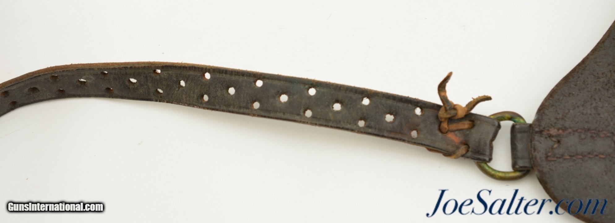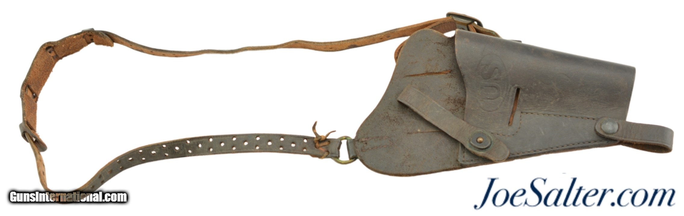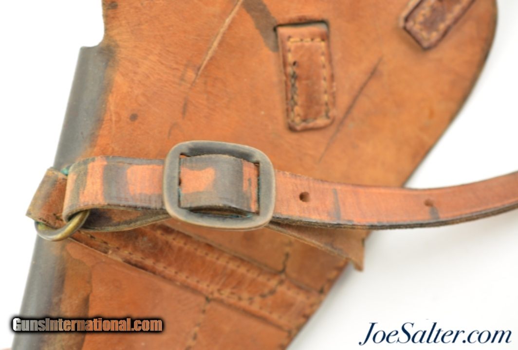 Description: This is an original USGI issued M7 shoulder holster for the 1911 pistol. It is marked "USMC / Boyt / 44" on the back and was issued to the Marine Corps. This is a first year marked, 1944, of adoption for the M7 holster which allowed for easier carry than the M3 however the second strap which makes this adjustable is missing. The natural plain leather color is visible on the back of the holster with the front and strap now black as a result of oils and field staining. In near excellent condition this example is nicely marked with the "U.S." embossing on the front. A well preserved example of a scarce original WWII issued USMC holster. Price: $195.00 Contact Seller |