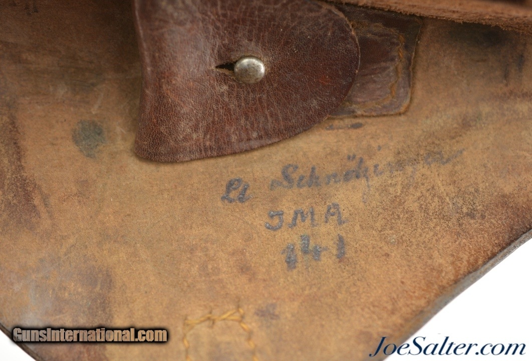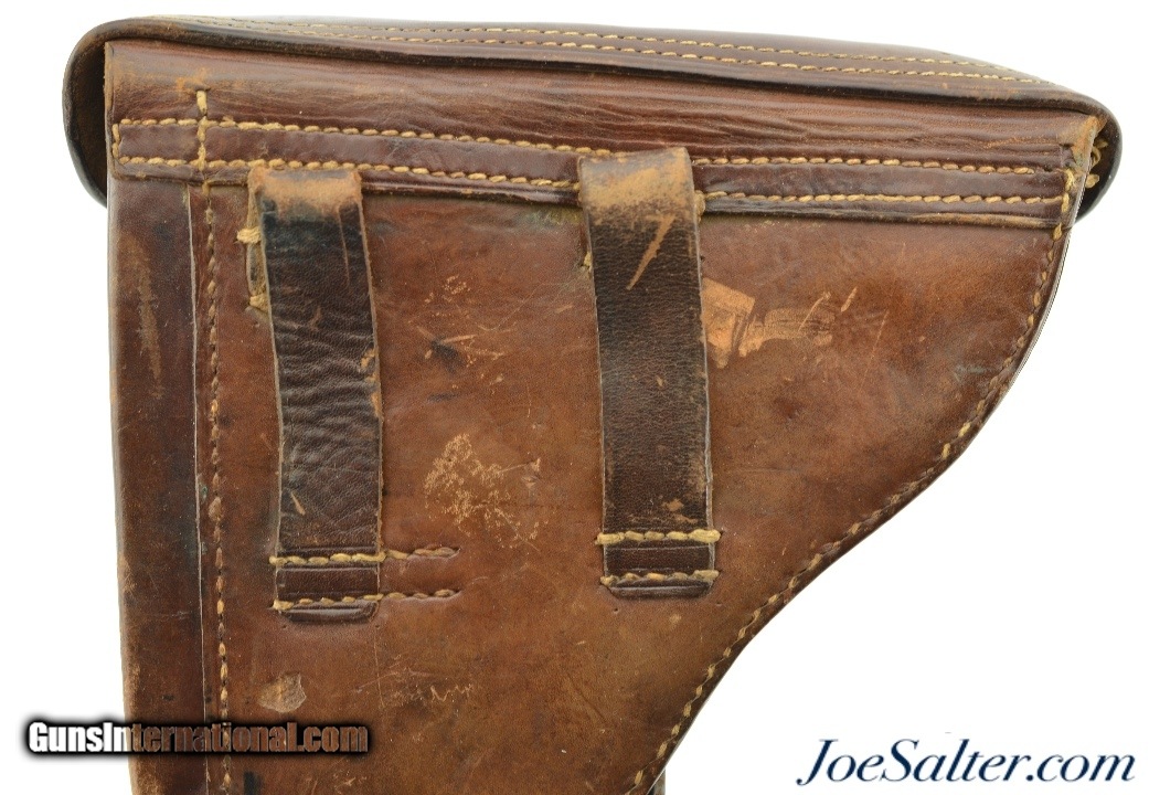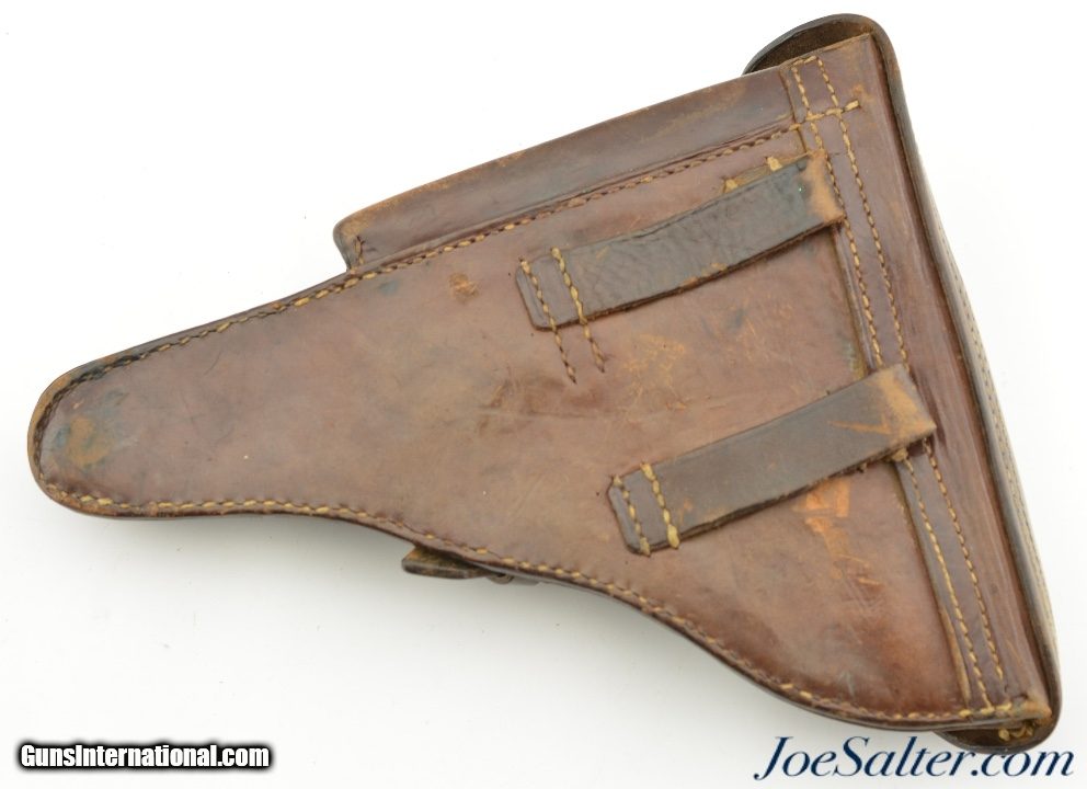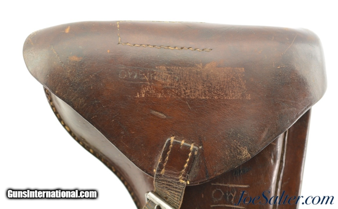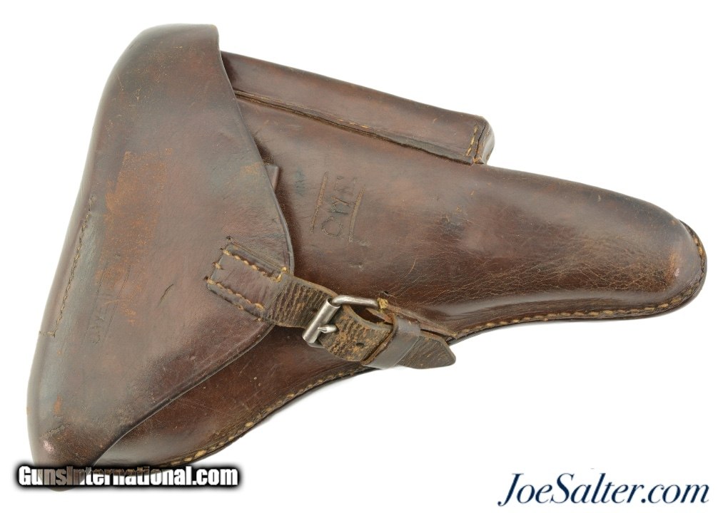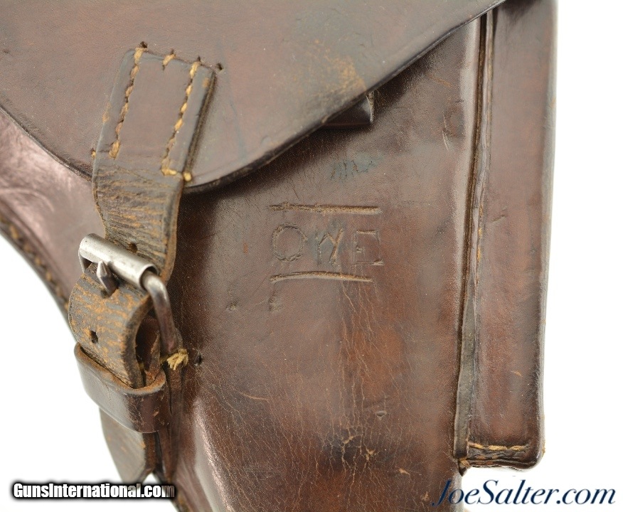 Description: This is a WWI German Military P08 marked Luger Holster brown, produced by unknown maker, stamp has a clear 1915 but I can not read the rest. The holster is in very good+ condition with normal wear, slight fading on top of flap caused by a tape strip and excellent tight stitching including the stitching on the belt loops. There is writing on the inside of the flap but I can not make it out but the initials OWE are on the body and flap. The hardware is in excellent working condition with no verdigris. Nice usable, supple holster.; Price: $275.00 Contact Seller |