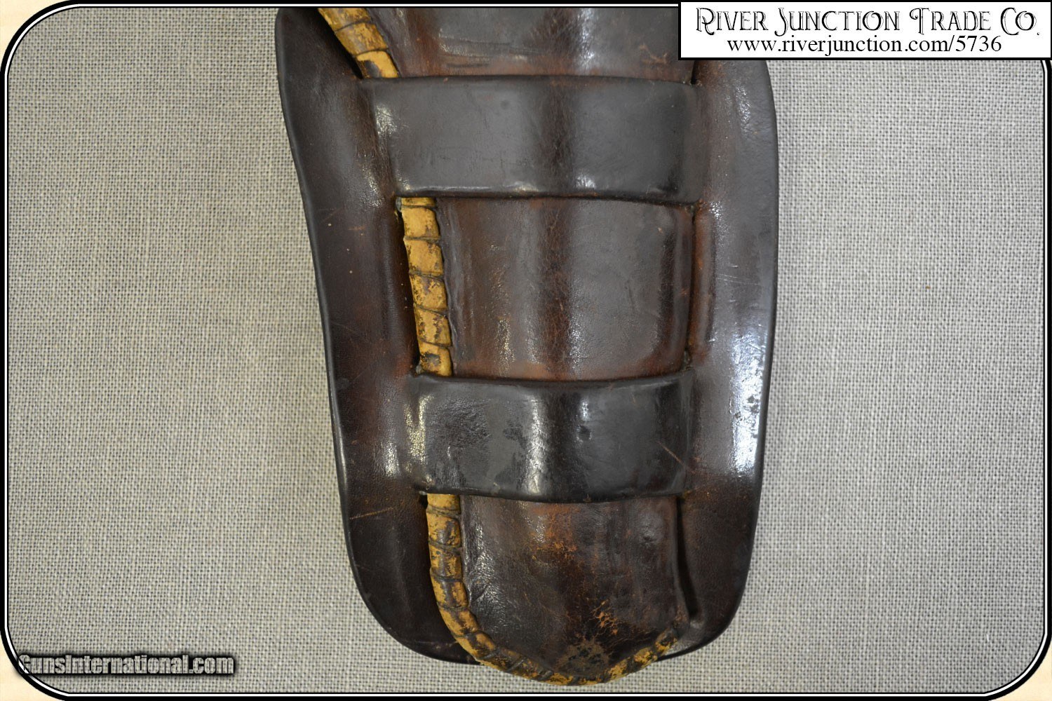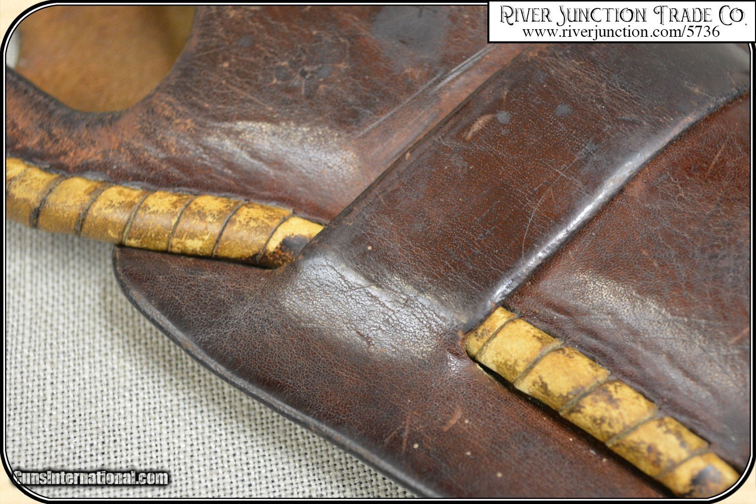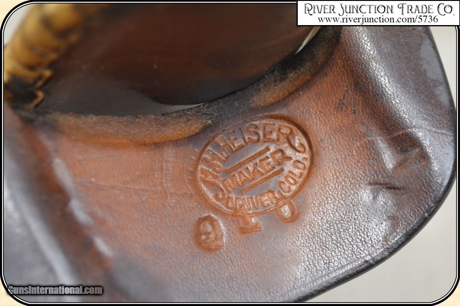 Description: EARLY "H.H. HEISER" HOLSTER This holster takes a 4 3/4 or 5 1/2 inch Colt S.A.A. perfectly. A unique addition suitable for the finest collection. An H. H. Heiser model #910 Double Loop Right Side Holster in very good "daily use" condition. You will notice that the model number has been a re-strike. The original strike was 410. The model 410 was an often seen number. So, what is it about this model that is different? The laced up main seem? I don't think so. It is the leather weight. This holster is a lighter weight that you see on almost all Heiser side holsters. Some one made a special request for lighter weight. The lighter leather is something that would have been requested by a man that wanted to minimize weight for daily use. A man that know what he wants and why. Perhaps a Ranger or a Sheriff? The Hermann H. Heiser Manufacturing made this beautiful Model #910 Double Loop Holster from Premium 5/6 ounce Leather, with the main seam laced to give it an added bit of elegance. This is a handsome Holster properly marked with the H. H. Heiser Denver Colo. with the oval maker's mark logo which would date this holster from 1910 through 1925. You will note it has no safety strap as many Heiser holsters have, giving it the feel and appearance of an early frontier holster. My badge and Colt SAA is not included. Payment: Item, can be ordered on line with a credit card or paypal on our sight. Just Google (riverjunction) and type in the River Junction Trade Co. item number (5736) in the search box. Before you checkout you will see shipping cost and total. OR If you prefer: Pay by cash, postal money order, cashiers check, personal & business checks. We wait for checks to clear. We always answer questions and entertain offers. Have questions? Call me 563-880-4588. Jim SOLD |