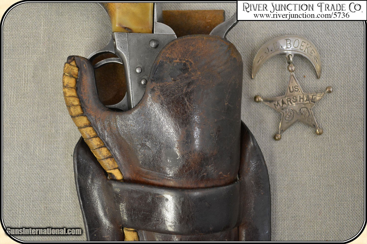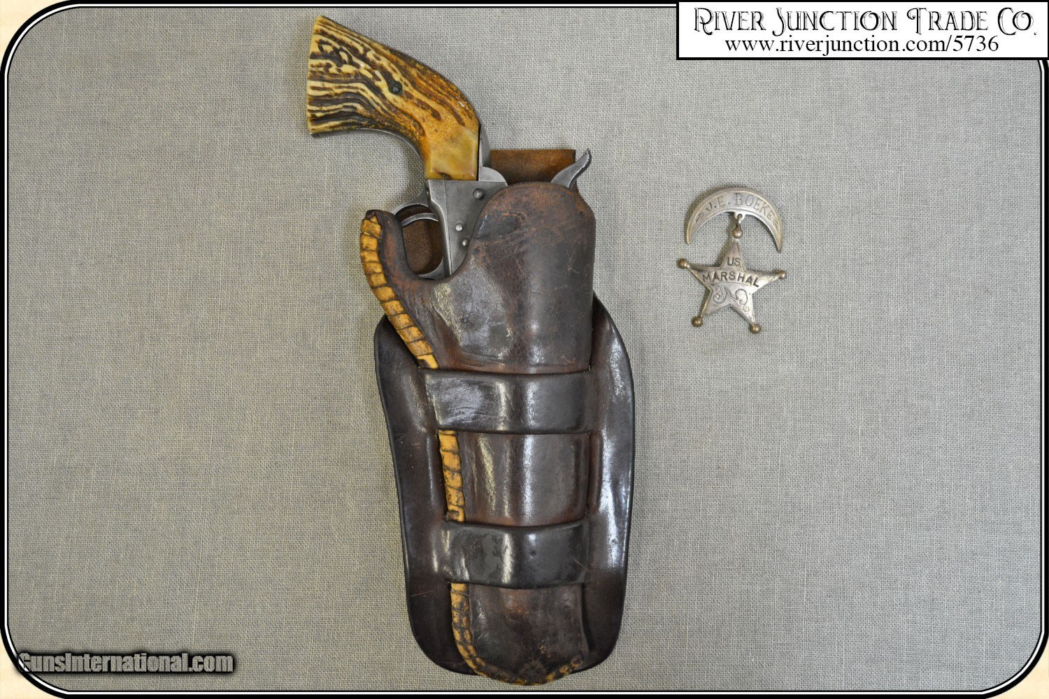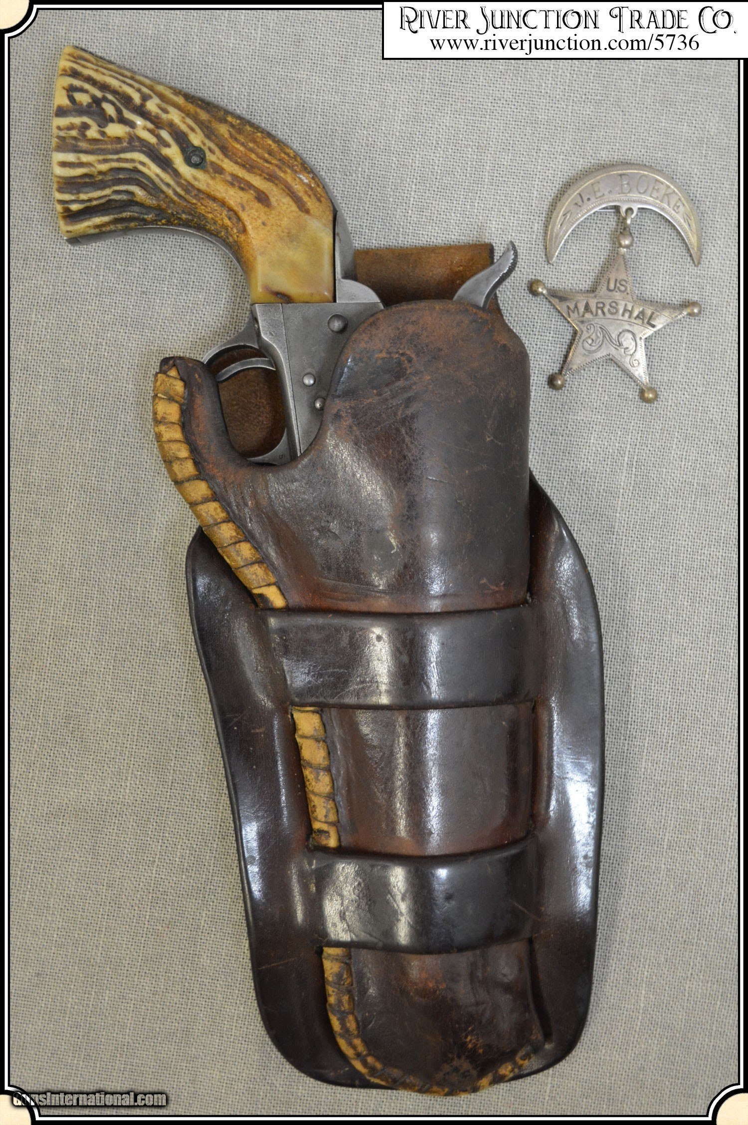 Description: EARLY "H.H. HEISER" HOLSTER This holster takes a 4 3/4 or 5 1/2 inch Colt S.A.A. perfectly. A unique addition suitable for the finest collection. An H. H. Heiser model #910 Double Loop Right Side Holster in very good "daily use" condition. You will notice that the model number has been a re-strike. The original strike was 410. The model 410 was an often seen number. So, what is it about this model that is different? The laced up main seem? I don't think so. It is the leather weight. This holster is a lighter weight that you see on almost all Heiser side holsters. Some one made a special request for lighter weight. The lighter leather is something that would have been requested by a man that wanted to minimize weight for daily use. A man that know what he wants and why. Perhaps a Ranger or a Sheriff? The Hermann H. Heiser Manufacturing made this beautiful Model #910 Double Loop Holster from Premium 5/6 ounce Leather, with the main seam laced to give it an added bit of elegance. This is a handsome Holster properly marked with the H. H. Heiser Denver Colo. with the oval maker's mark logo which would date this holster from 1910 through 1925. You will note it has no safety strap as many Heiser holsters have, giving it the feel and appearance of an early frontier holster. My badge and Colt SAA is not included. Payment: Item, can be ordered on line with a credit card or paypal on our sight. Just Google (riverjunction) and type in the River Junction Trade Co. item number (5736) in the search box. Before you checkout you will see shipping cost and total. OR If you prefer: Pay by cash, postal money order, cashiers check, personal & business checks. We wait for checks to clear. We always answer questions and entertain offers. Have questions? Call me 563-880-4588. Jim SOLD |