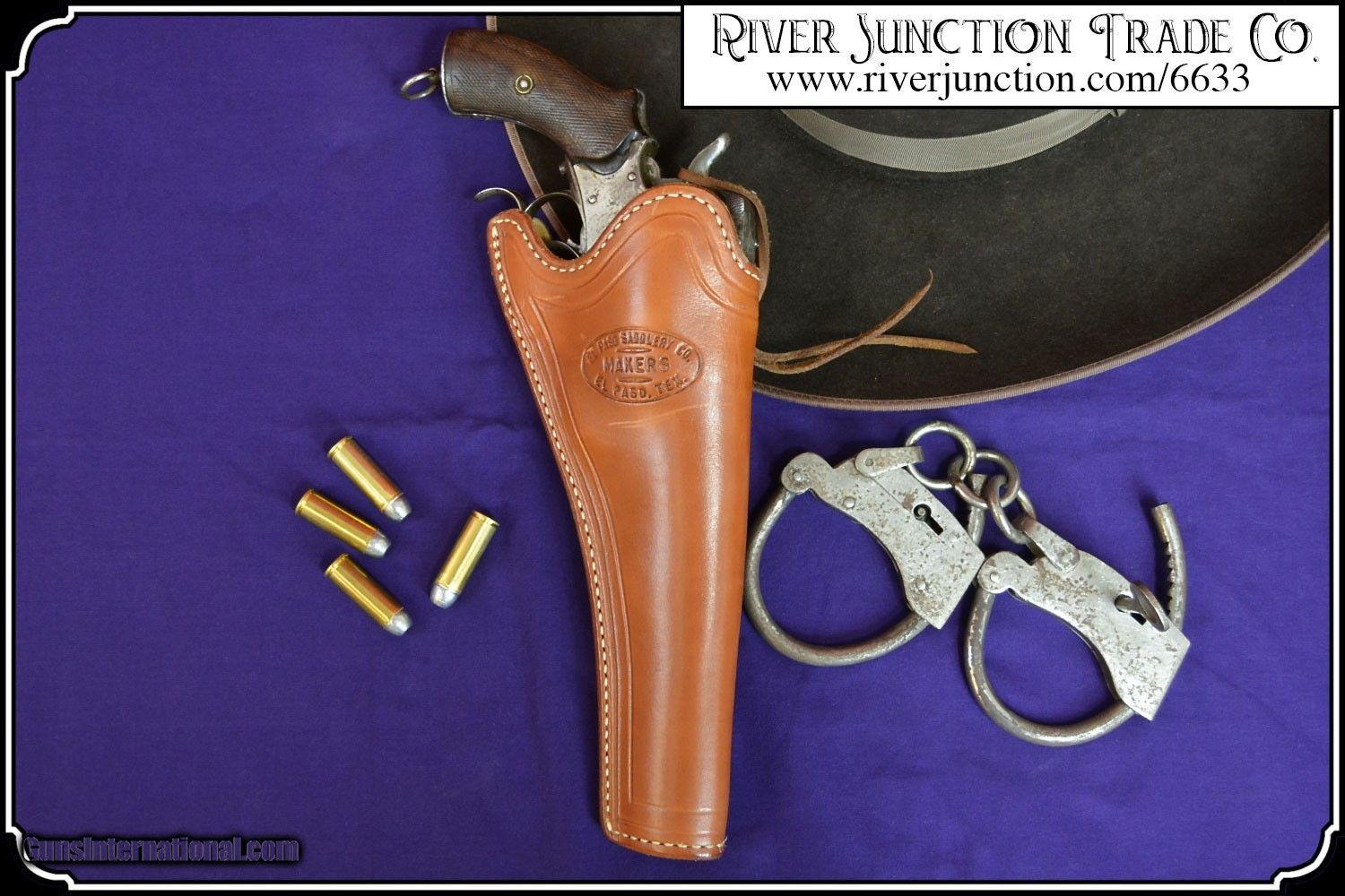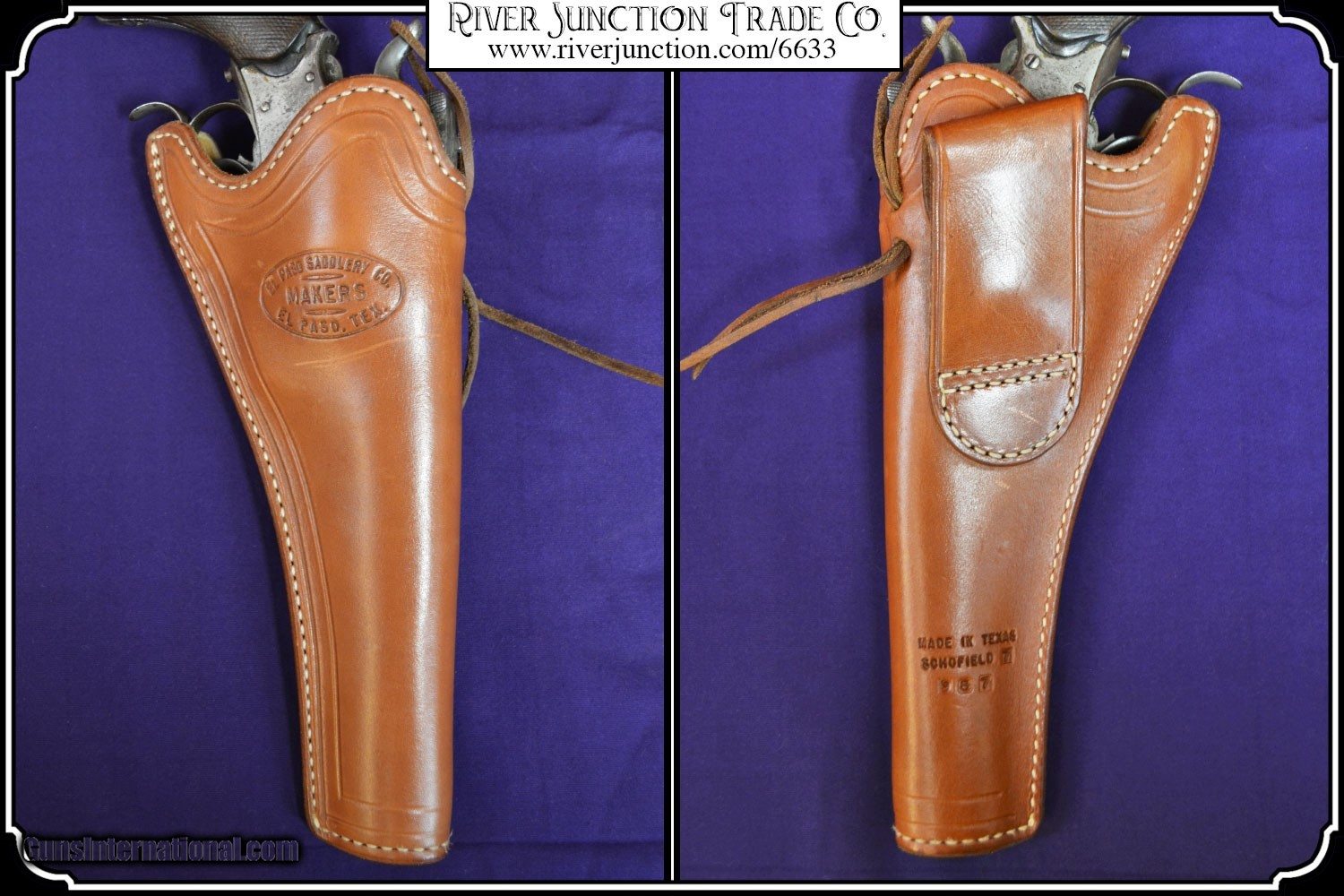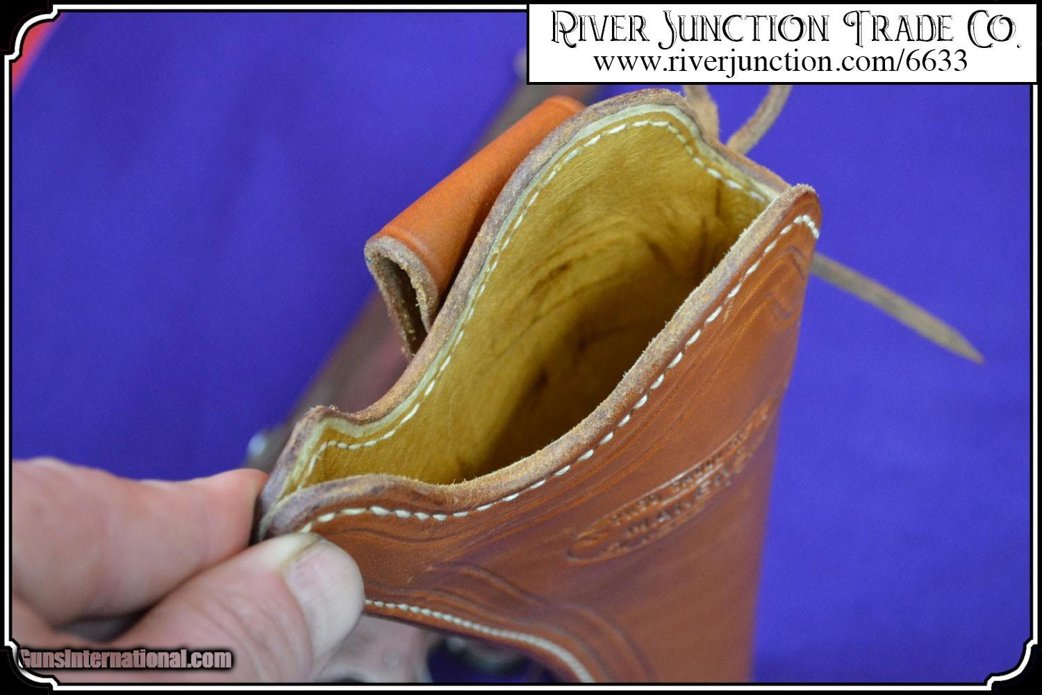 Description: This holster was manufactured by El Paso Saddlrey Co. In El Paso Tex. This slim jim holster was shop made and beautifull finished and stamped with the makers mark. The main seam is sewn and all stitching is tight. and it is fully lined. The workmanship is excellent, and equal to that of shops like Heiser and others. of the old west. This holster will fit a large assortment of long barreled revolvers. I am showing it here with a Belguim Copy of the Smith & Wesson Russian 7 1/2 inch barrel and it is a perfect fit. I am also showing it with a selection of Smith & Wesson Reproductions. It would be ideal for a S&W American with it's 8 inch barrel and if you have one of these you know how hard it is to find a holster for it. Also shown the Copy of the S&W Schofield, The Russian, and the New Model 3 Russian.. My Belguim Copy is not included. Payment: Item, can be ordered on line with a credit card or paypal on our sight. Just Google (riverjunction) and type in the River Junction Trade Co. item number (6633) in the search box. Before you checkout you will see shipping cost and total. OR If you prefer: Pay by cash, postal money order, cashiers check, personal & business checks. We wait for checks to clear. We always answer questions and entertain offers. Have questions? Call me 563-880-4588. Jim SOLD |