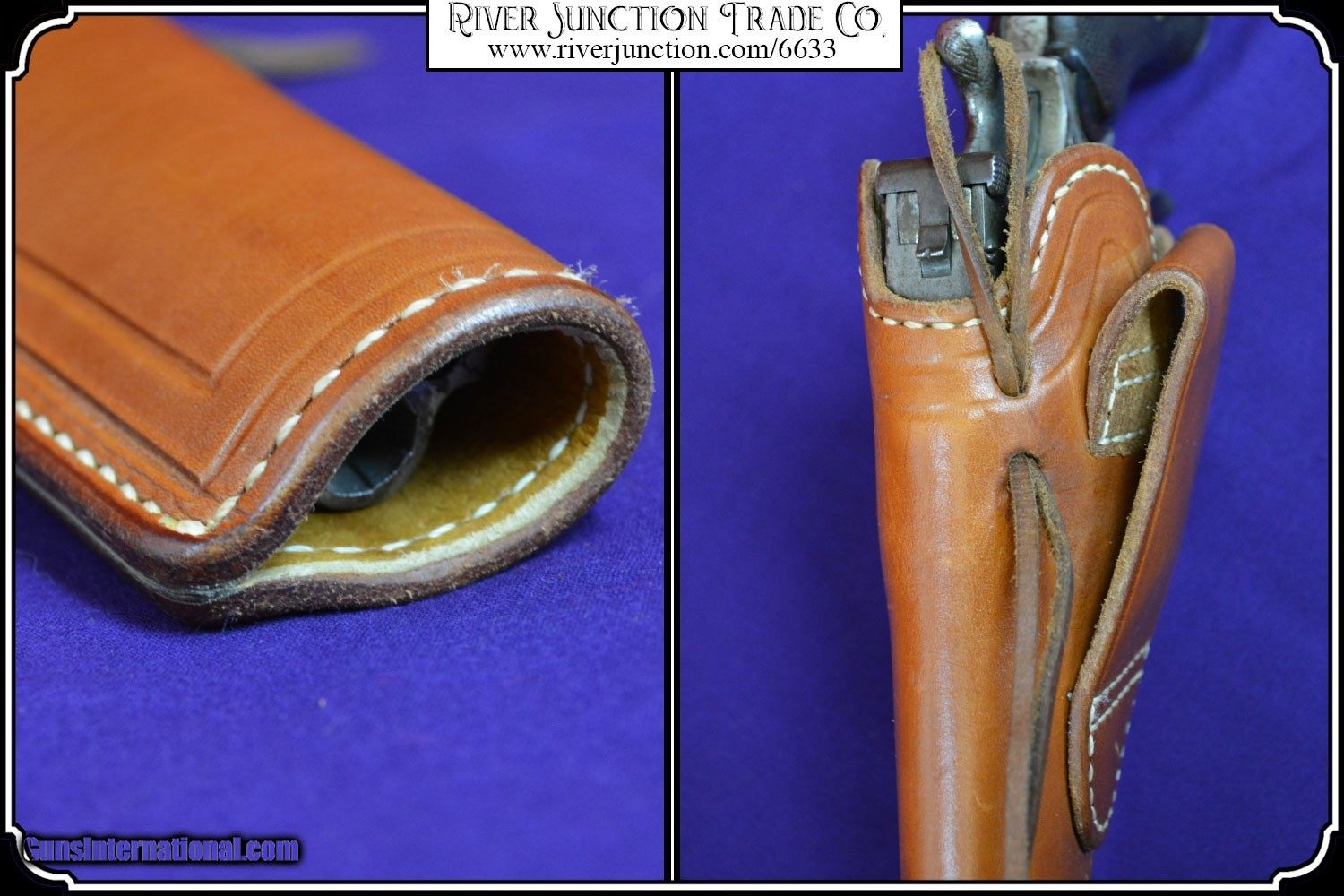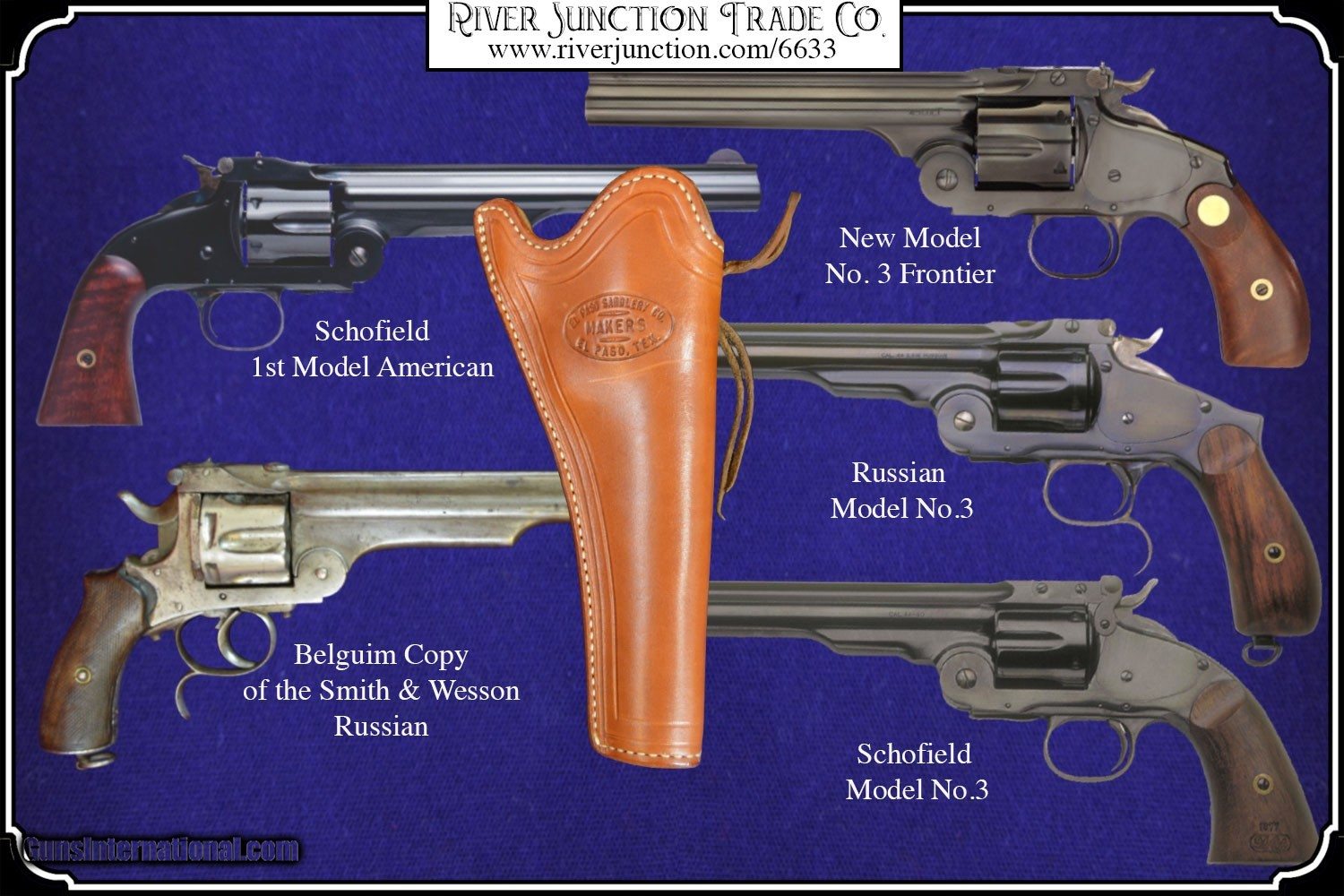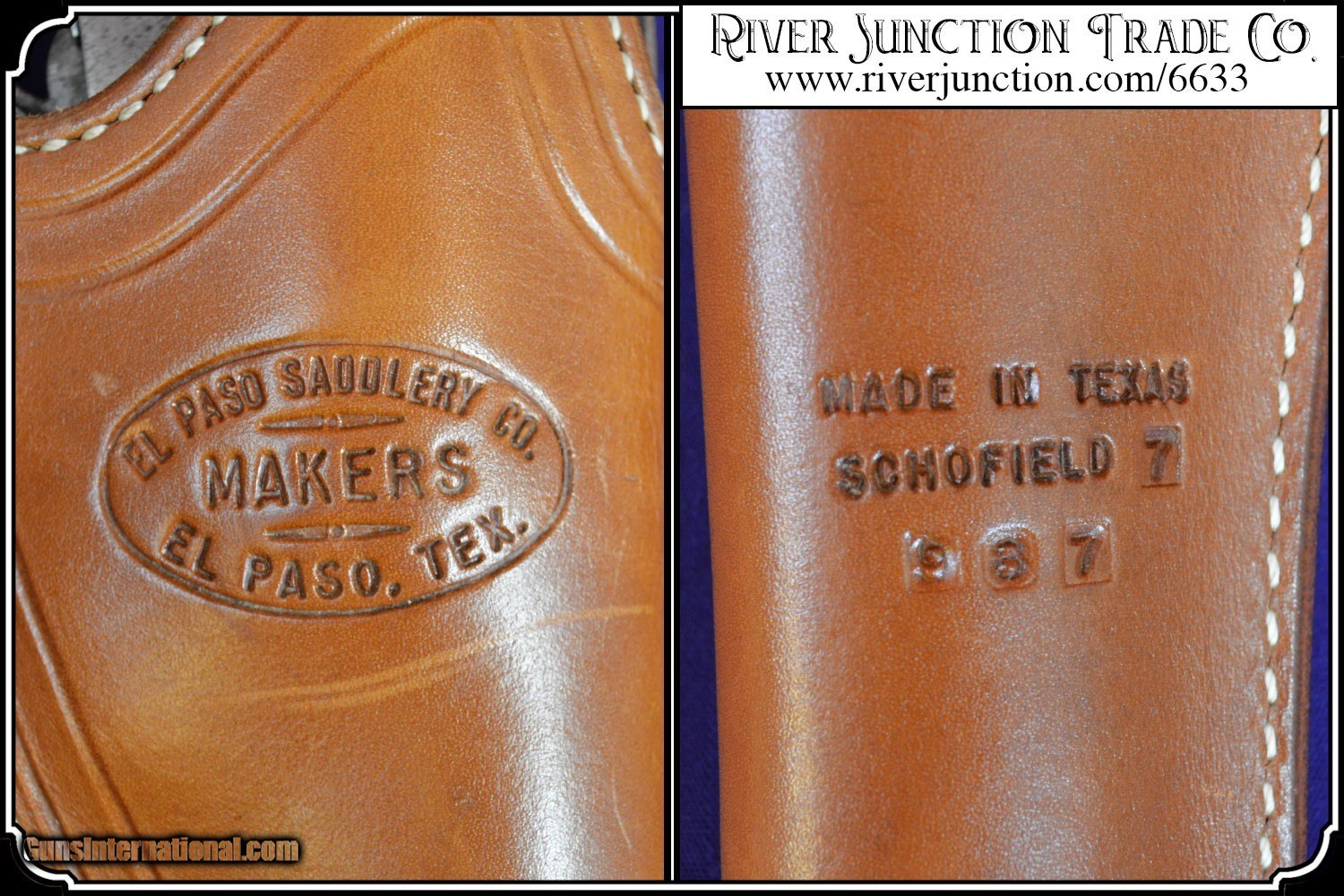Description: This holster was manufactured by El Paso Saddlrey Co. In El Paso Tex. This slim jim holster was shop made and beautifull finished and stamped with the makers mark. The main seam is sewn and all stitching is tight. and it is fully lined. The workmanship is excellent, and equal to that of shops like Heiser and others. of the old west. This holster will fit a large assortment of long barreled revolvers. I am showing it here with a Belguim Copy of the Smith & Wesson Russian 7 1/2 inch barrel and it is a perfect fit. I am also showing it with a selection of Smith & Wesson Reproductions. It would be ideal for a S&W American with it's 8 inch barrel and if you have one of these you know how hard it is to find a holster for it. Also shown the Copy of the S&W Schofield, The Russian, and the New Model 3 Russian.. My Belguim Copy is not included. Payment: Item, can be ordered on line with a credit card or paypal on our sight. Just Google (riverjunction) and type in the River Junction Trade Co. item number (6633) in the search box. Before you checkout you will see shipping cost and total. OR If you prefer: Pay by cash, postal money order, cashiers check, personal & business checks. We wait for checks to clear. We always answer questions and entertain offers. Have questions? Call me 563-880-4588. Jim SOLD |