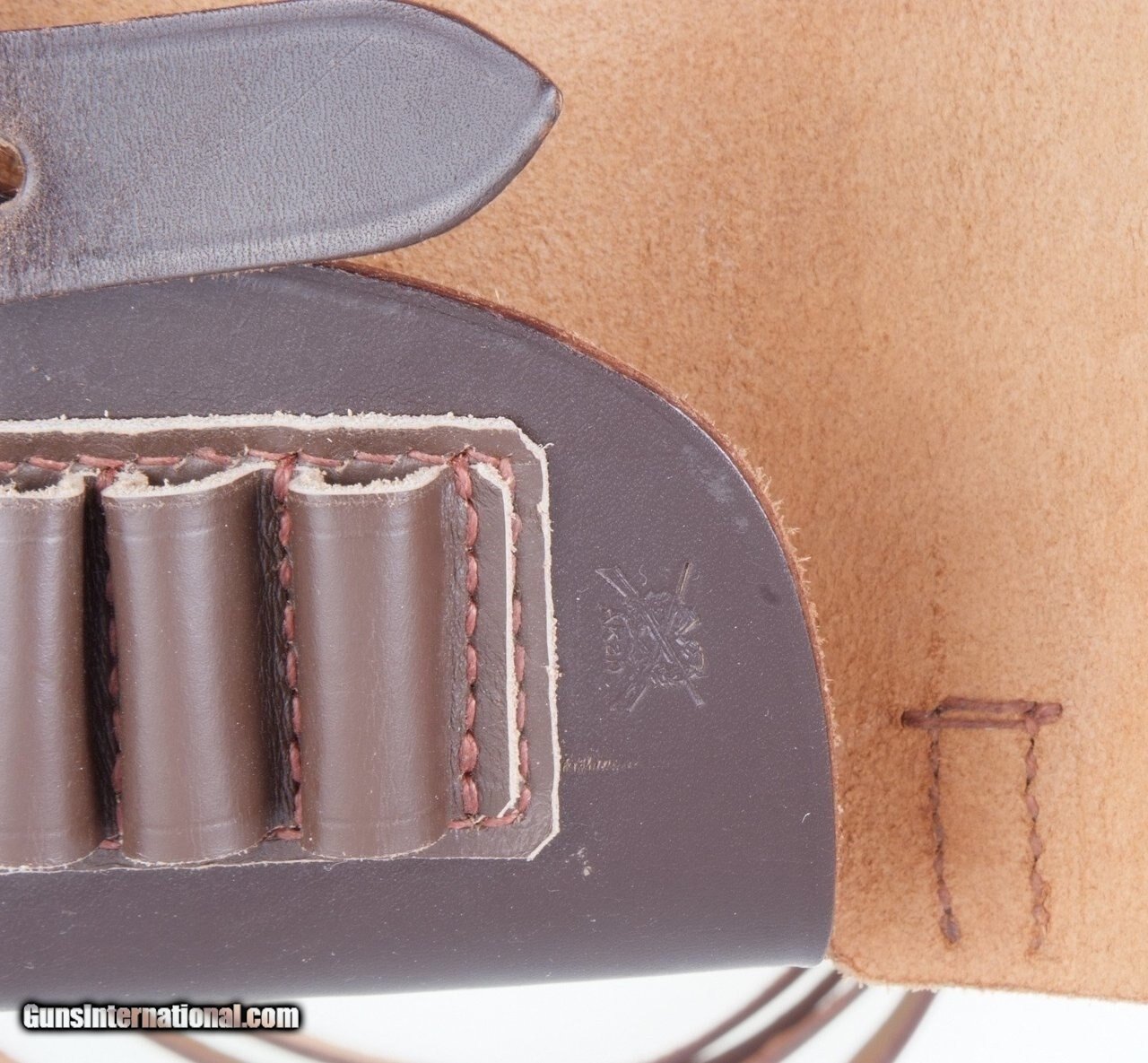 Description: Description: Front surface with strip for twelve cartridges. Studded flap closure. Top carry handle. Obverse surface with two shoulder strap loops for included strap. Synopsis: Unusual chocolate brown Akah marked holster, measuring 14.25 long (lid closed); 6.5” wide, with reddish stitching. Condition: Extraordinary near new condition. An extremely rare Akah marked holster, well suited for the most advanced collection. A HISTORIC INVESTMENT! SOLD |