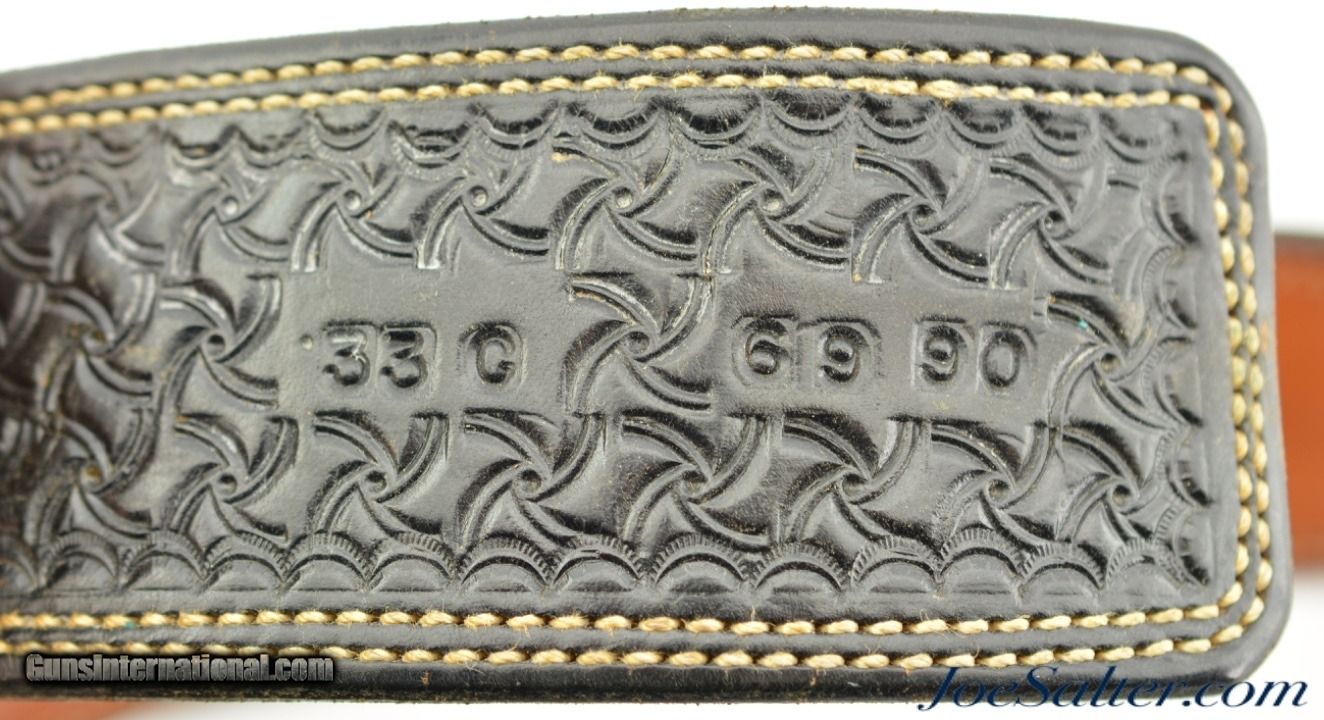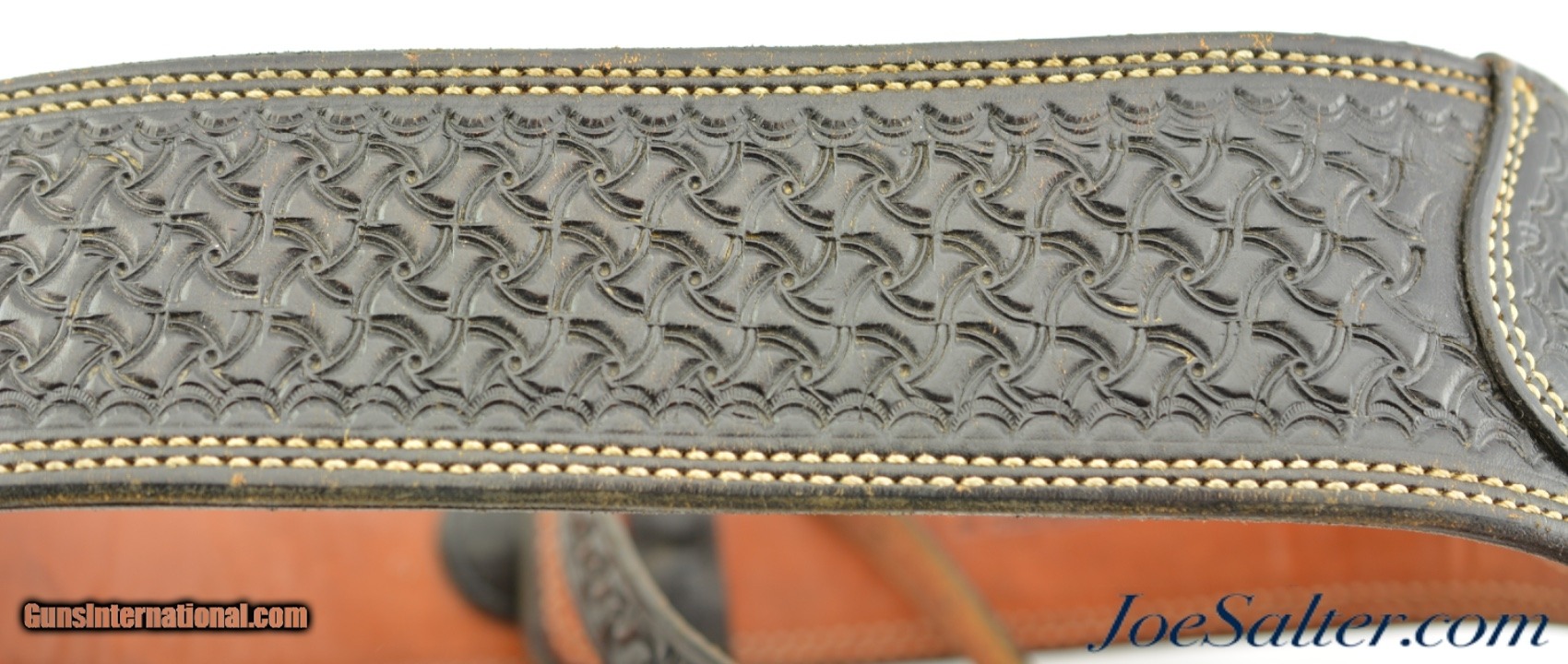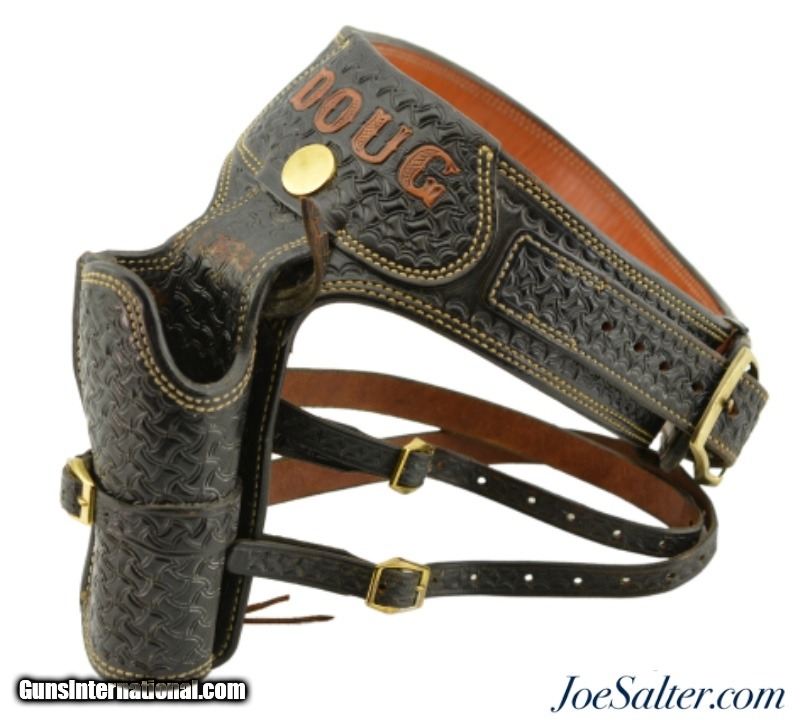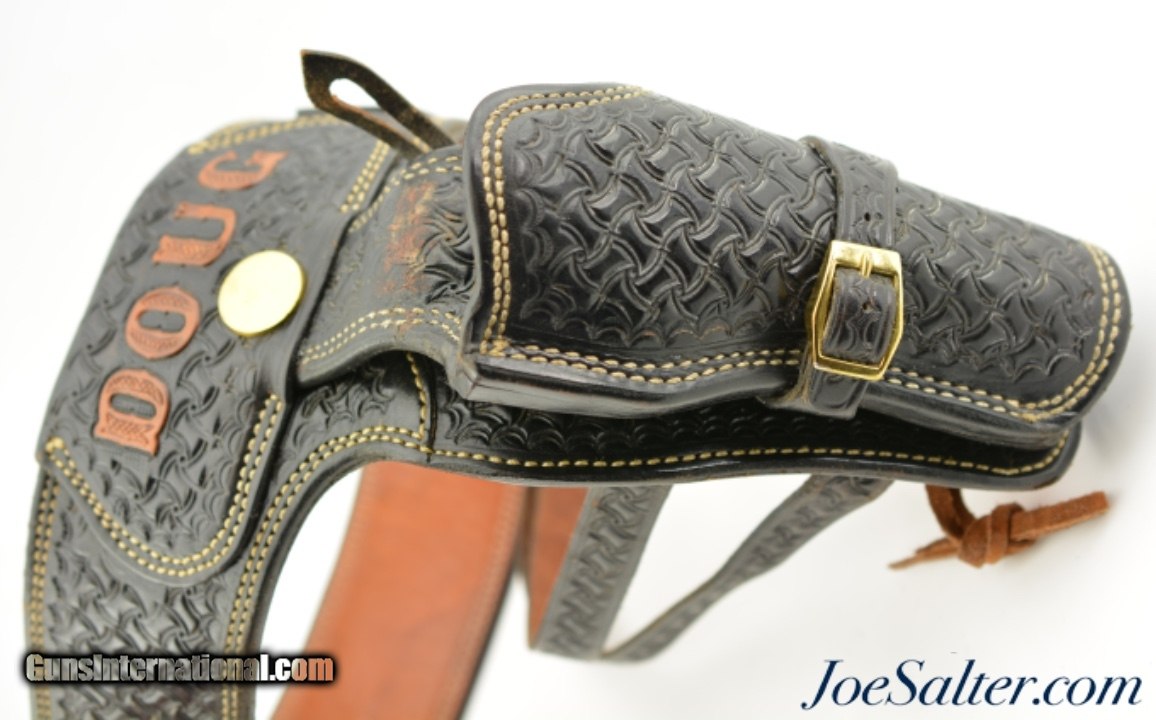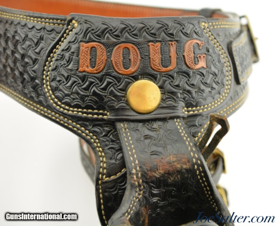 Description: This is a Alfonso's of Hollywood fast draw rig with one holster. This black and tan colored right hand rig with Ranger style brass buckle measures 35" overall with double stitched border and carved basket weave pattern on belt and rig. The slightly reverse canted holster has double leg straps with brass colored buckles and simple leg thong is likely for a Vaquero style revolver with barrel up to 5 1/2" in length. The name "Doug" is tooled in brown on the belt and the rig shows only slight wear along select edges and some light wear inside the holster one would expect from use, with maker marks on both belt and holster. A fine example of this craftsman’s work. Price: $295.00 Contact Seller |