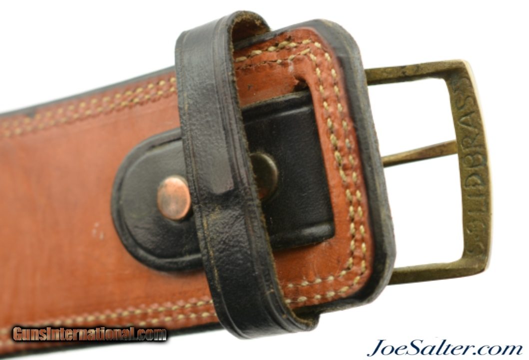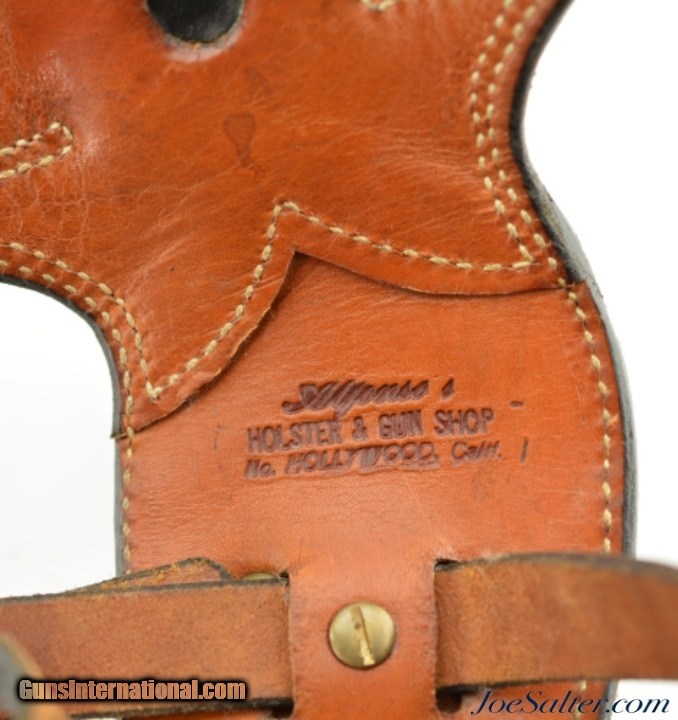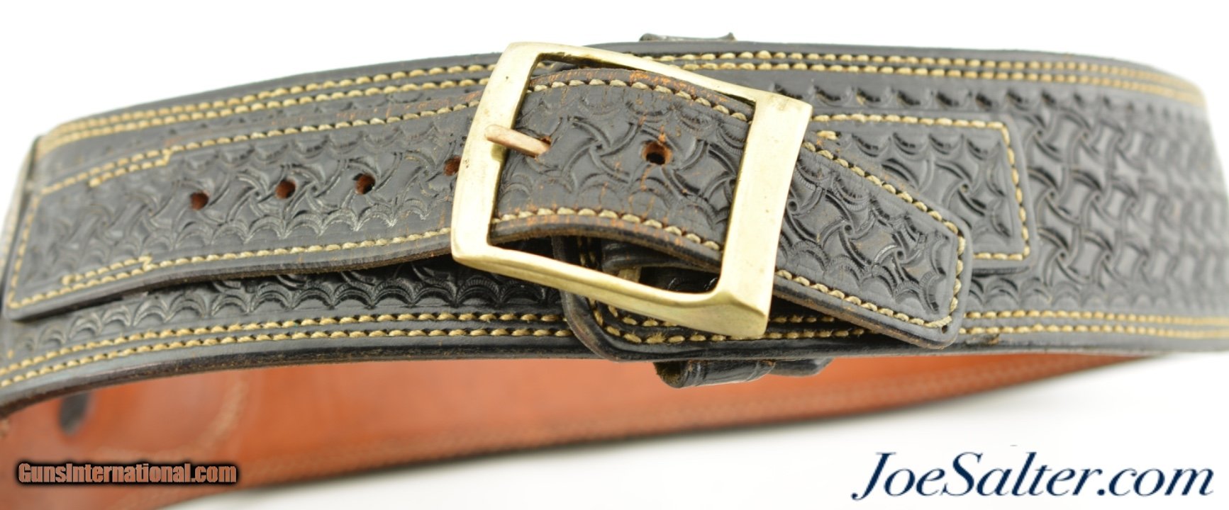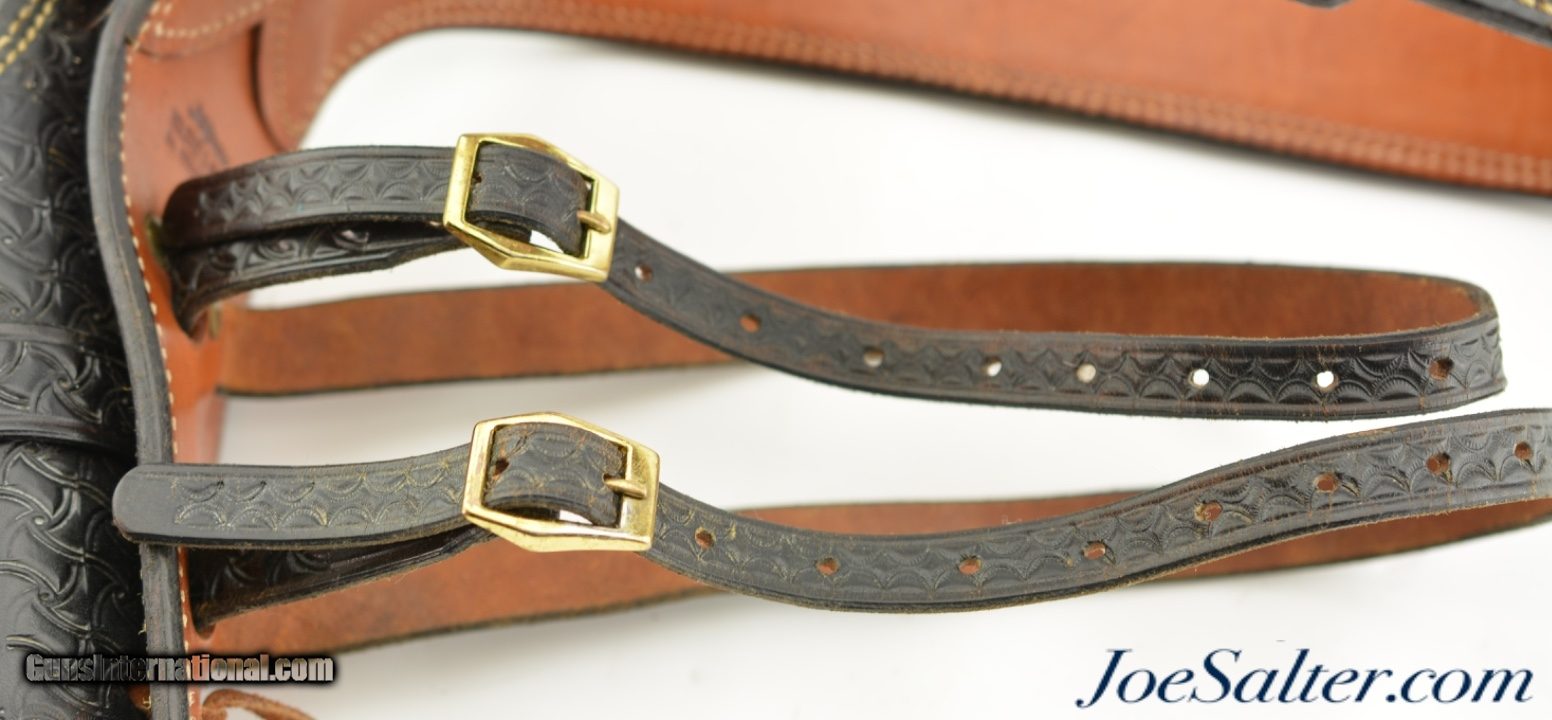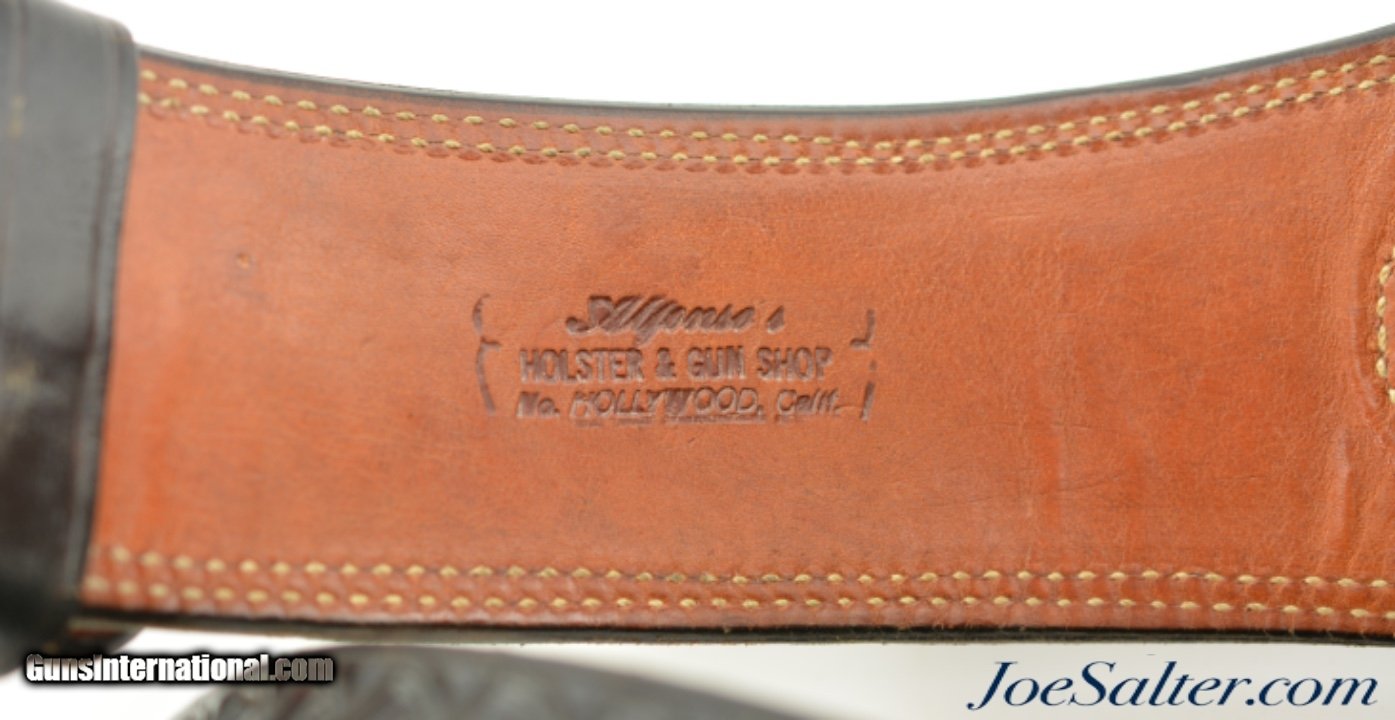 Description: This is a Alfonso's of Hollywood fast draw rig with one holster. This black and tan colored right hand rig with Ranger style brass buckle measures 35" overall with double stitched border and carved basket weave pattern on belt and rig. The slightly reverse canted holster has double leg straps with brass colored buckles and simple leg thong is likely for a Vaquero style revolver with barrel up to 5 1/2" in length. The name "Doug" is tooled in brown on the belt and the rig shows only slight wear along select edges and some light wear inside the holster one would expect from use, with maker marks on both belt and holster. A fine example of this craftsman’s work. Price: $295.00 Contact Seller |