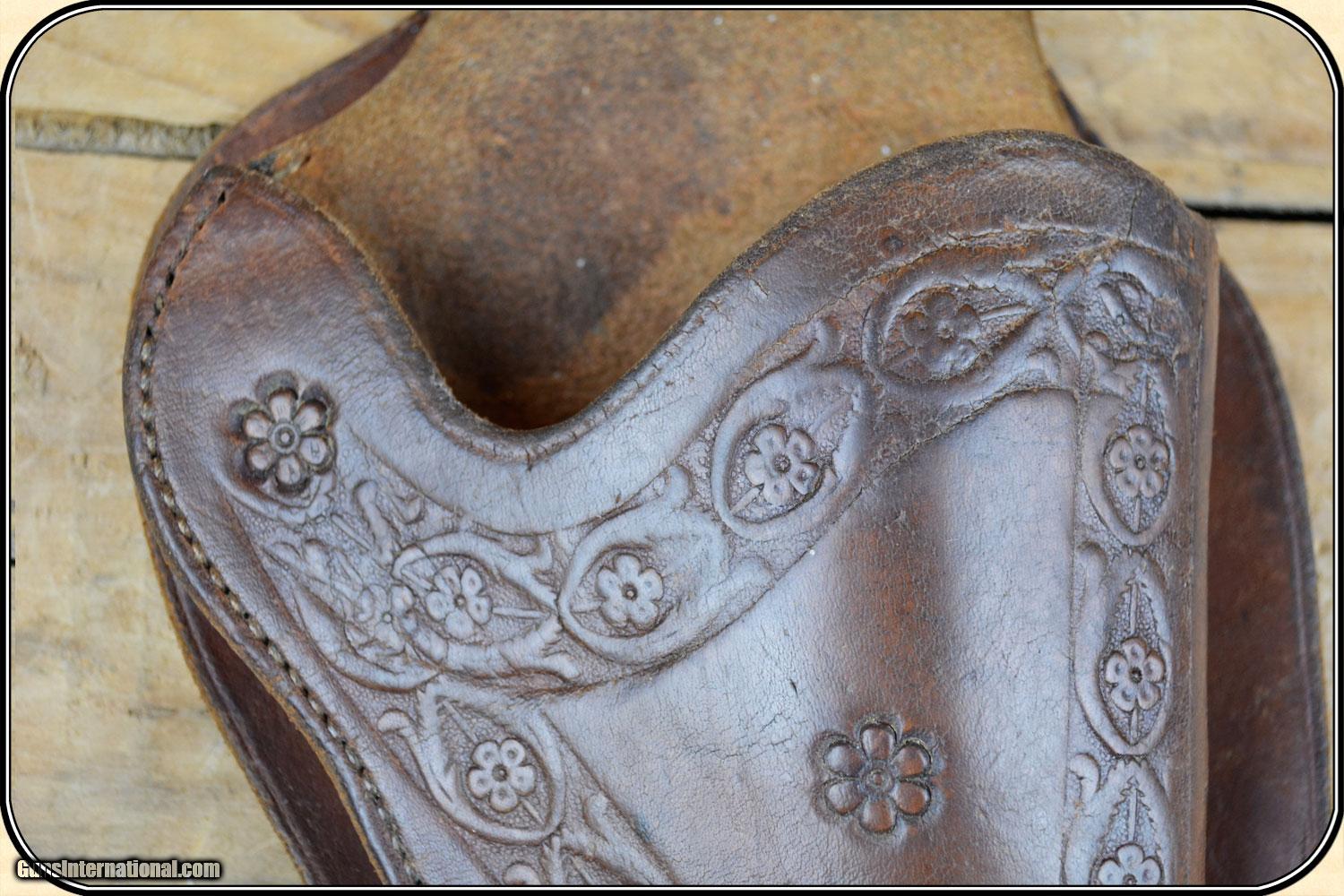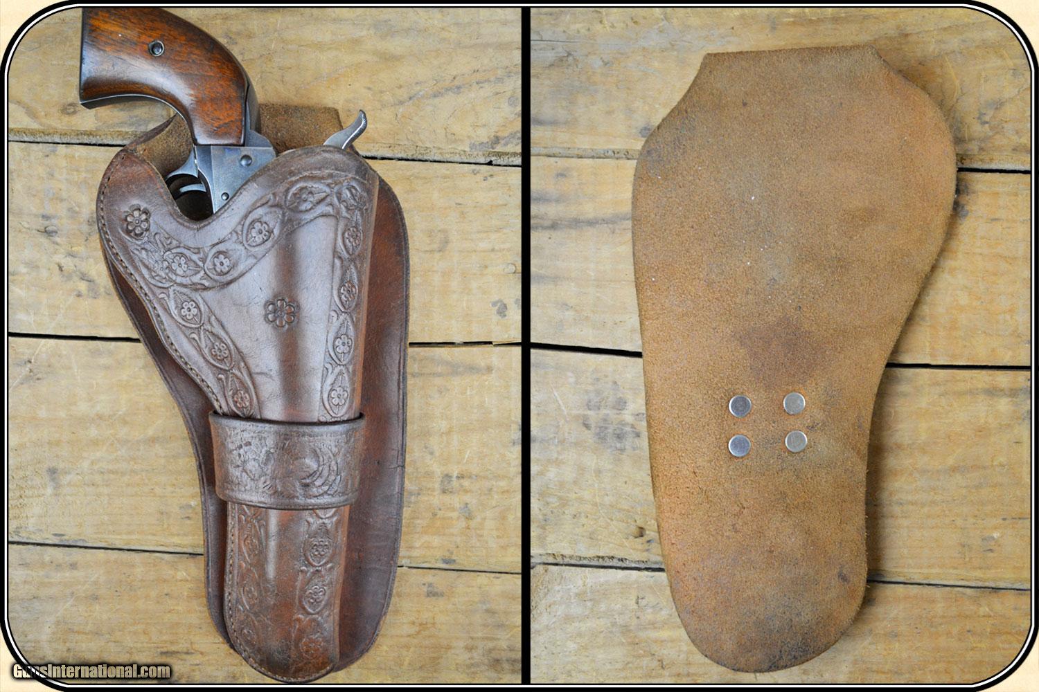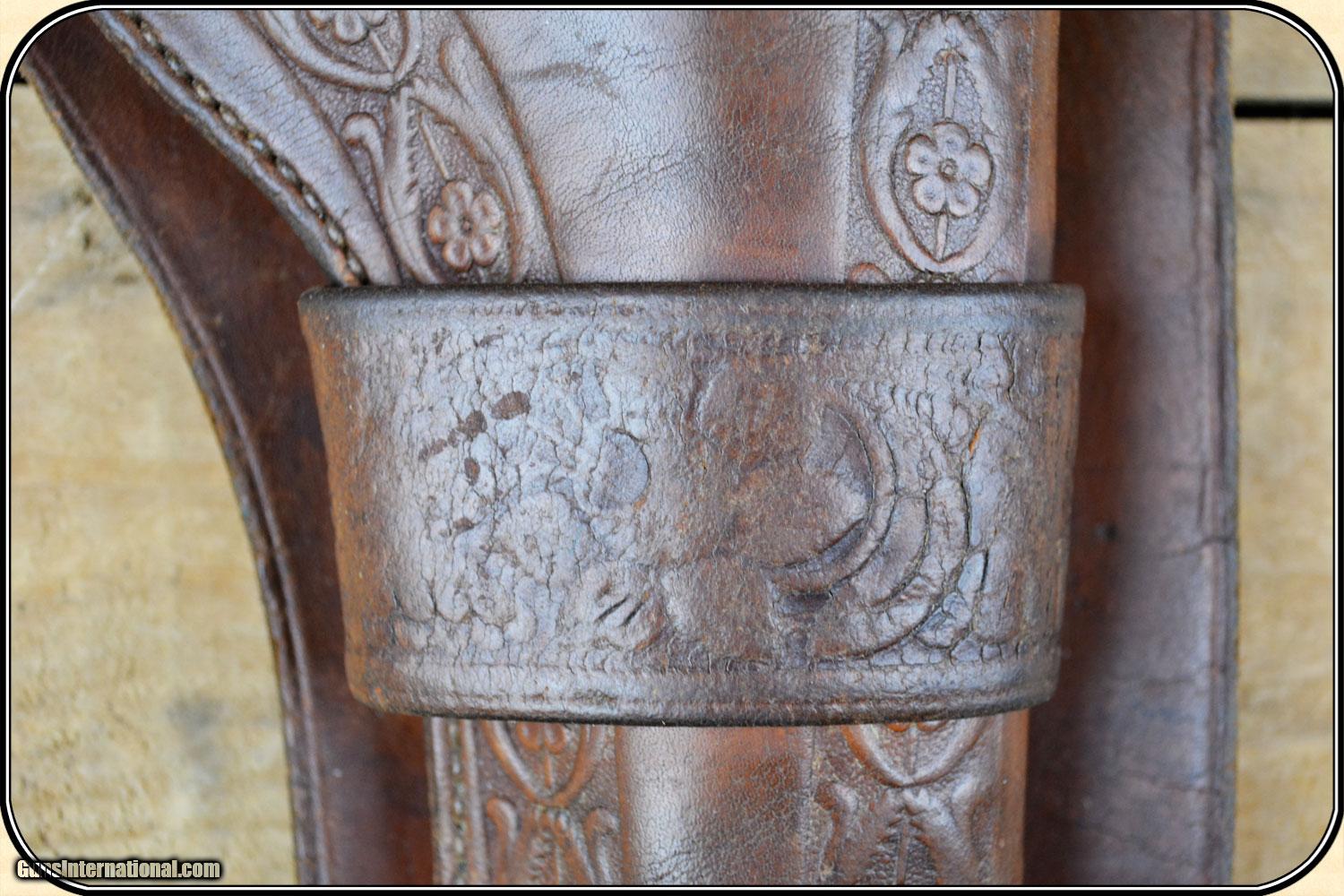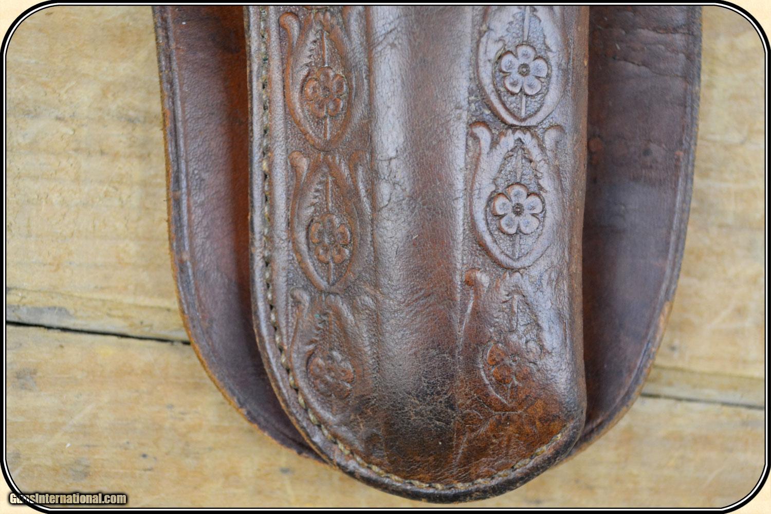 Description: This holster was offer by catalog houses in the late 19th century. A wonderfully boarder rolled holster in a single applied loop style. The holster maker is unknown, but was very well executed. It is a floral bordered holster with a sewn closed toe. This holster fits a 4 3/4, 5 1/2 or 6 inch barreled, Frontier big bore revolvers, such as the Colt SAA, Smith & Wesson Double Action Frontier or Merwin Hulbert. It is of high quality. This right hand holster is made of russet colored leather. The piece has a gracefully re-curved throat profile. The main seam is sewn and all stitches are tight. Has very nice age patina with no cracks, rips or tear. Will provide many years of service or just use it for display as I did. My Frontier revolvers are not included. PAYMENT Cash, postal money order, cashiers check, personal & business checks. May order at riverjucntion on-line with credit card. SOLD |