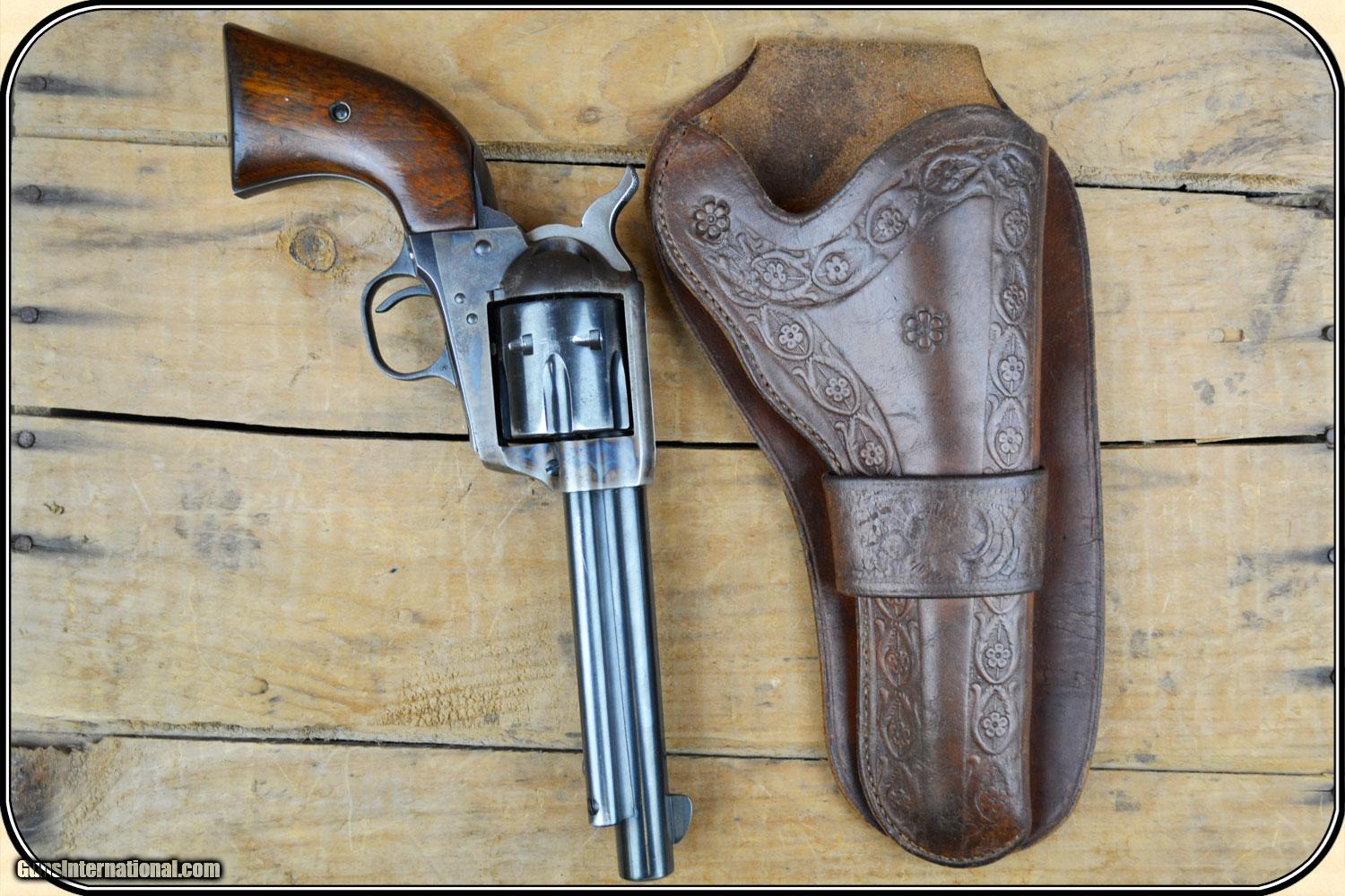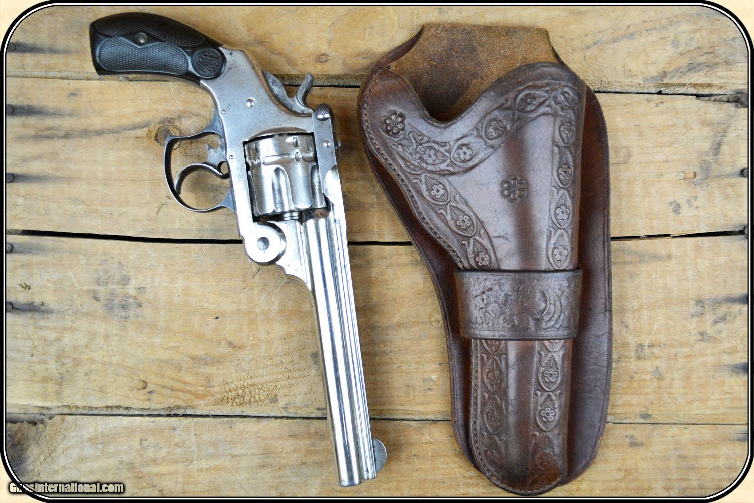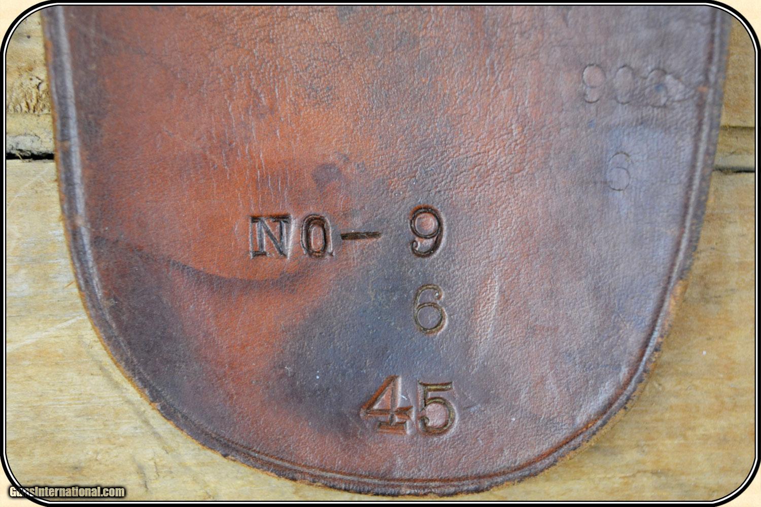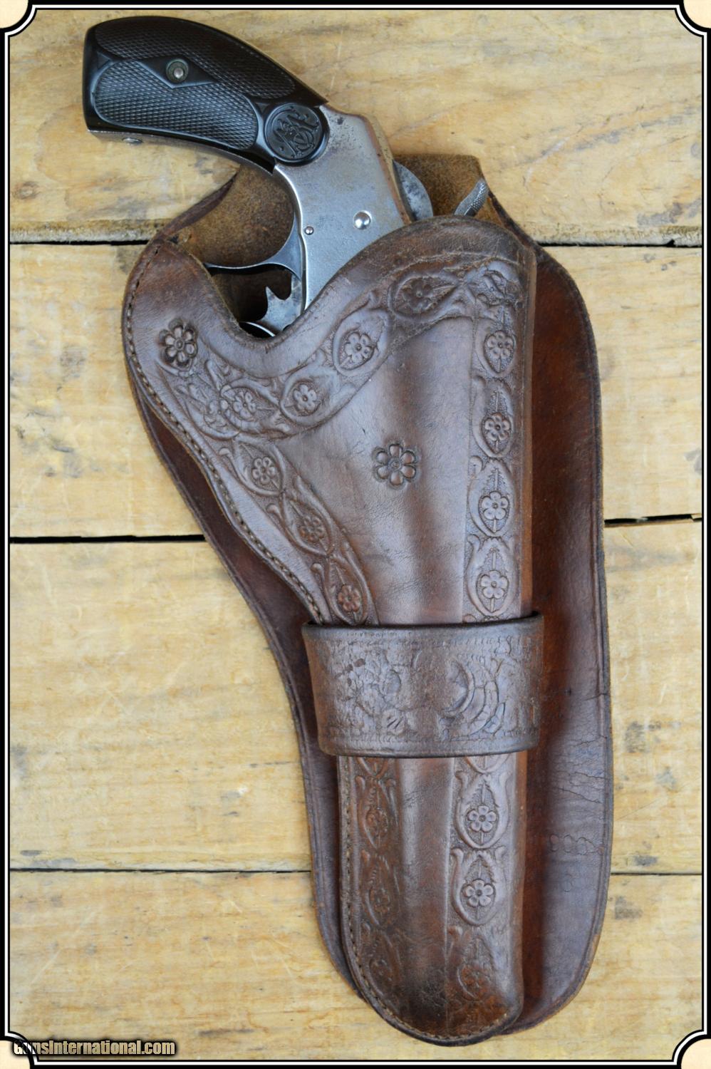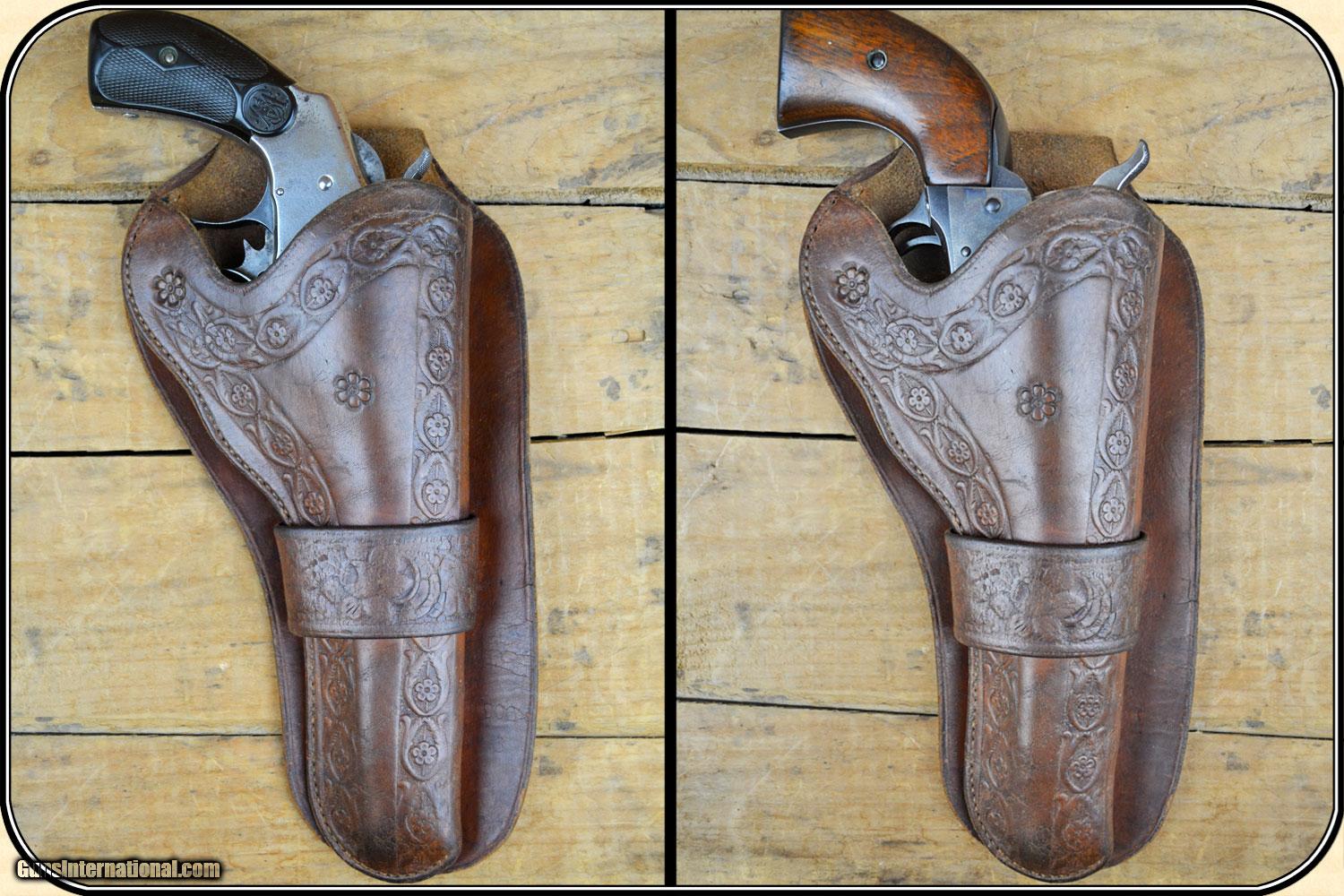 Description: This holster was offer by catalog houses in the late 19th century. A wonderfully boarder rolled holster in a single applied loop style. The holster maker is unknown, but was very well executed. It is a floral bordered holster with a sewn closed toe. This holster fits a 4 3/4, 5 1/2 or 6 inch barreled, Frontier big bore revolvers, such as the Colt SAA, Smith & Wesson Double Action Frontier or Merwin Hulbert. It is of high quality. This right hand holster is made of russet colored leather. The piece has a gracefully re-curved throat profile. The main seam is sewn and all stitches are tight. Has very nice age patina with no cracks, rips or tear. Will provide many years of service or just use it for display as I did. My Frontier revolvers are not included. PAYMENT Cash, postal money order, cashiers check, personal & business checks. May order at riverjucntion on-line with credit card. SOLD |