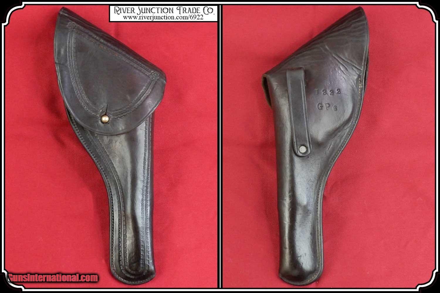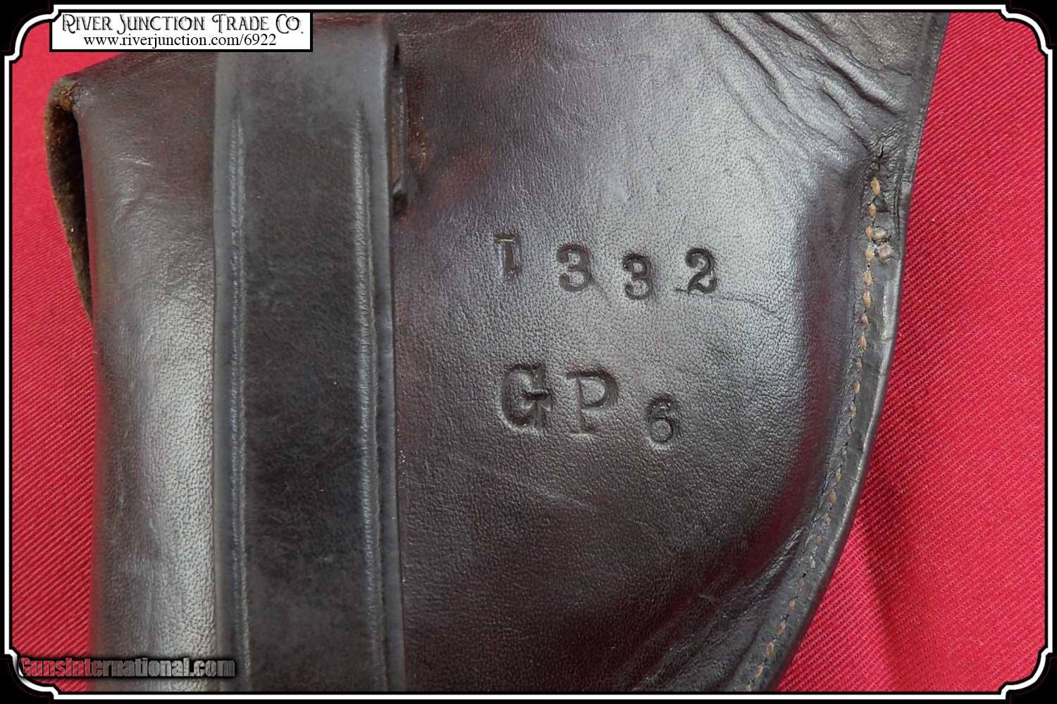 Description: This is a nice antique leather holster with an 8 1/2 inches long pouch and 4 1/4 inches wide at the throat. It is in very good condition, soft and flexible and has been well cared for. The leather is in good pliable condition and the holster itself seems not to have been used much. Nice for the collector, or reenactor. This is a old western full flap style holster. Marked "G P 6" and the model number "1332". It is a perfect fit for a Colt Lighting, a Cimarron Lightning a Colt Scout a Belgium copy of Colt Lightning, Merwin Hulber mid frame size with a 6 inch barrel or shorter. The leather is in good shape and has a century of use in it yet. The guns show are not included. Price: $199.95 Buy Now Contact Seller |