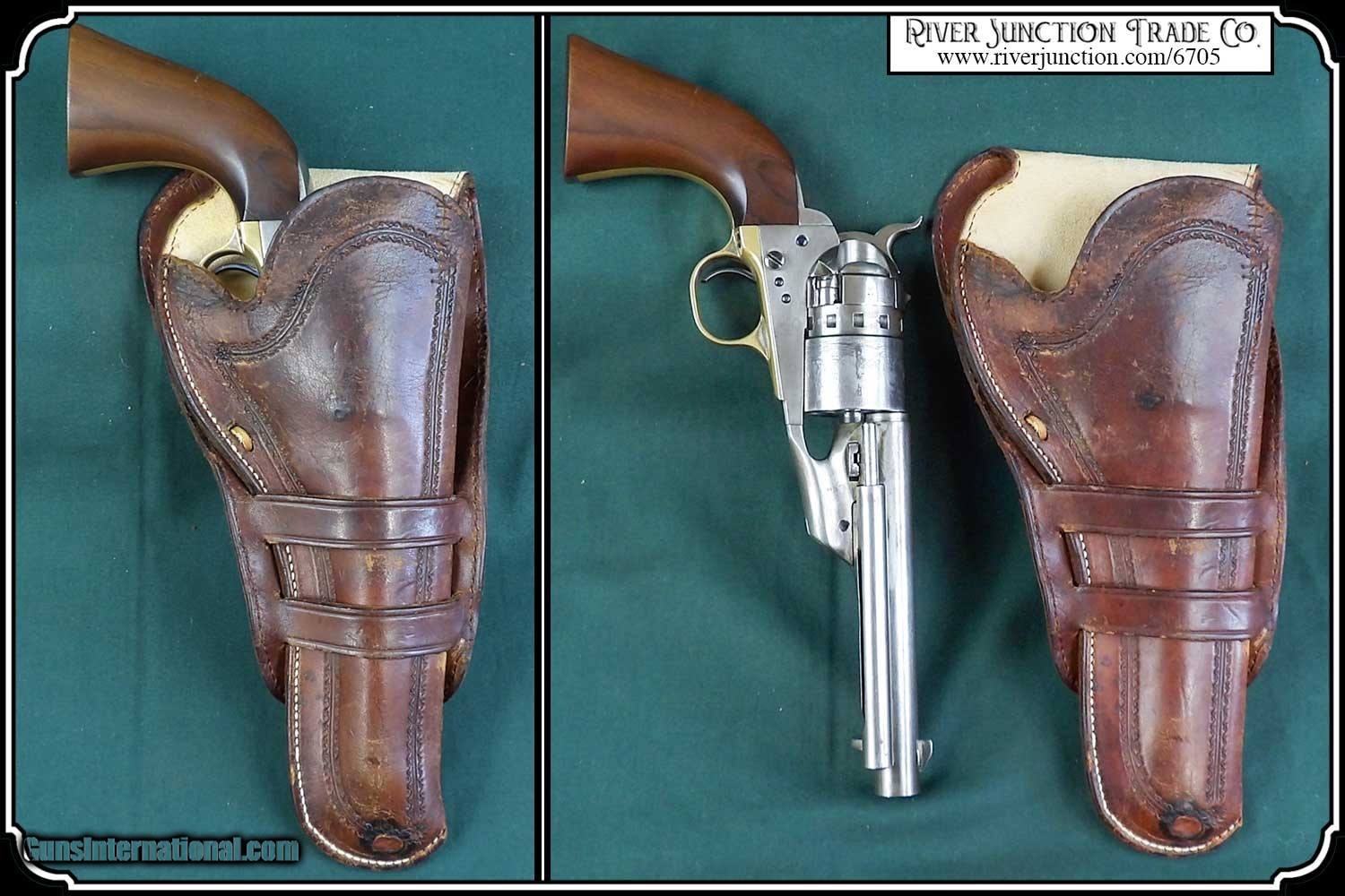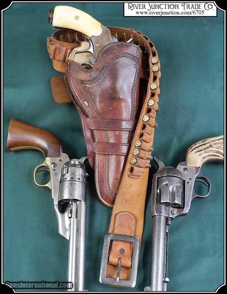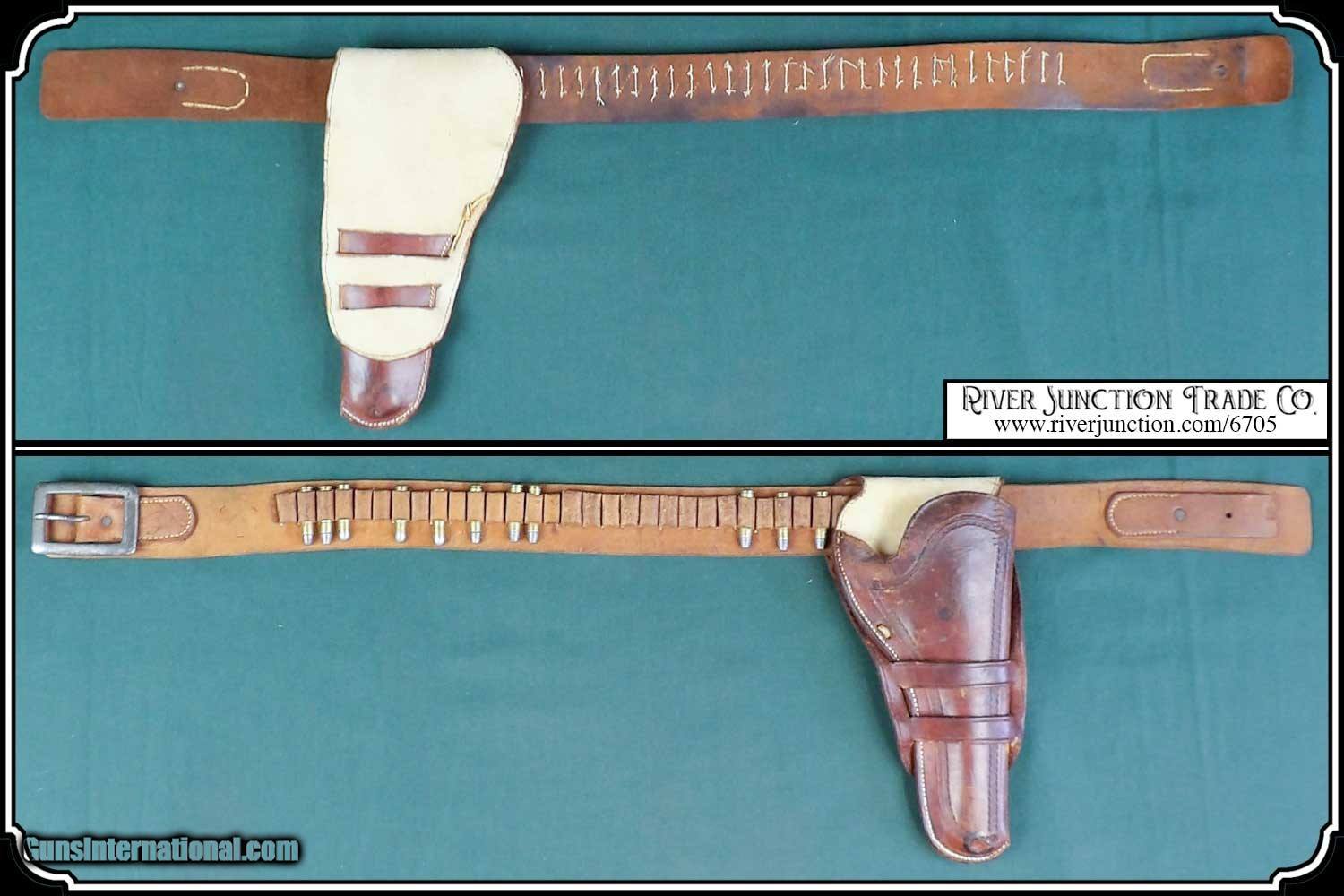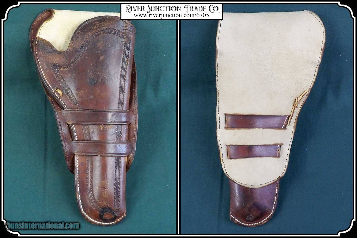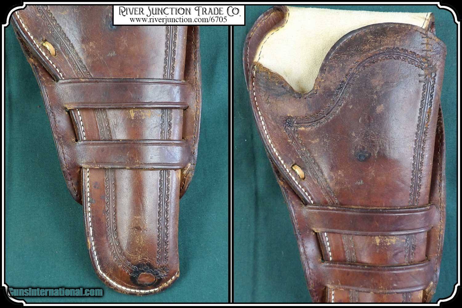Description: Original Holster 1880 to1890. Civilian holster and belt from the Old West era. This classic rig with roller stamped border makes for a most attractive outfit. This holster was a popular civilian style of the 80's and 90's. and beyond. Double loop style with its typical sewn closed toe. Made of medium weight russet colored leather and fully lined. This holster could be worn as right hand draw or cross draw. The leather is soft and pliable. It would be perfect for displaying with your original vintage Colt or you could just use it. All the stitches are strong and intact. A very nice, hard to find holster and belt for a 5 1/2 barreled Colt and others as in this case it holds my old Colt 1873 SAA. This holster is in very good condition no breaks or tears and the belt is likewise. Nice for the collector to show off his vintage Colt six gun or S&W Frontier. It is a perfect fit for my 5 1/2 in. barrel Colt SAA but would service equally as well for a Colt Bisley 4 3/4", 5 1/2", a Colt 1878 D.A., or a S&W D.A. or S.A. Frontier 6". To find one in good condition is a rarity. There are no loose or missing stitching. My Old six shooter and other Items are not included. Payment: Item, can be ordered on line with a credit card or paypal on our sight. Just Google (riverjunction) and type in the River Junction Trade Co. item number (6705) in the search box. Before you checkout you will see shipping cost and total. OR If you prefer: Pay by cash, postal money order, cashiers check, personal & business checks. We wait for checks to clear. We always answer questions and entertain offers. Have questions? Call me 563-880-4588. Jim SOLD |