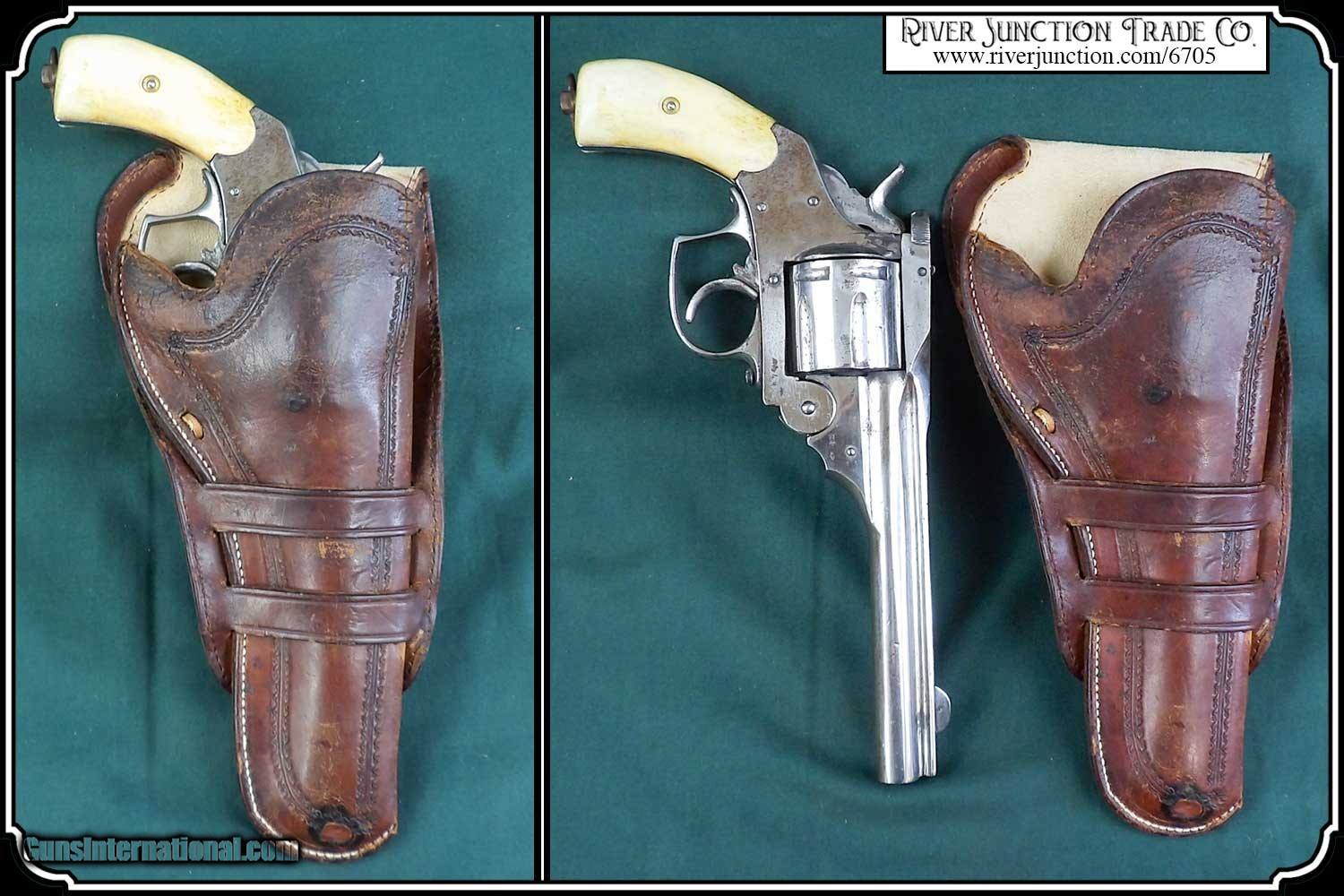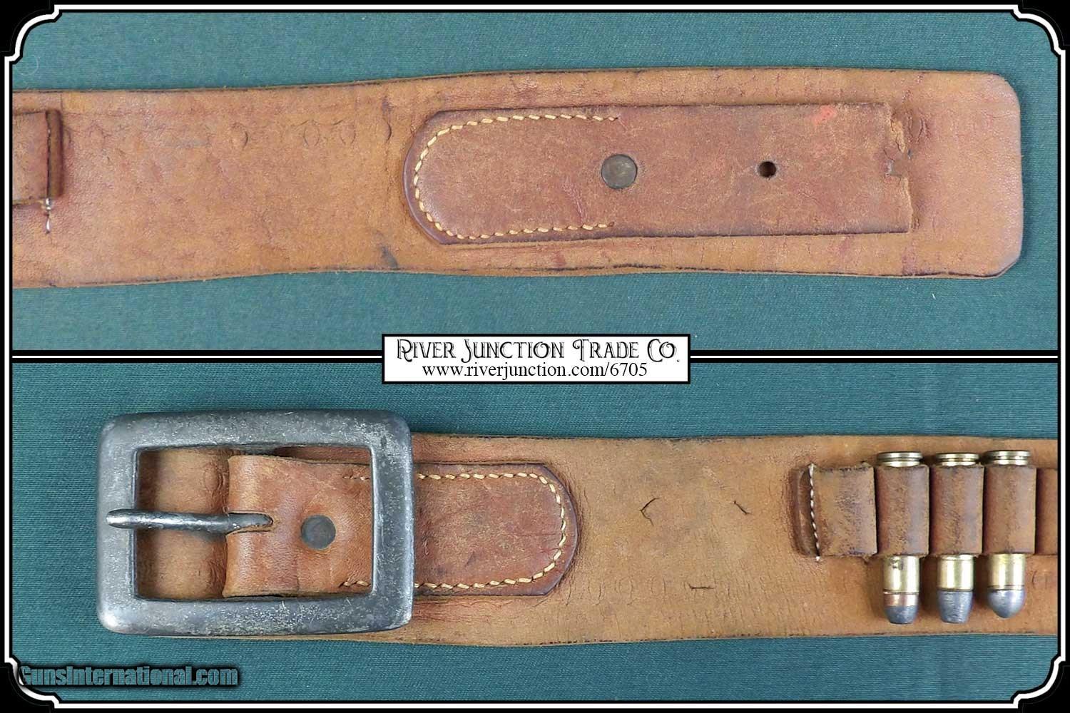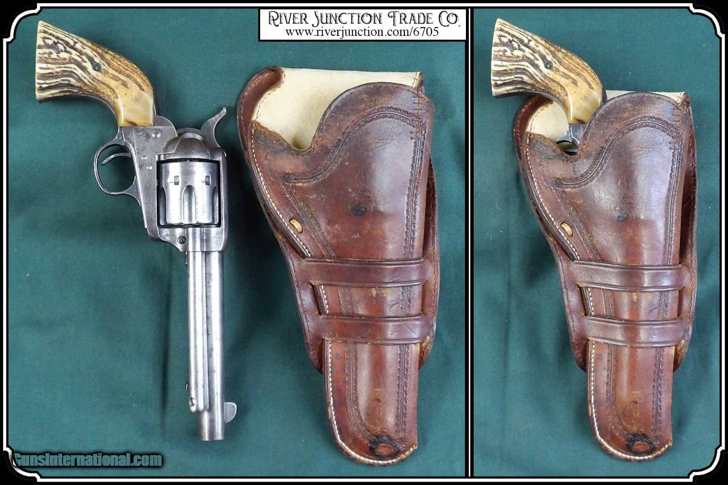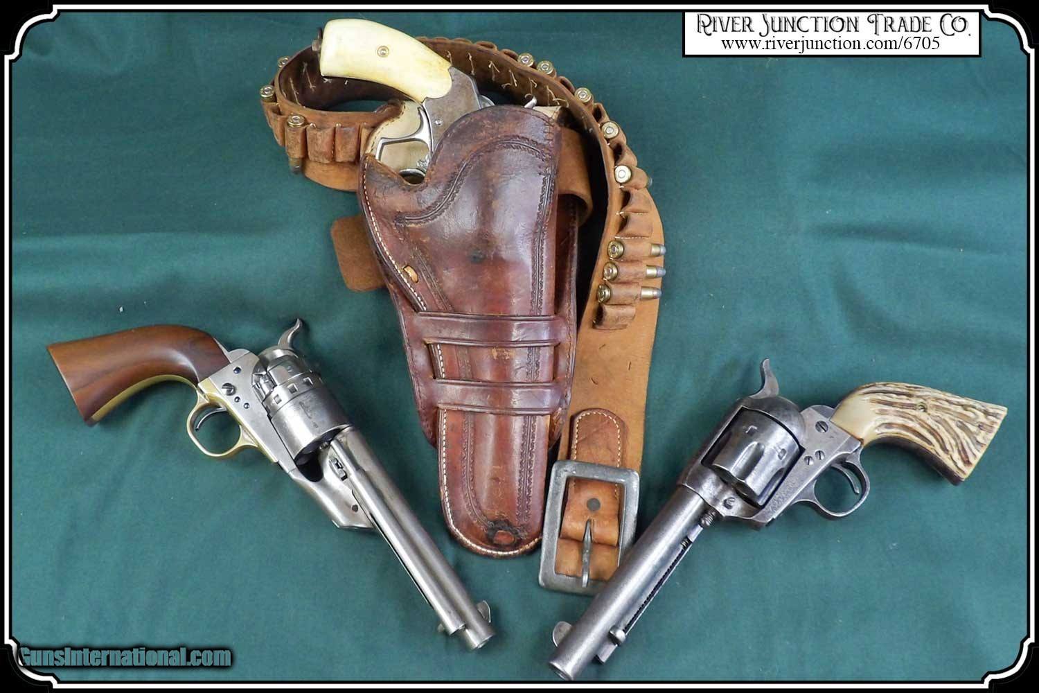 Description: Original Holster 1880 to1890. Civilian holster and belt from the Old West era. This classic rig with roller stamped border makes for a most attractive outfit. This holster was a popular civilian style of the 80's and 90's. and beyond. Double loop style with its typical sewn closed toe. Made of medium weight russet colored leather and fully lined. This holster could be worn as right hand draw or cross draw. The leather is soft and pliable. It would be perfect for displaying with your original vintage Colt or you could just use it. All the stitches are strong and intact. A very nice, hard to find holster and belt for a 5 1/2 barreled Colt and others as in this case it holds my old Colt 1873 SAA. This holster is in very good condition no breaks or tears and the belt is likewise. Nice for the collector to show off his vintage Colt six gun or S&W Frontier. It is a perfect fit for my 5 1/2 in. barrel Colt SAA but would service equally as well for a Colt Bisley 4 3/4", 5 1/2", a Colt 1878 D.A., or a S&W D.A. or S.A. Frontier 6". To find one in good condition is a rarity. There are no loose or missing stitching. My Old six shooter and other Items are not included. Payment: Item, can be ordered on line with a credit card or paypal on our sight. Just Google (riverjunction) and type in the River Junction Trade Co. item number (6705) in the search box. Before you checkout you will see shipping cost and total. OR If you prefer: Pay by cash, postal money order, cashiers check, personal & business checks. We wait for checks to clear. We always answer questions and entertain offers. Have questions? Call me 563-880-4588. Jim SOLD |
