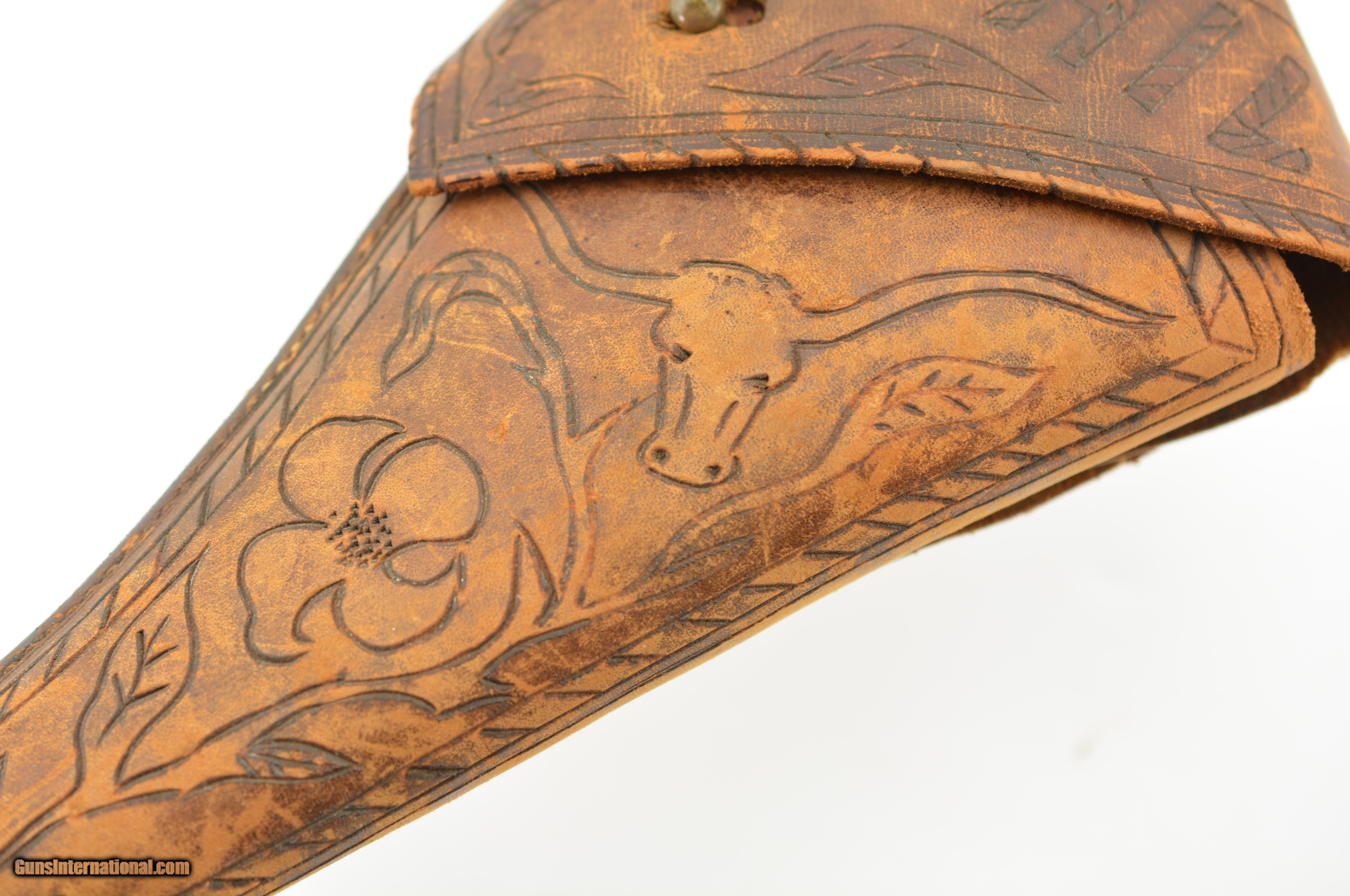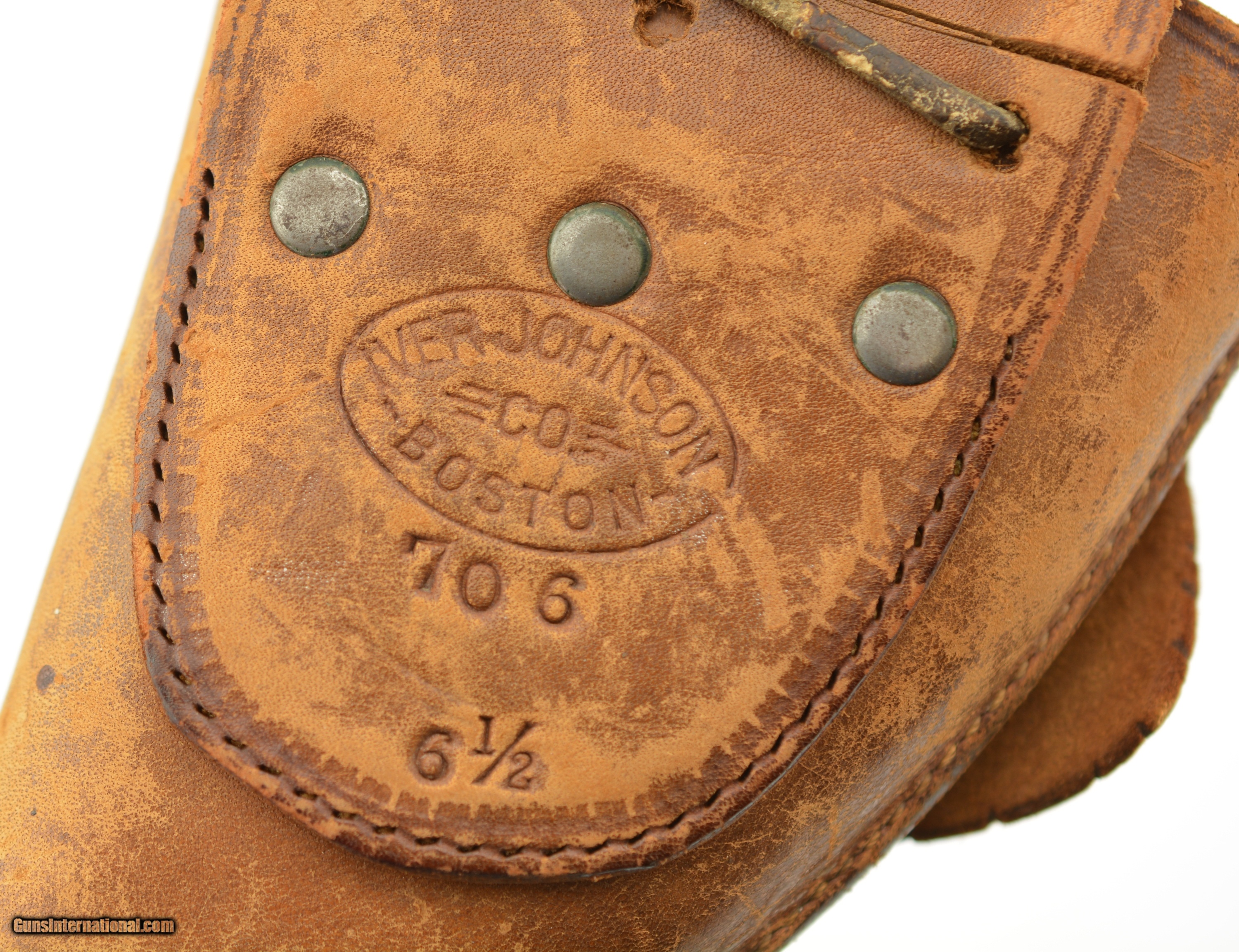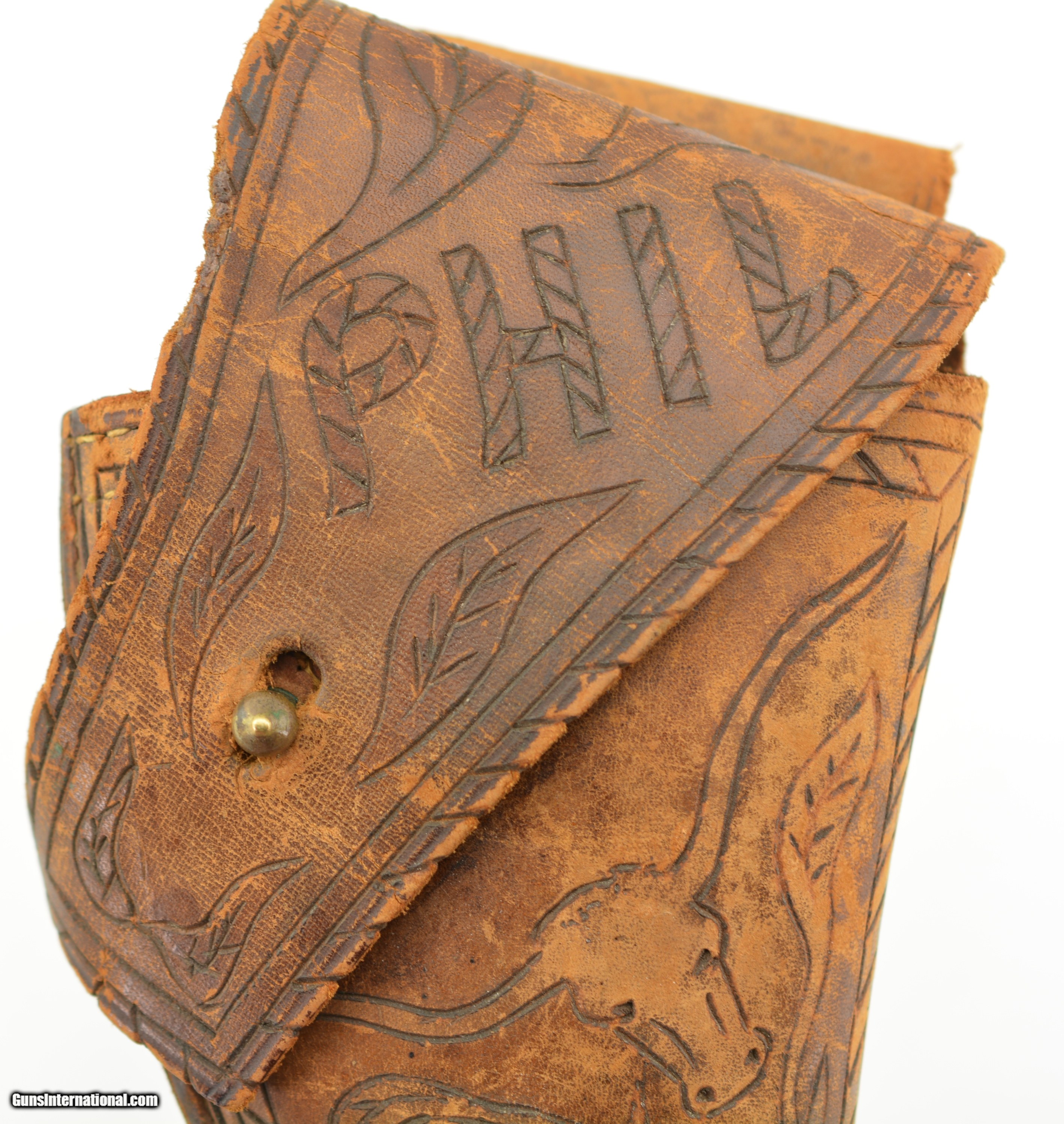 Description: This is an Iver Johnson Company, Boston, #706 leather holster manufactured circa 1900-1920 that has been hand tooled with the name “PHIL" on the flap and a Texas Long Horn and floral motif on the main body of the holster. It is marked with “Iver Johnson Co. Boston" logo and “706 / 6 1/2". Designed to fit guns such as the Colt Single Action, S&W Schofield and others with a 6 ½ inch barrel. A great looking holster that will display well with your Cowboy gun. The holster is in very good condition with weathered leather that retains about half of the original finish with sound stitching and somewhat dry leather. A scarce holster with what must be an interesting history. SOLD Manufacturer: Iver Johnson Model: 706 |