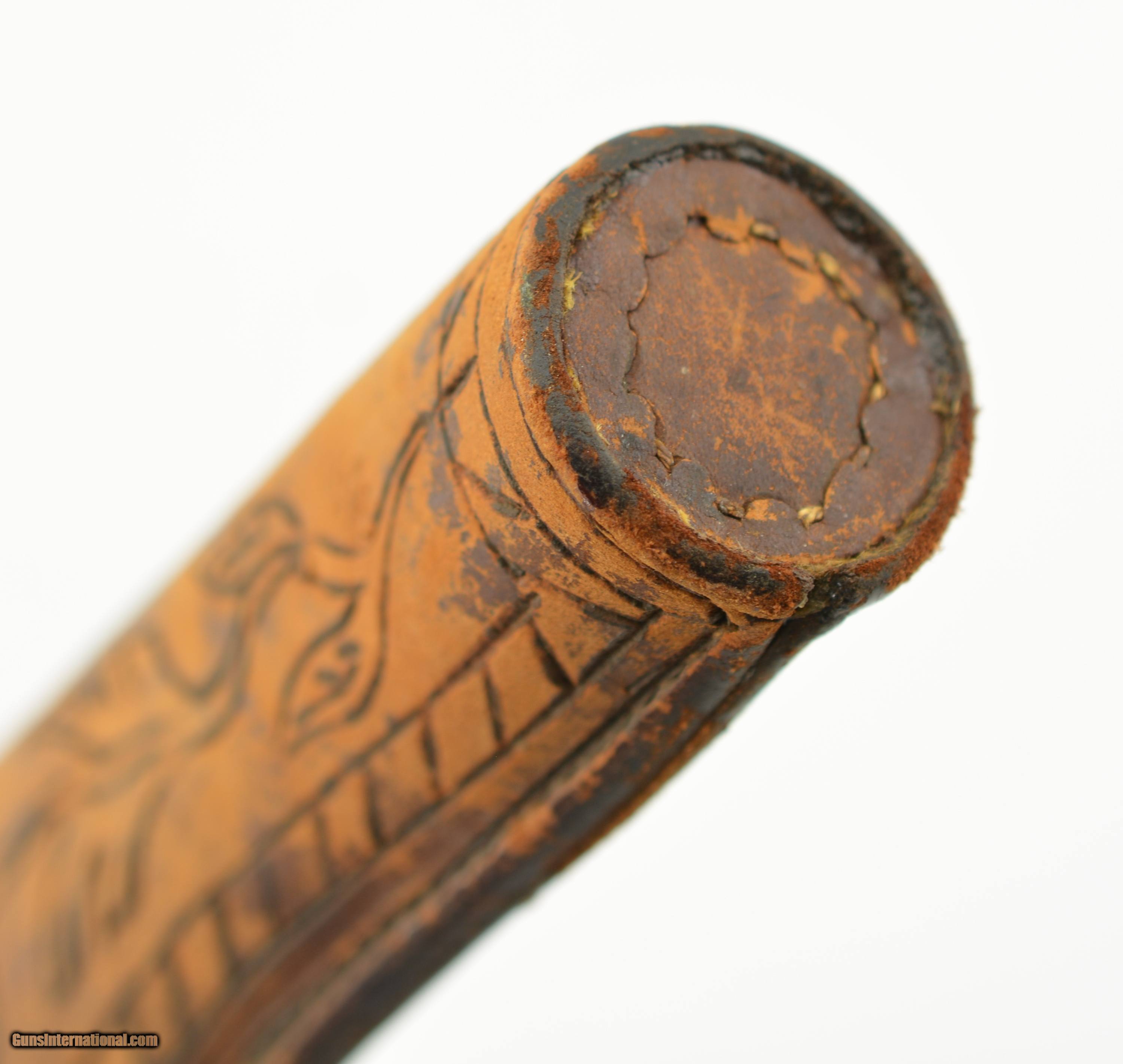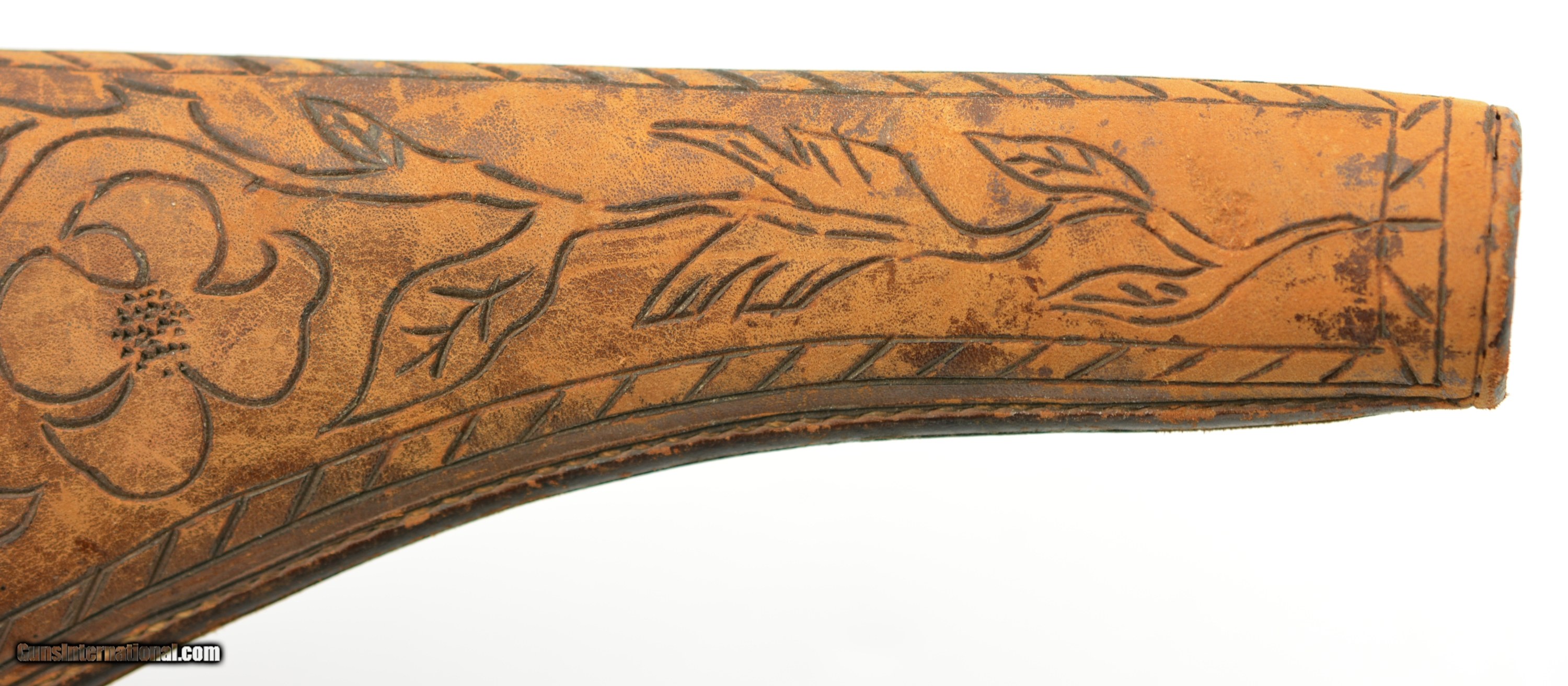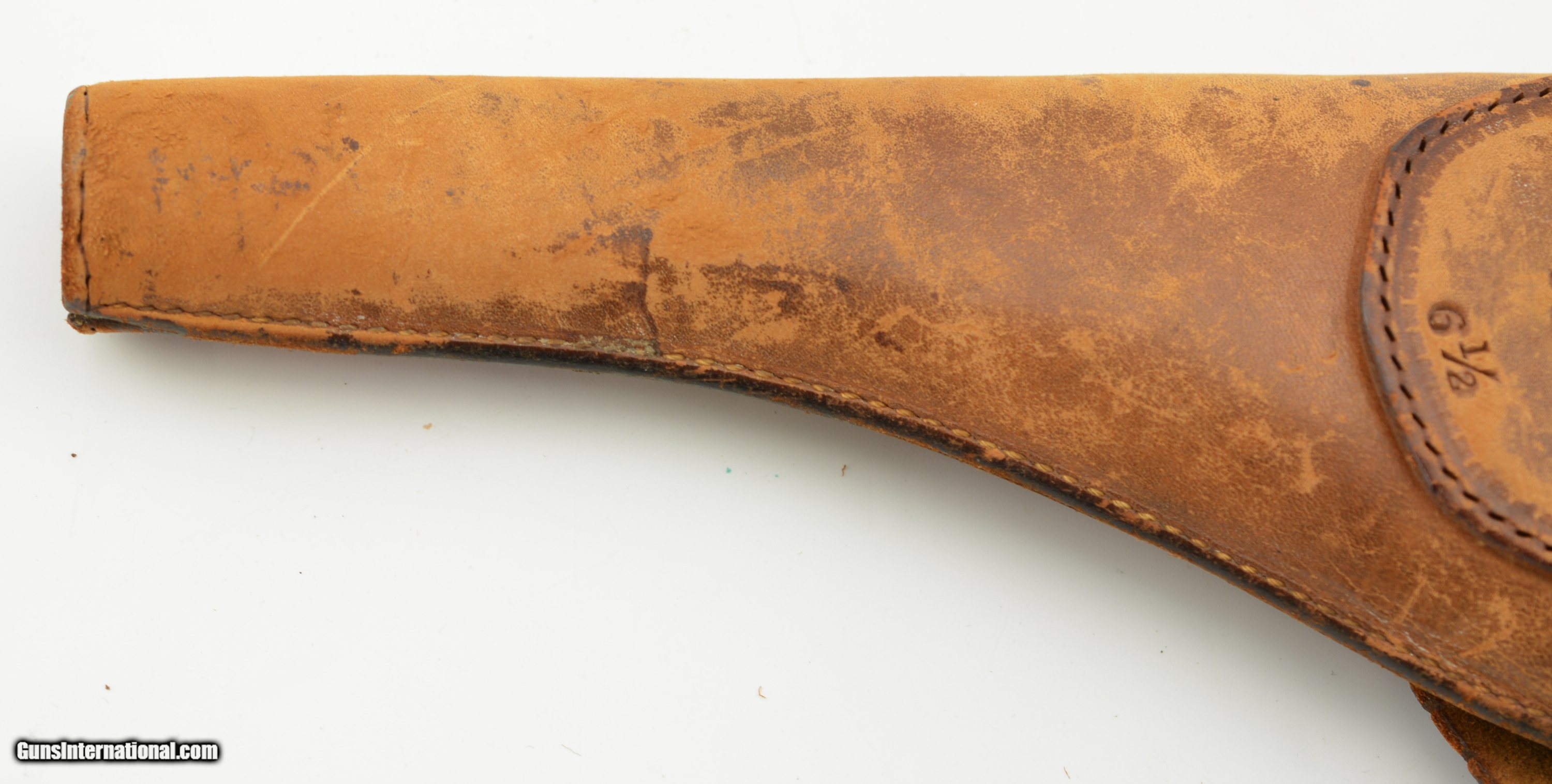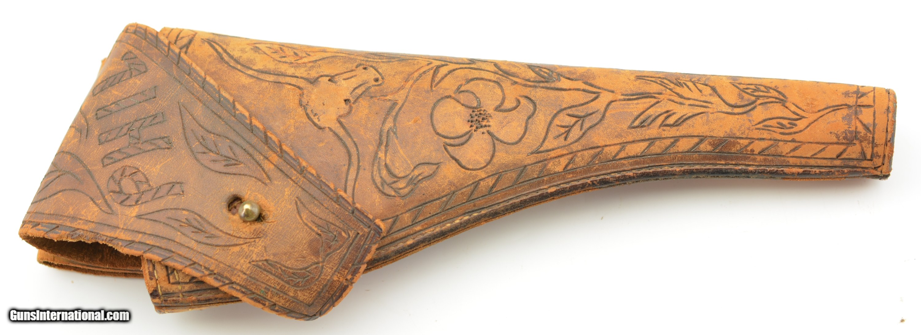 Description: This is an Iver Johnson Company, Boston, #706 leather holster manufactured circa 1900-1920 that has been hand tooled with the name “PHIL" on the flap and a Texas Long Horn and floral motif on the main body of the holster. It is marked with “Iver Johnson Co. Boston" logo and “706 / 6 1/2". Designed to fit guns such as the Colt Single Action, S&W Schofield and others with a 6 ½ inch barrel. A great looking holster that will display well with your Cowboy gun. The holster is in very good condition with weathered leather that retains about half of the original finish with sound stitching and somewhat dry leather. A scarce holster with what must be an interesting history. SOLD Manufacturer: Iver Johnson Model: 706 |