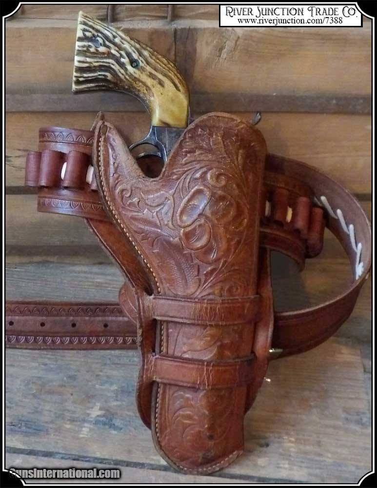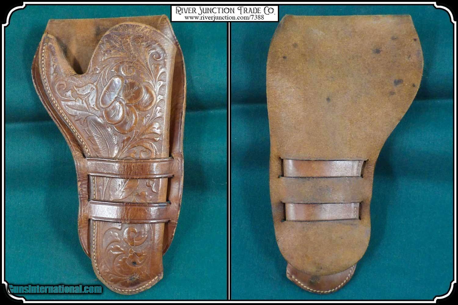 Description: Original large frame Holster 1870 to1920. Civilian holster from the Old West era and the roaring 20s. This classic holster with embossed pattern is most attractive and is in very nice condition. Double loop style with its typical sewn closed toe. Made of medium weight russet colored leather, with pressed design on the main pouch. This holster could be worn as right hand draw or cross draw. It fits an 1873 Colt Single Action, Smith & Wesson's Frontier .44-40, and .44 Russian and the Belgium Smith copies and several others, with up to 6 1/2 inch barrel perfectly. The leather is fully alive, soft and pliable. It would be perfect for displaying with your original vintage pistolas, or you could just use it to pack one. All the stitches are strong and intact as the day it was made. A very nice, near seldom seen in this good of condition. This holster has no breaks or tears. Nice for the collector to show off his vintage Colt six gun or S&W. It would service equally as well for a Colt Bisley 5 1/2". To find one in "any condition" is a near impossibility. There are no loose or missing stitching. My Old six shooters and other Items are not included Price: $495.00 Buy Now Contact Seller |