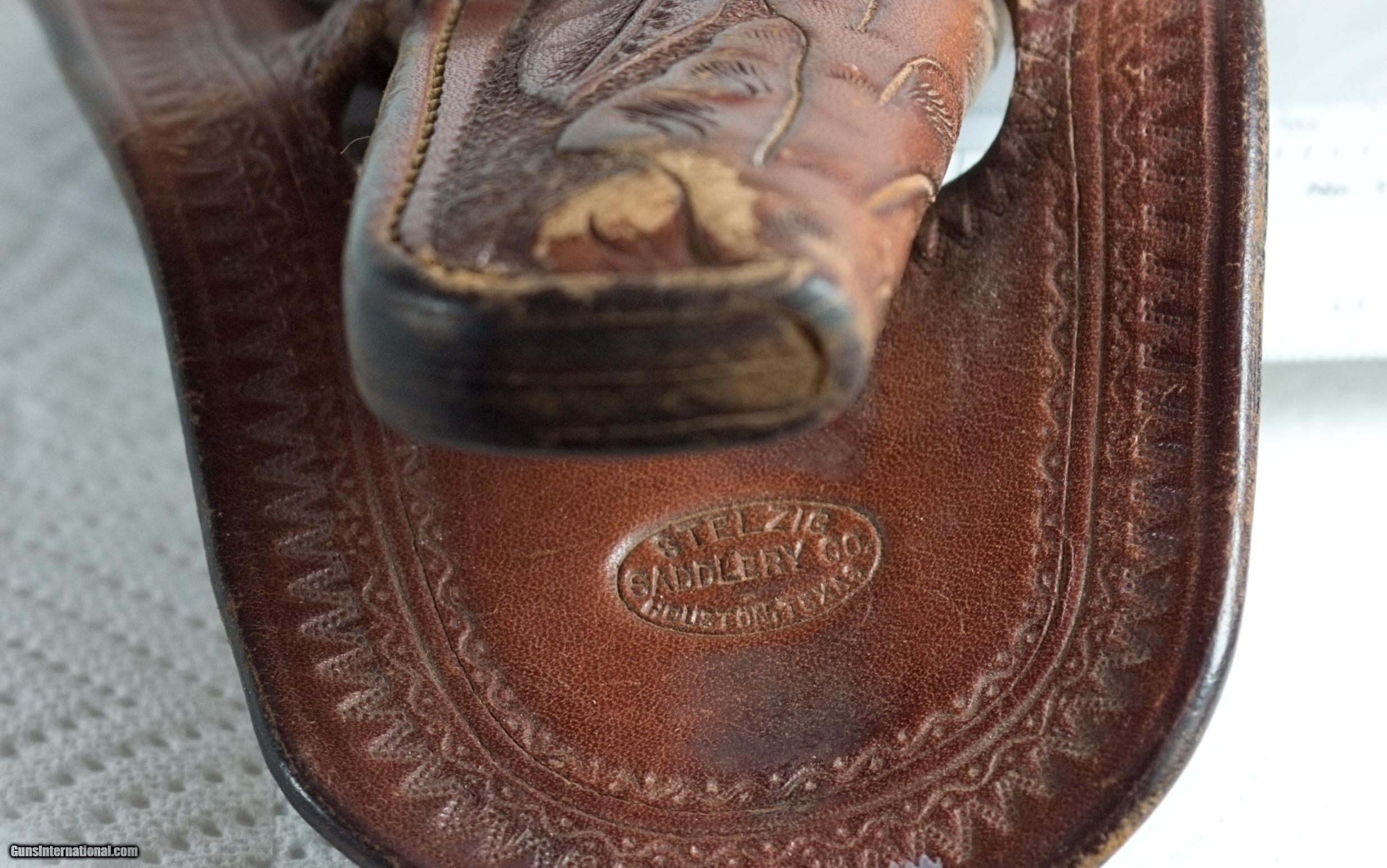 Description: ********SOLD******** Description: A. Stelzig is listed as "Saddles, Harness & Hdwe" in the 1888-93 City Directories. Then A. Stelzig (estate of) "Saddles, Harness & Hdwe " is listed in the 1894-1922 City Directories. Anton Stelzig, born June 29, 1849 in Germany, moved to Houston about 1880, and died Aug 25, 1893. The business was continued by his sons Anton, Jr., Charles, Joseph, & Henry. This antique holster remains in superb condition! Made of heavy leather in the best quality. The surface is smooth with a light sheen, and shows no crazing or cracking. Only one minor scuffed area exists where the barrel ended. The application of some clear Minwax shoe shine polish to this small scuffed area should restore the color and sheen. The leather is pliable, and all stitching is as tight as when new. There have been no alterations or repairs. The leather has not been treated with any preservatives. The pouch, skirt, and two loops were basically made from one piece of heavy leather. The pouch is deeply hand carved, and the skirt and loops also have attractive embossing. The lower skirt is deeply stamped "Stelzig / Saddlery Co. / Houston, Texas". Measurements are included with the pictures. Apparently made for one of the Colt M1889-1903 DA Series models in 38 Colt or 41 Colt with a 6” barrel. Shown in one picture is an overlay of the Colt M1889-1903 DA Series, as scaled to the 6” barrel. Imprints from the revolver’s trigger guard, cylinder, front sight, and muzzle can be seen inside this holster. [It was determined after this posting that a Colt Police Positive 38 Special with a 6” barrel is too small for this holster]. The Colt revolvers are not part of this sale, and are pictured for holster sizing purposes only. See GunsInternational Item 100807948 for the blued Colt M1896 DA Factory Inscribed. Terms: No International sales. Please ask questions prior to buying. Additional pictures sent on request. Due to potential damage caused by someone’s gun being crammed into this holster, there is NO three day inspection period, or Return. I hate to be this way, but in 50 years of collecting, have seen dumb things done that have irreversibly damaged antique holsters. This is an unusually nice holster, and it should stay that way. I accept Bank Cashier’s Checks and Postal Money Orders. No personal checks or Western Union MO’s. Payment must be received within seven days after sale date, and sent by Priority Mail with Tracking Number provided by buyer. Shipping by USPS Priority Mail (12” x 9” x 9” box) fully insured for $15.00 (and tracking number provided to buyer). Usually shipping occurs within 3 days after payment received. Three (3) day Inspection and Return Policy: None. SOLD |
