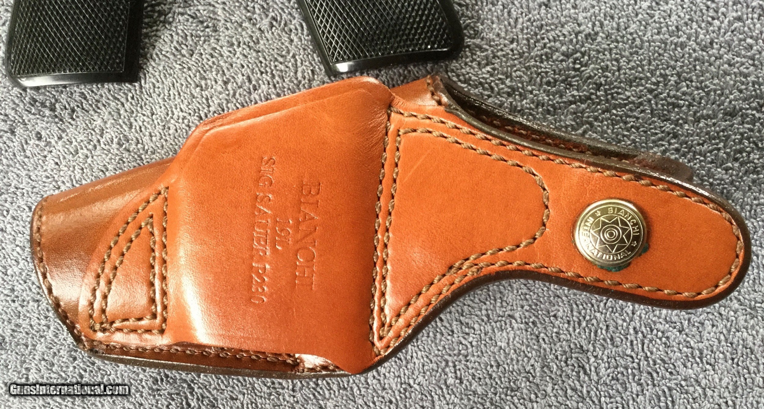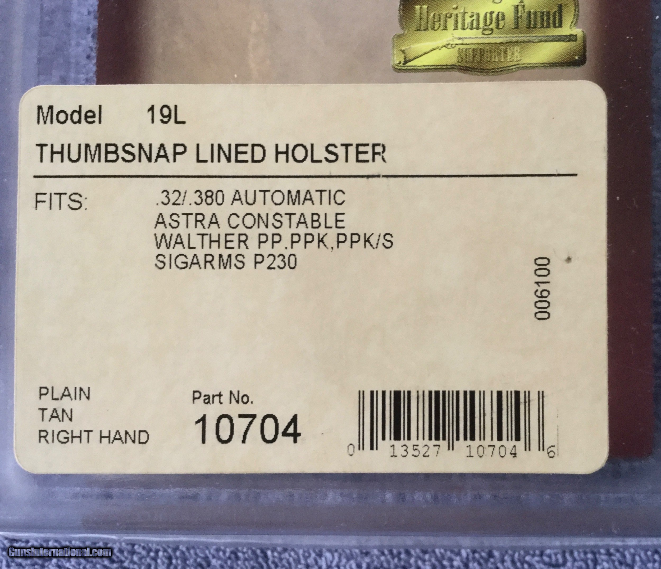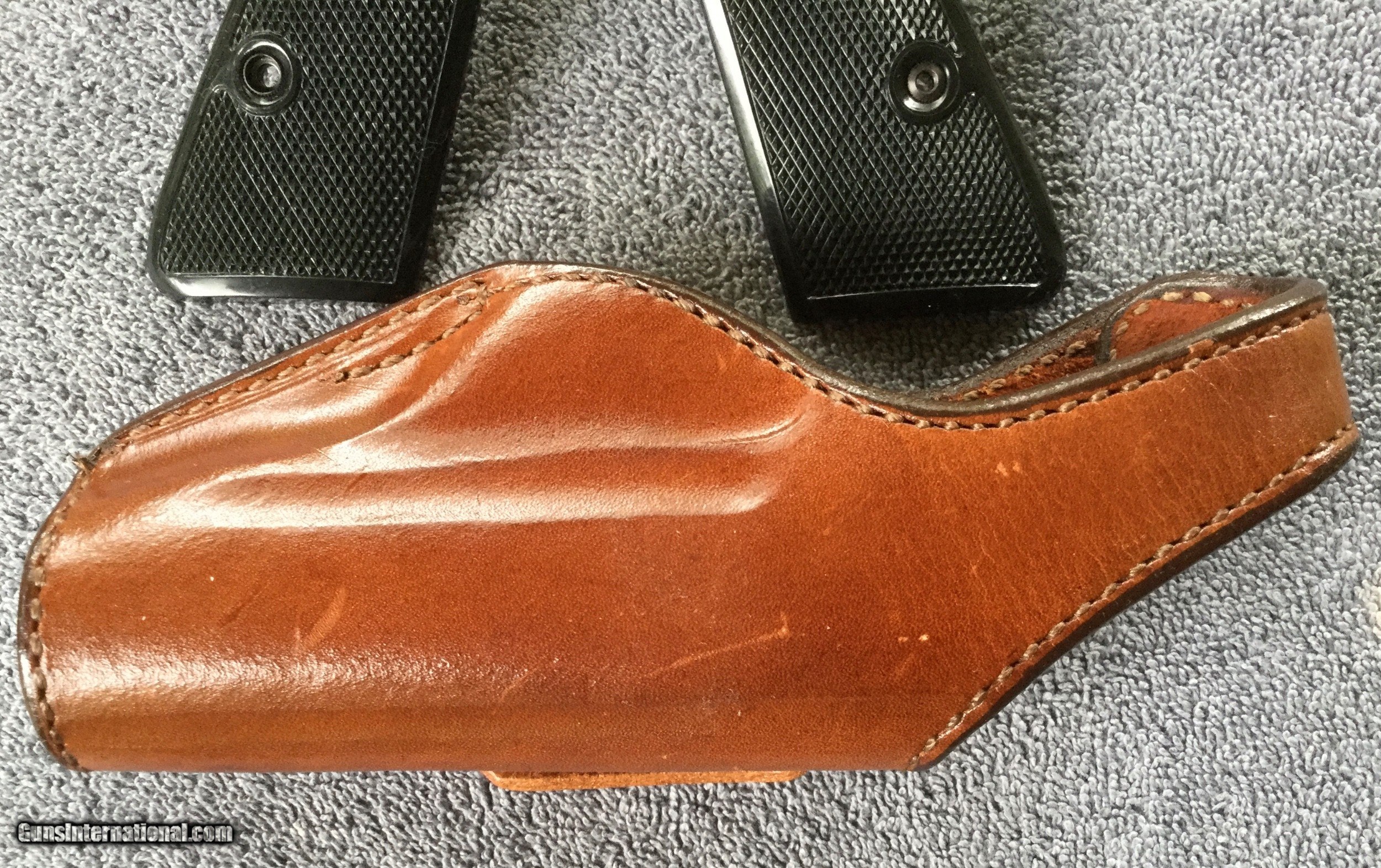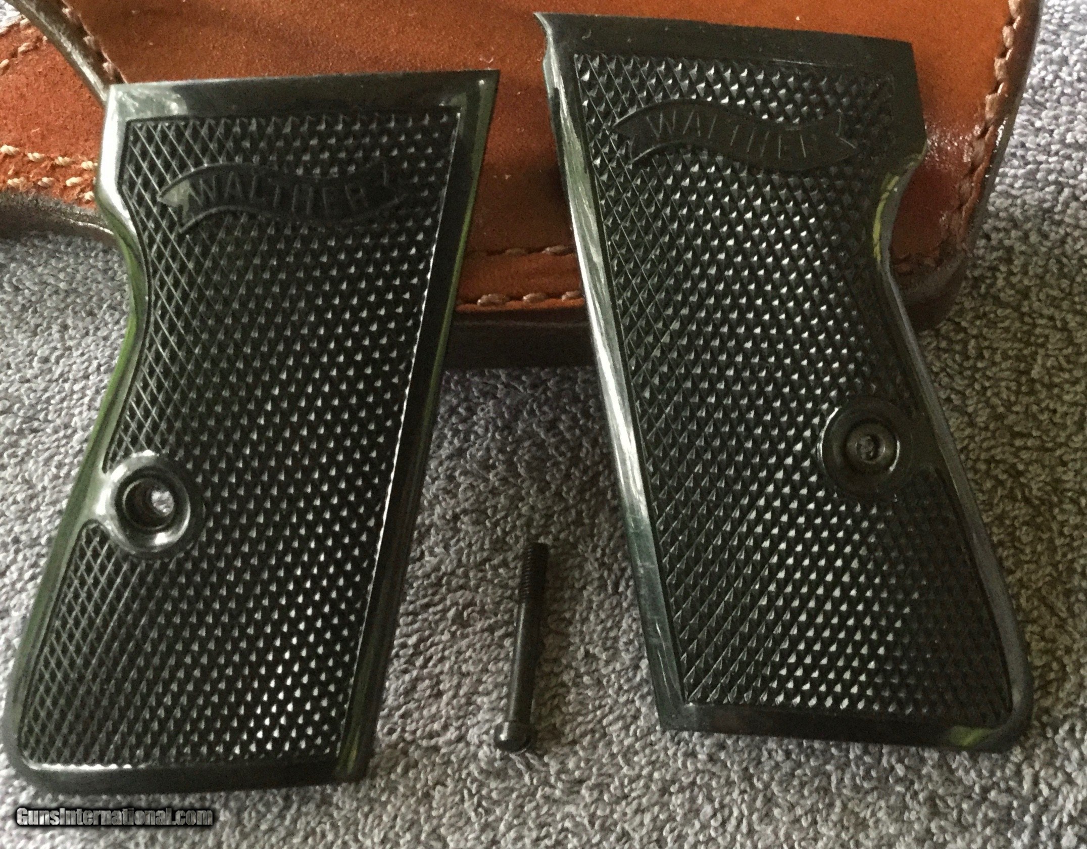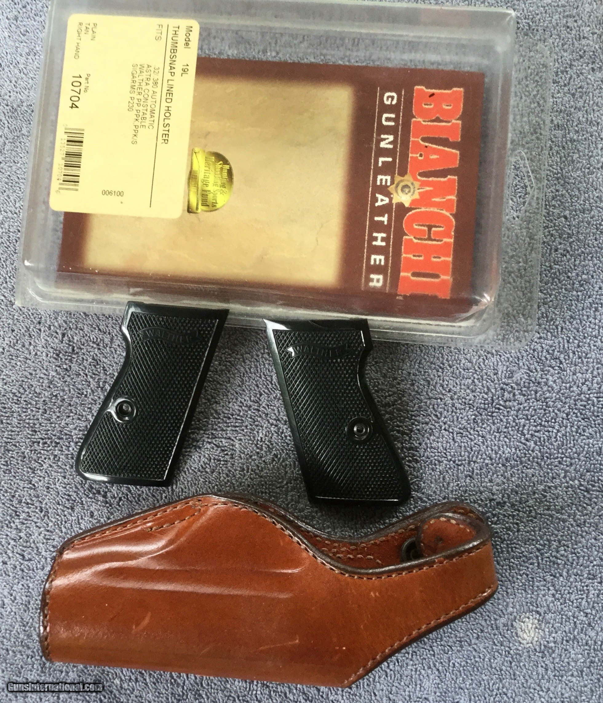 Description: A very nice 19L lined top snap Bianchi for Walther Ppk/s, Sig Sauers and others as shown on package. Also a pair of original manufacturers Walther grips with screw for a Pp or ppk/s in great condition. Add $15.00 for shipping. SOLD |