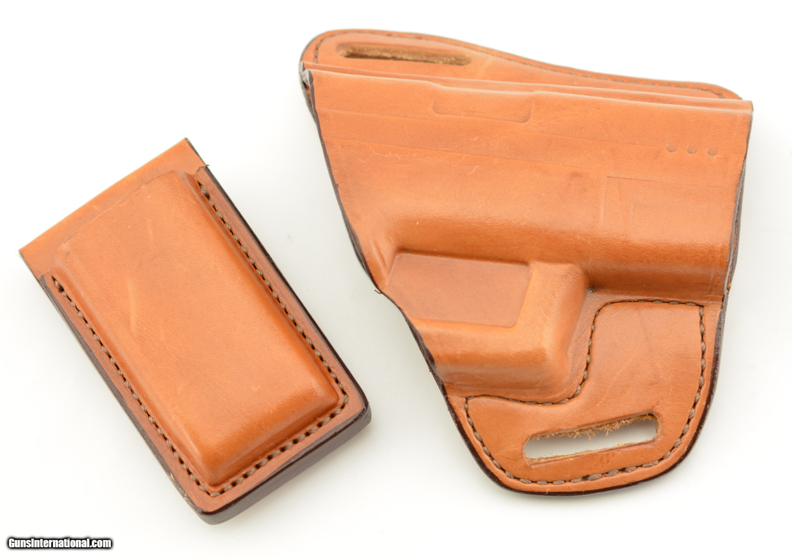 Description: This fine holster has an open-top for quick access and draw with a low profile, compact design. Heavy 30-degree cant for small of back or rear hip carry. Holster designed for the Springfeild XP. To round out this holster we have a Bianchi model 20A single stack magazine holder. Both are a rich light tan with only light markings. Please see pictures for details. SOLD |