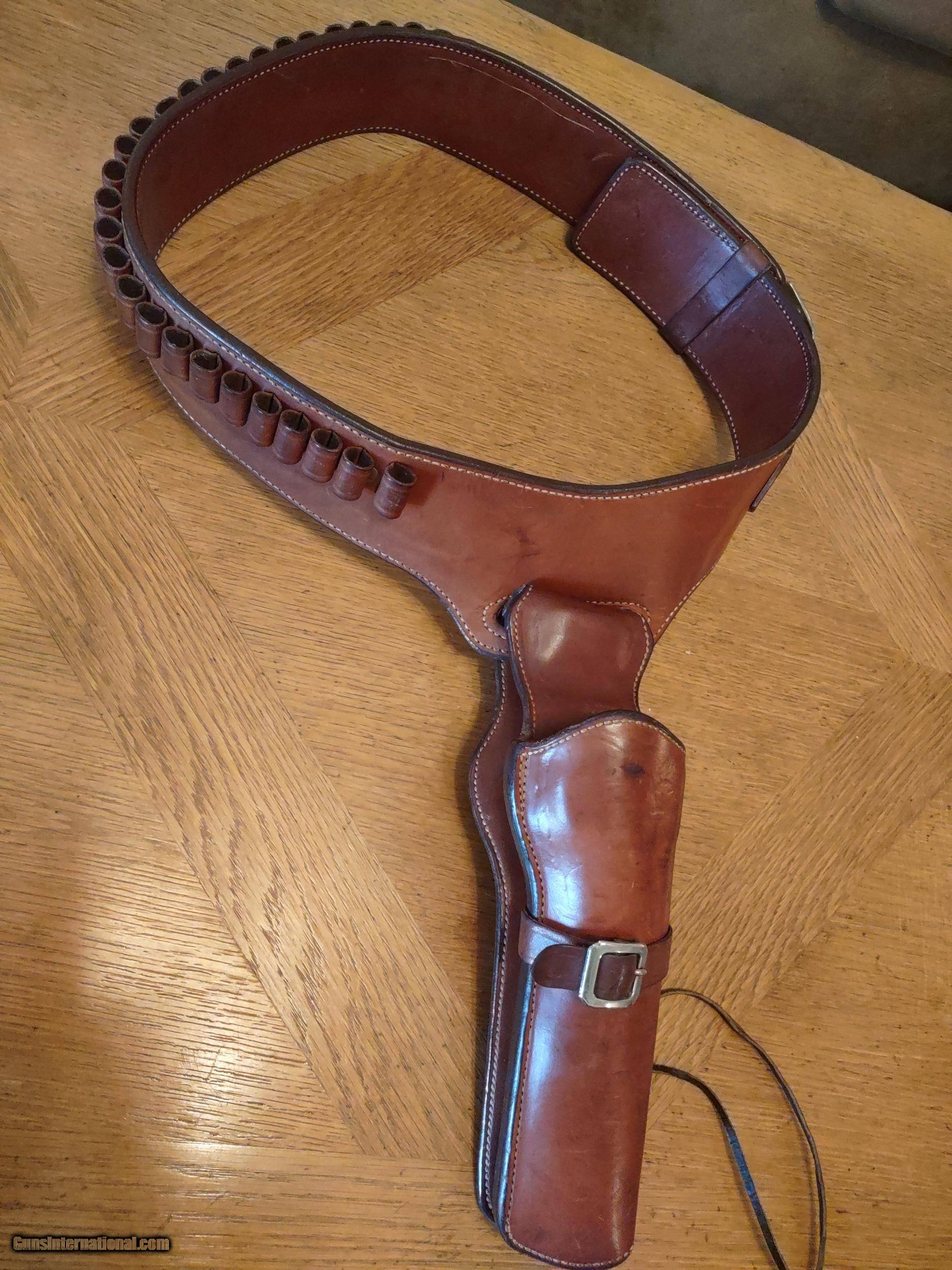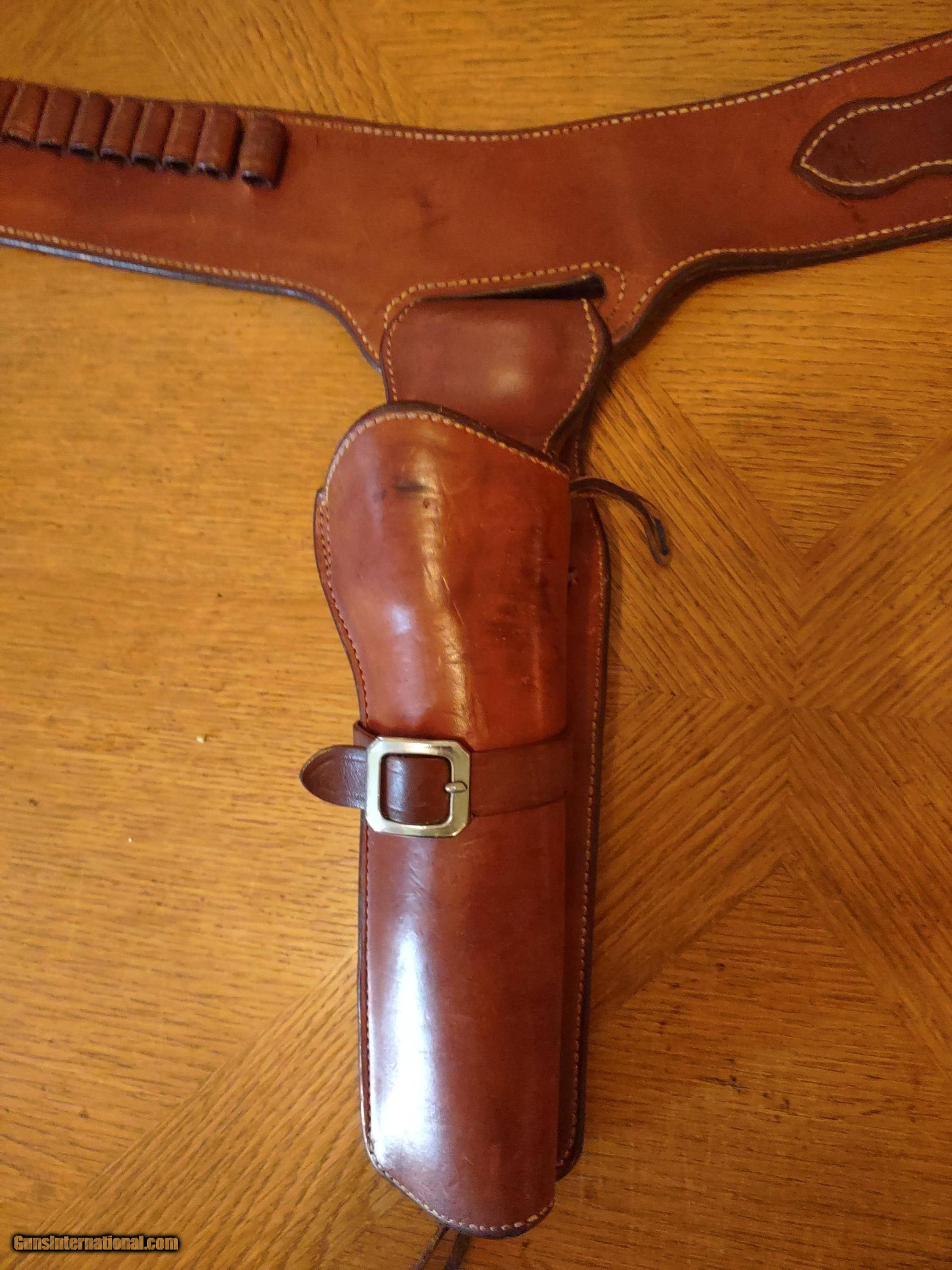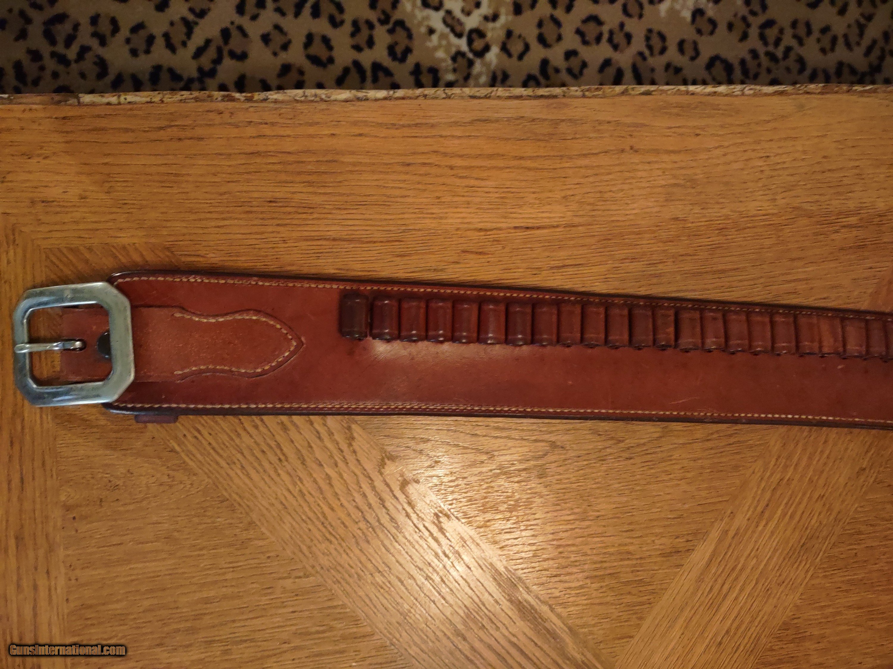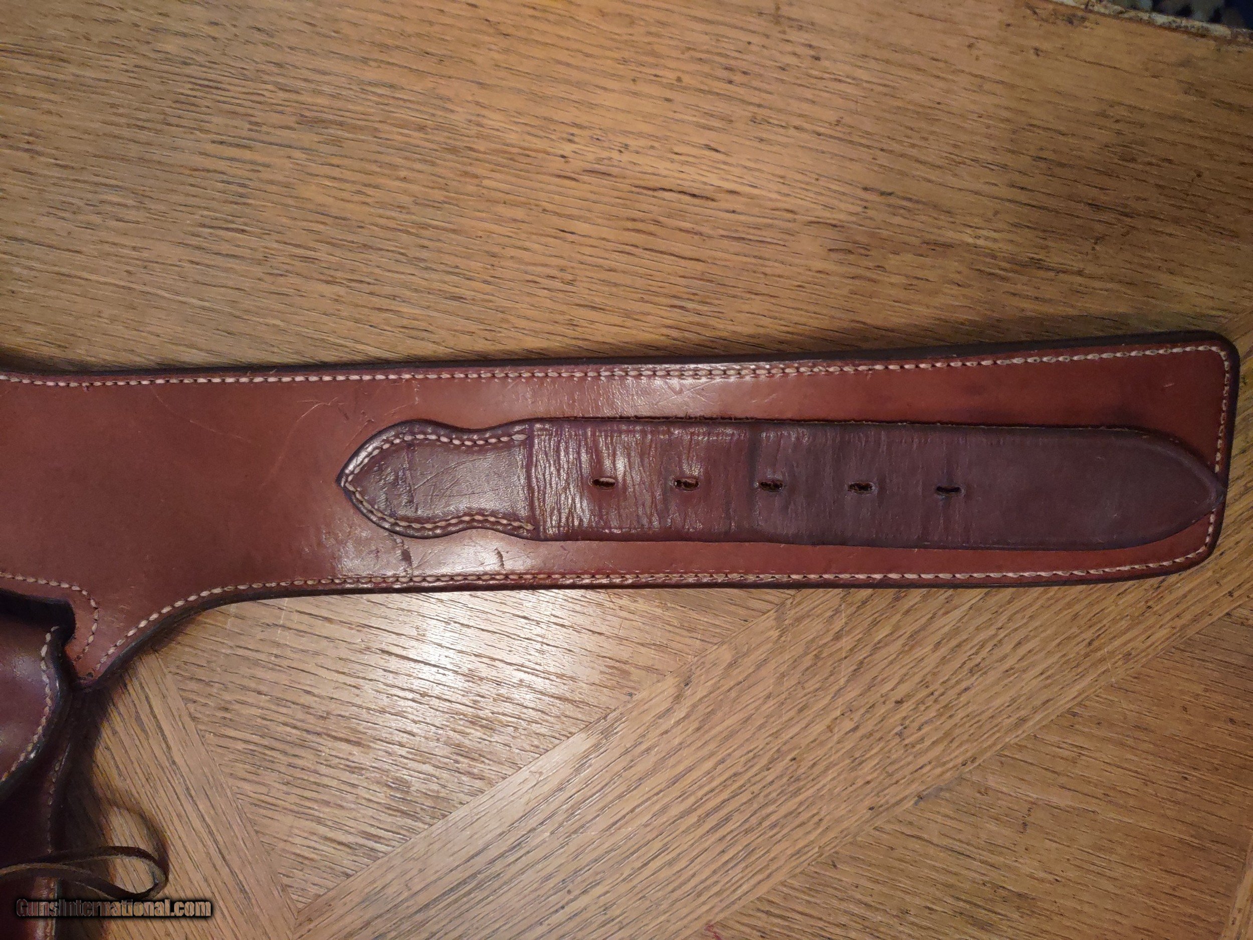 Description: BIANCHI MODEL 1890 LEATHER REVOLVER HOLSTER for Single Action Army (SAA) with 7 1/2" barrel, 36 ammo loops for .44/.45 CALIBER rounds, overall belt length of 45 inches and waist size of 34-38 inches with 36 being ideal. The belt is 3 inches wide and in excellent condition...typical BIANCHI high quality leather along with incomparable craftsmanship. LOOKS GREAT! The price is $225 delivered to your door. Call or text me at 318-780-4242 if you are interested. Meanwhile, enjoy the pictures. SOLD |
