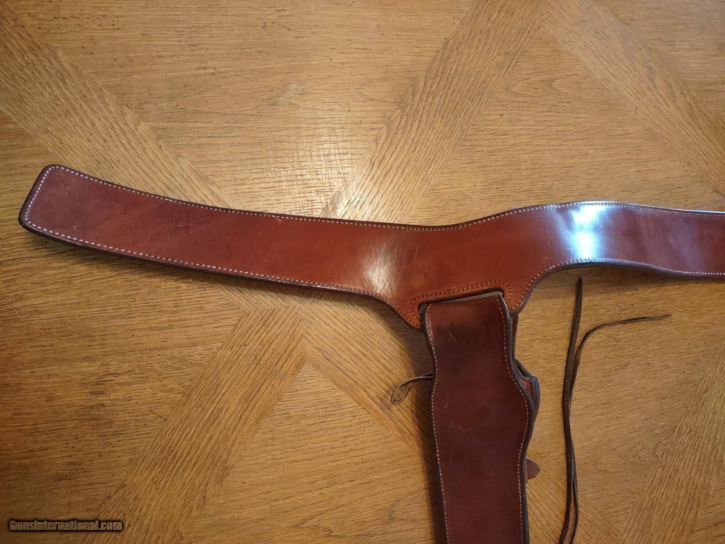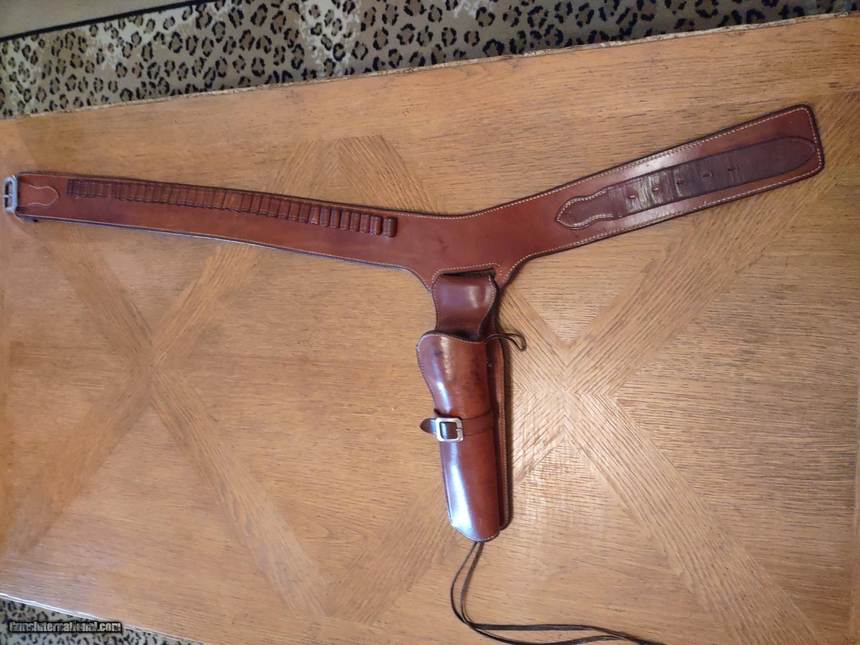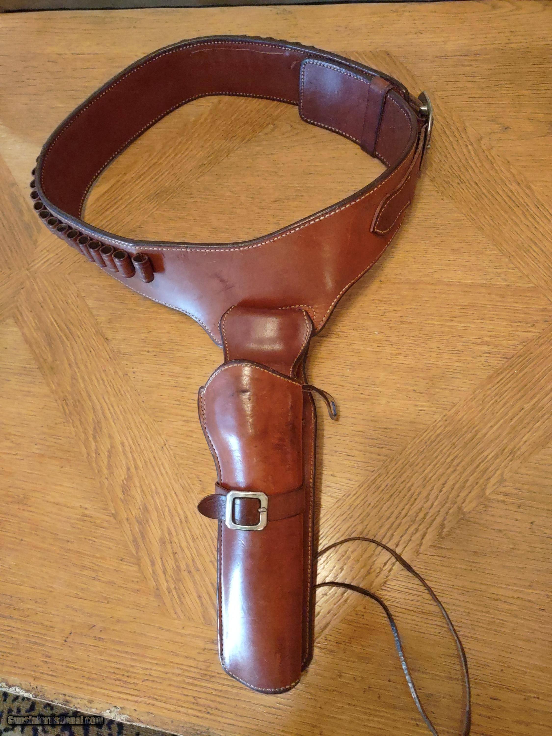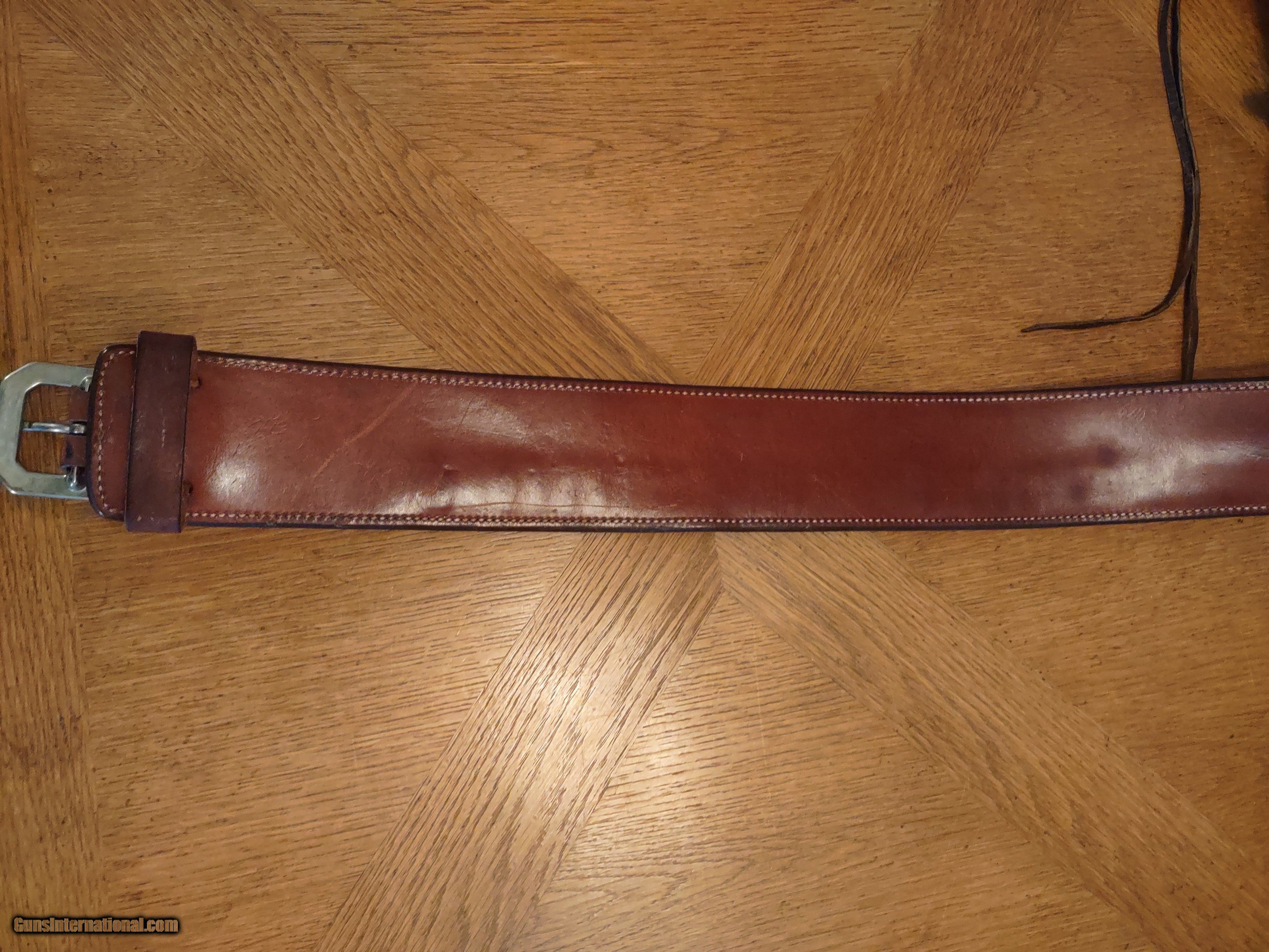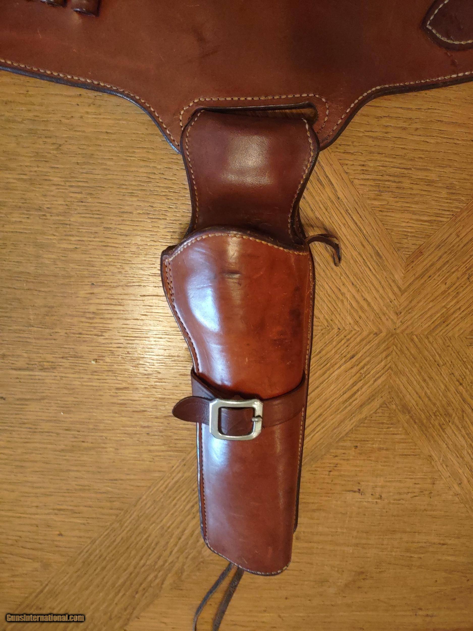 Description: BIANCHI MODEL 1890 LEATHER REVOLVER HOLSTER for Single Action Army (SAA) with 7 1/2" barrel, 36 ammo loops for .44/.45 CALIBER rounds, overall belt length of 45 inches and waist size of 34-38 inches with 36 being ideal. The belt is 3 inches wide and in excellent condition...typical BIANCHI high quality leather along with incomparable craftsmanship. LOOKS GREAT! The price is $225 delivered to your door. Call or text me at 318-780-4242 if you are interested. Meanwhile, enjoy the pictures. SOLD |