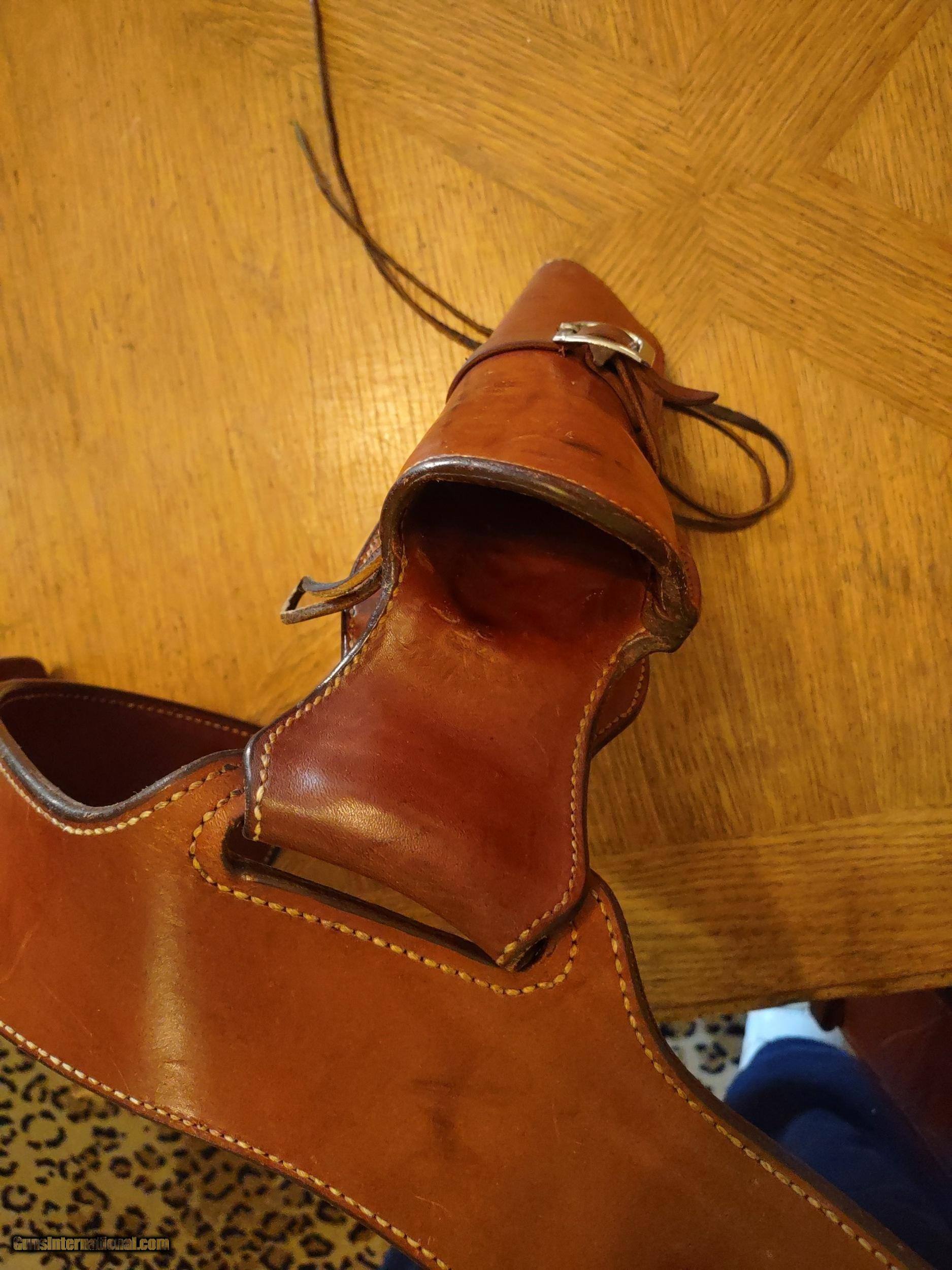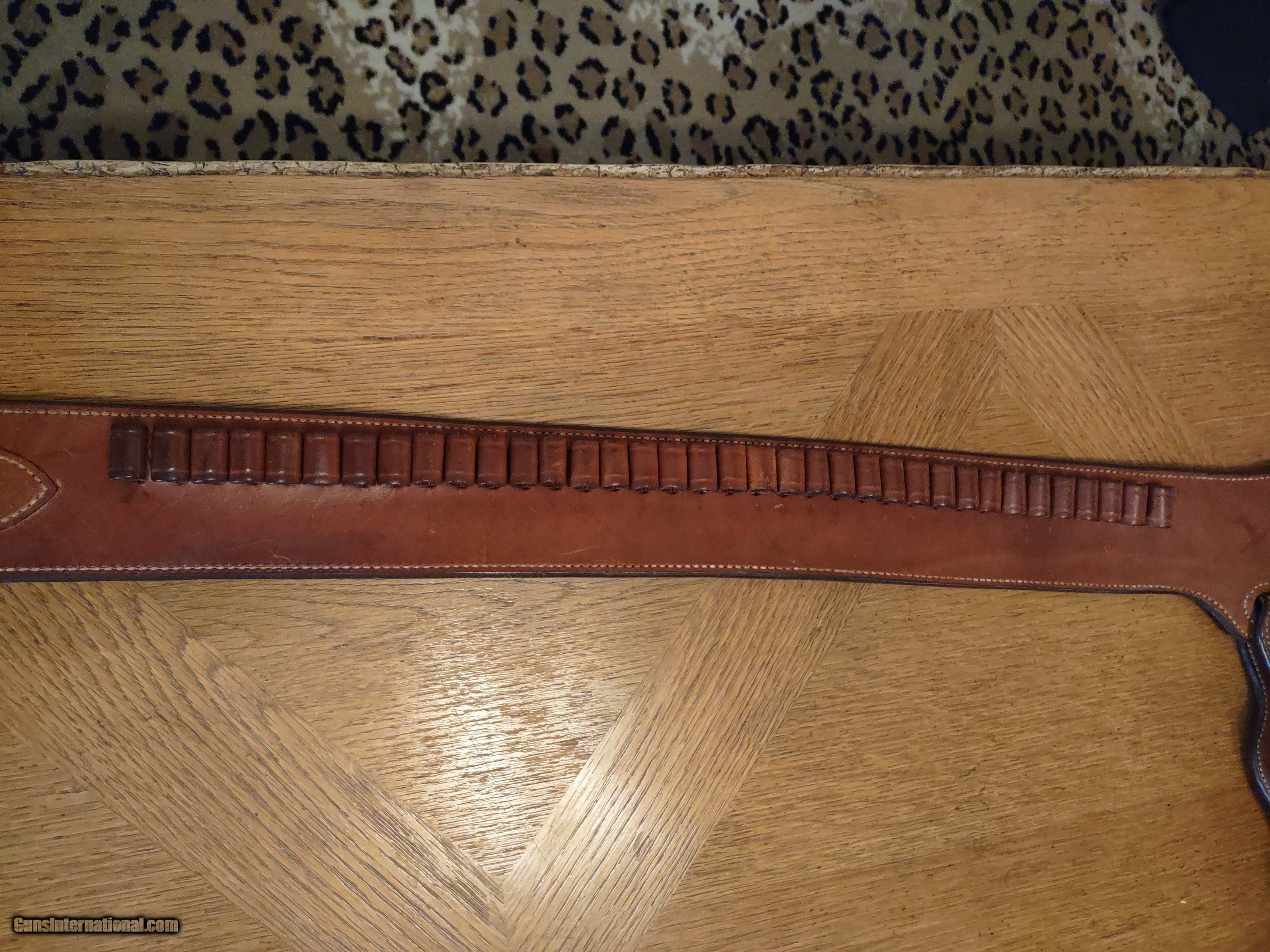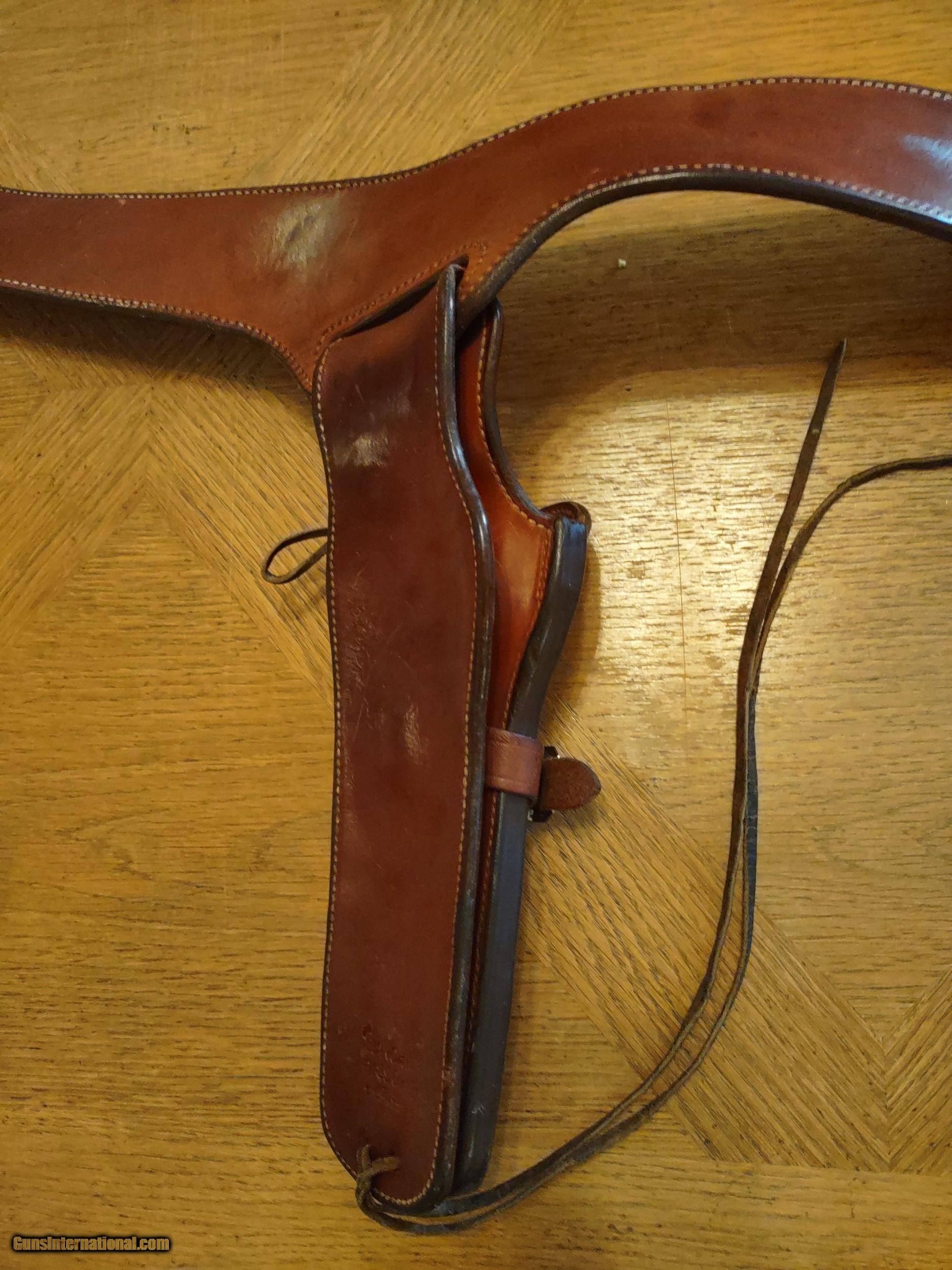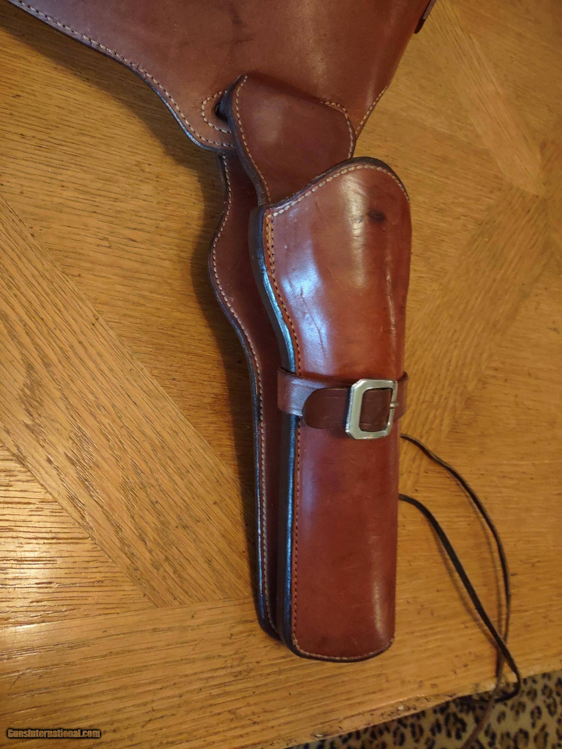 Description: BIANCHI MODEL 1890 LEATHER REVOLVER HOLSTER for Single Action Army (SAA) with 7 1/2" barrel, 36 ammo loops for .44/.45 CALIBER rounds, overall belt length of 45 inches and waist size of 34-38 inches with 36 being ideal. The belt is 3 inches wide and in excellent condition...typical BIANCHI high quality leather along with incomparable craftsmanship. LOOKS GREAT! The price is $225 delivered to your door. Call or text me at 318-780-4242 if you are interested. Meanwhile, enjoy the pictures. SOLD |