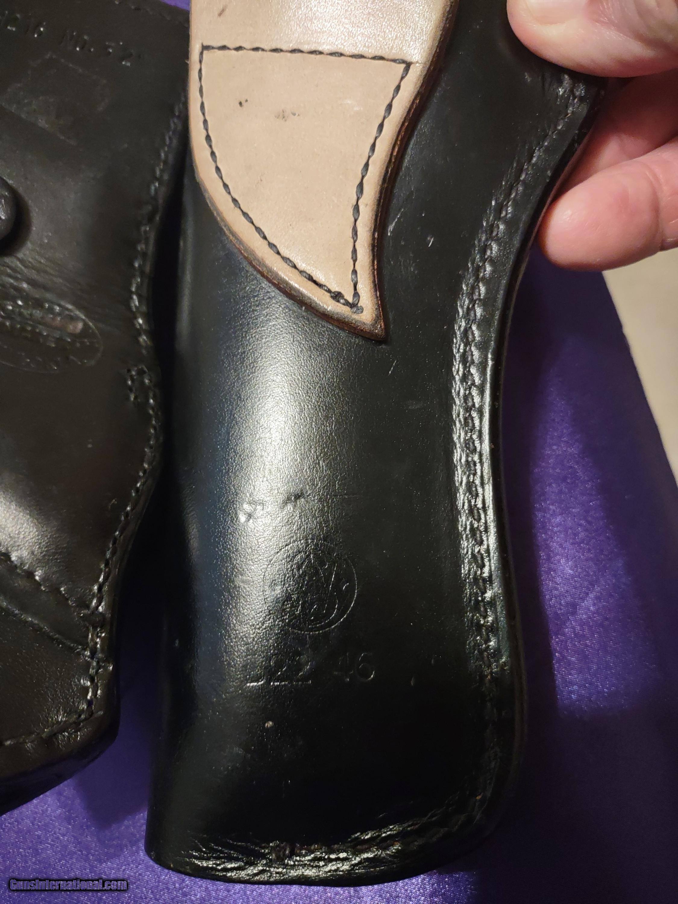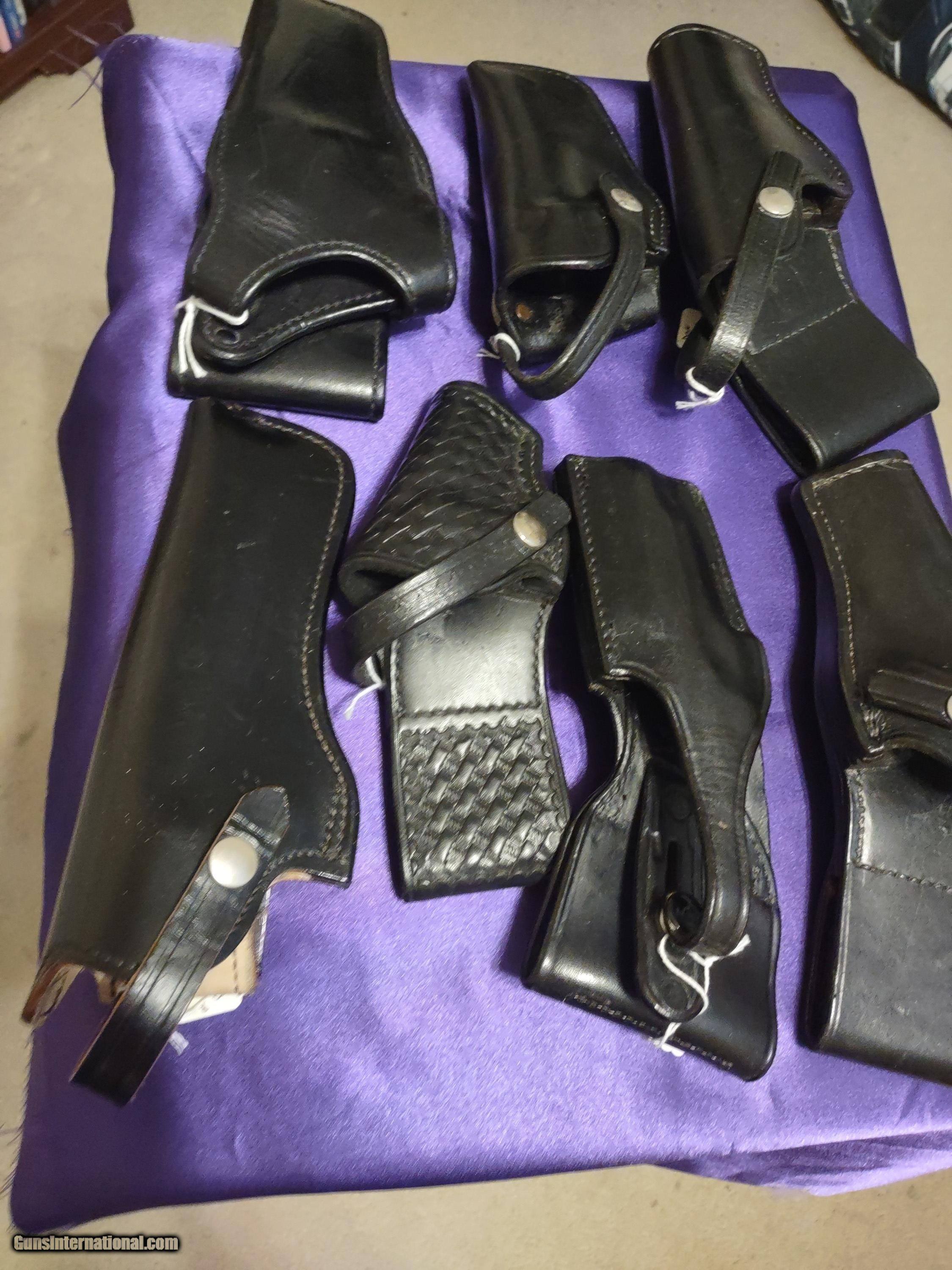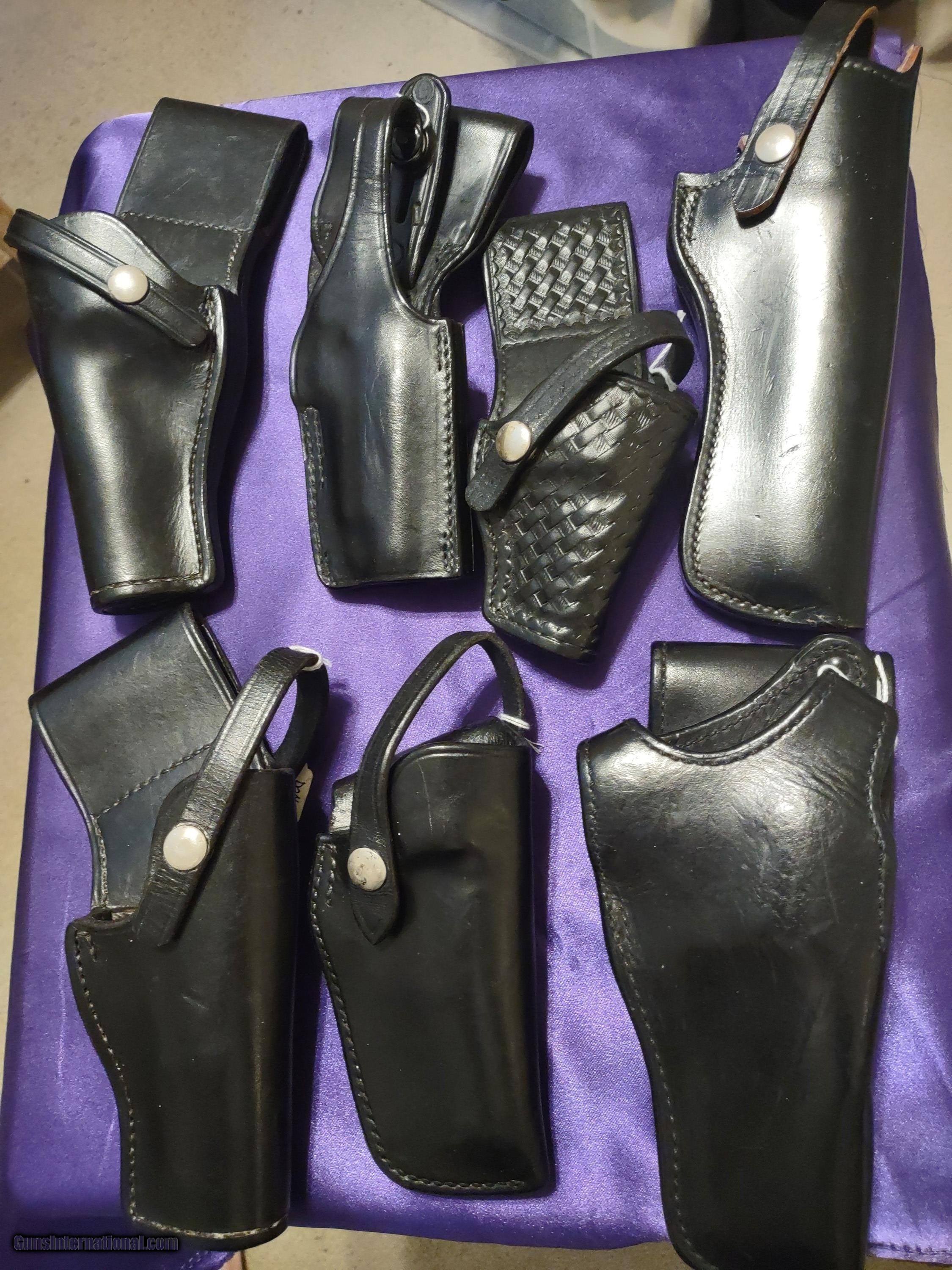 Description: Seven, all black, all leather holsters for pistols and revolvers: MONTANA #55 for S&W 9MM, thumb release; SMITH & WESSON Model B22-46 for revolver with 6" barrel, leather lined; DON HUME H216 No. 32 for small revolver with 2" barrel, tooled basketweave; GOULD & GOODRICH , thumb release for revolver with 4" barrel; two Don Hume for revolvers with 4" barrels; all in excellent condition. YOUR CHOICE $45 with free mailing! If you want all 7 for your gun store, let's talk, make me an offer!! Call or text me at 318-780-4242 if you are interested. SOLD |