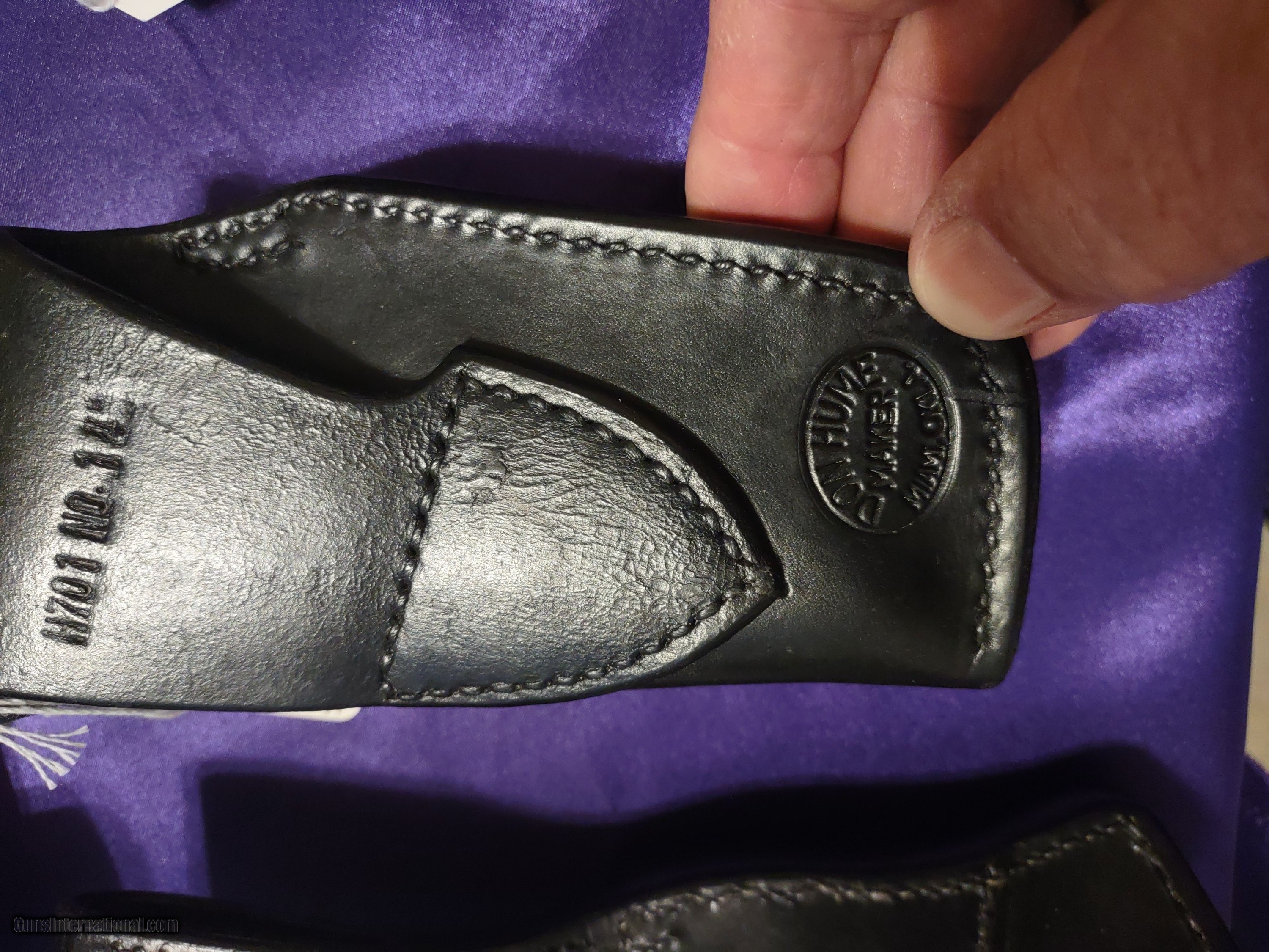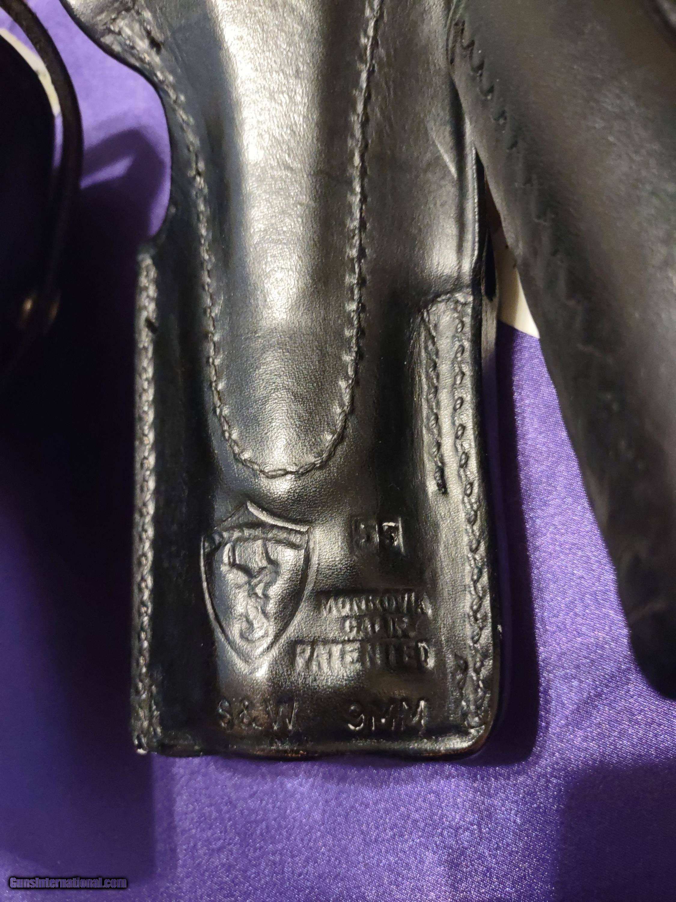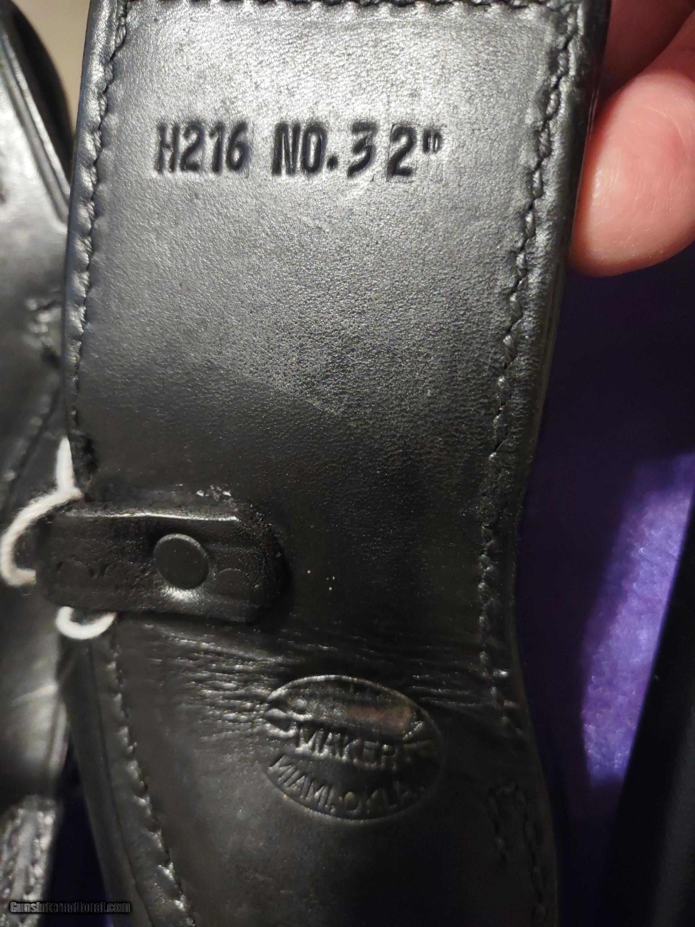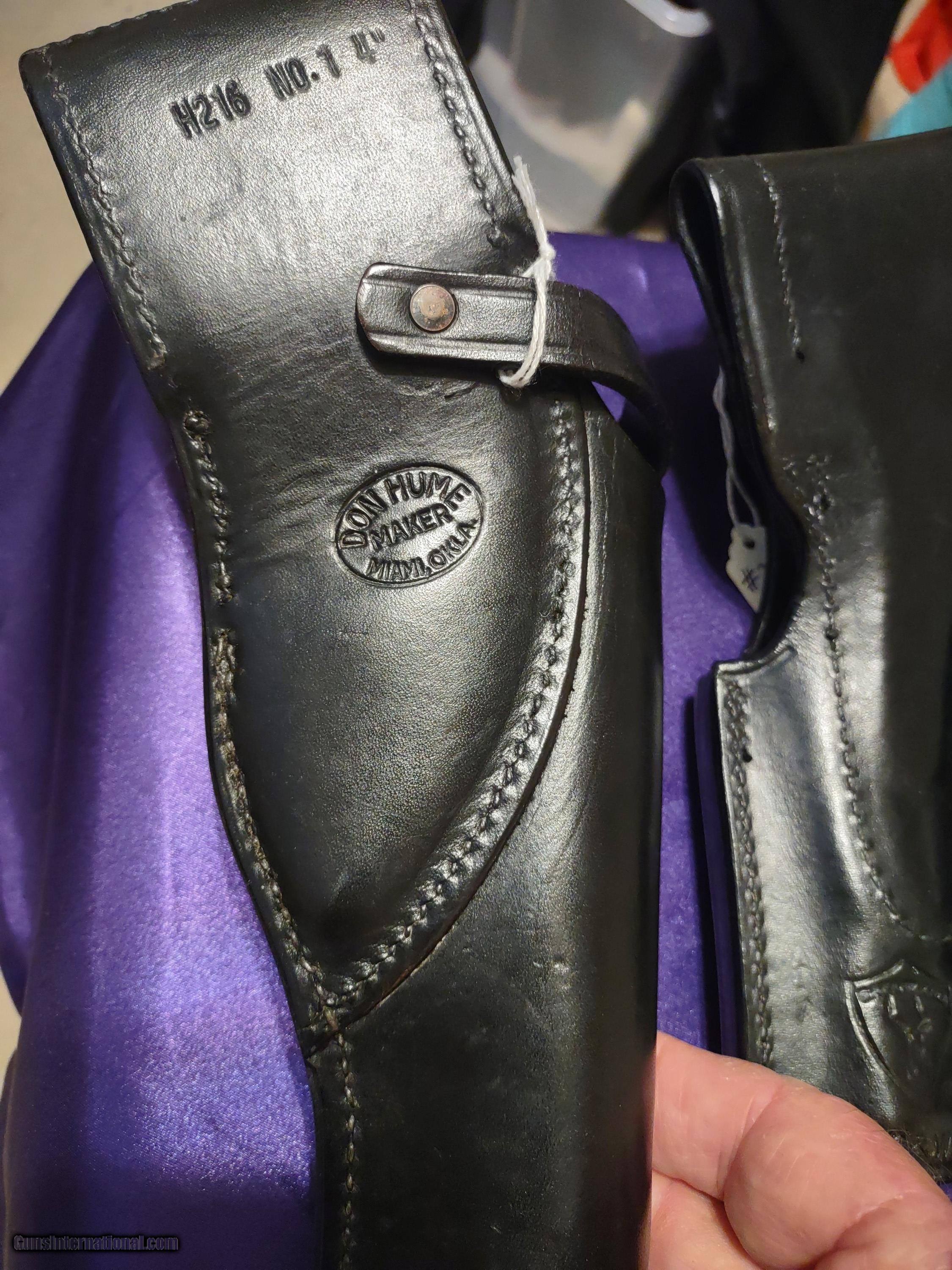 Description: Seven, all black, all leather holsters for pistols and revolvers: MONTANA #55 for S&W 9MM, thumb release; SMITH & WESSON Model B22-46 for revolver with 6" barrel, leather lined; DON HUME H216 No. 32 for small revolver with 2" barrel, tooled basketweave; GOULD & GOODRICH , thumb release for revolver with 4" barrel; two Don Hume for revolvers with 4" barrels; all in excellent condition. YOUR CHOICE $45 with free mailing! If you want all 7 for your gun store, let's talk, make me an offer!! Call or text me at 318-780-4242 if you are interested. SOLD |