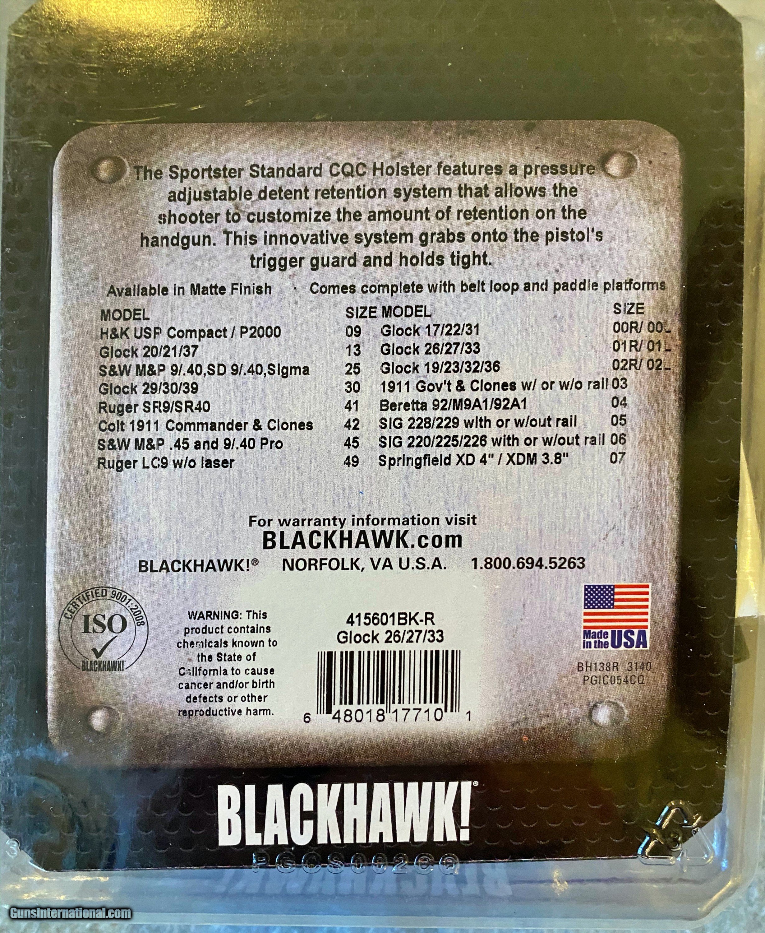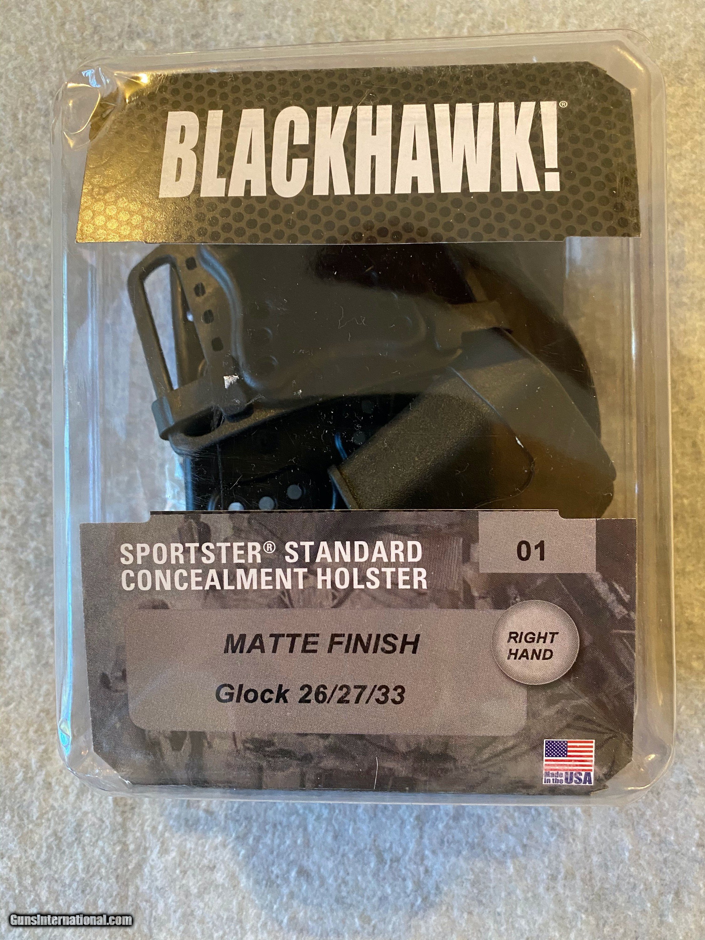 Description: THIS IS AN OLD STOCK BLACKHAWK RIGHT HAND SPORTSTER HOLSTER FOR A GLOCK 26, 27, AND 33. IT COMES WITH BOTH PADDLE AND BELT LOOP ADAPTERS AS SHOWN. SHIPPING IS FREE. PAYMENT IS BY CREDIT CARD ONLY. WE COLLECT 7% NC SALES TAX FOR SHIPPING TO NORTH CAROLINA. SOLD |