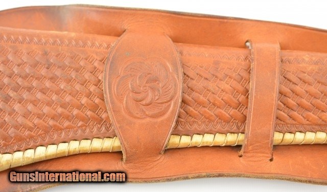 Description: Brauer Bros. 2 loop Single action holster with leather stitched edge. The middle loop has a flower stamping. The marking found under the lower tip of the holster reads "Brauer Bros MFG.Co/ St.Louis/Moose Brand/Sporting Goods/ME 7 1/2". This holster is in excellent condition and fits the Colt single action 7 1/2 perfectly (Colt in the last photo not included) SOLD |