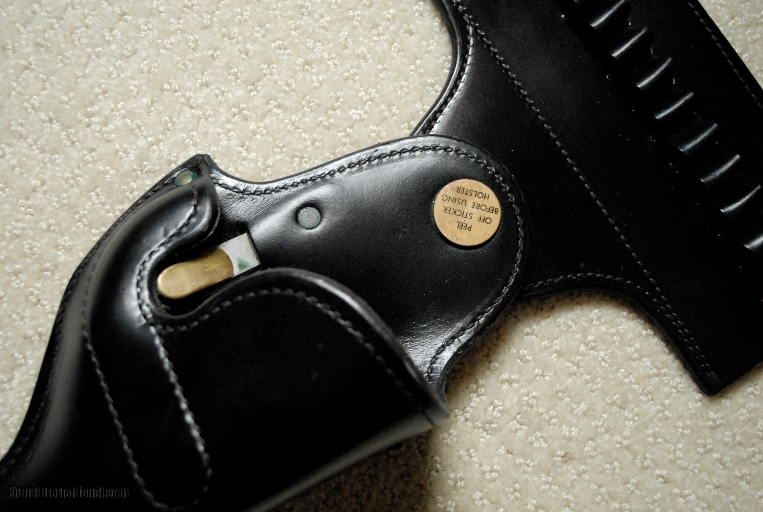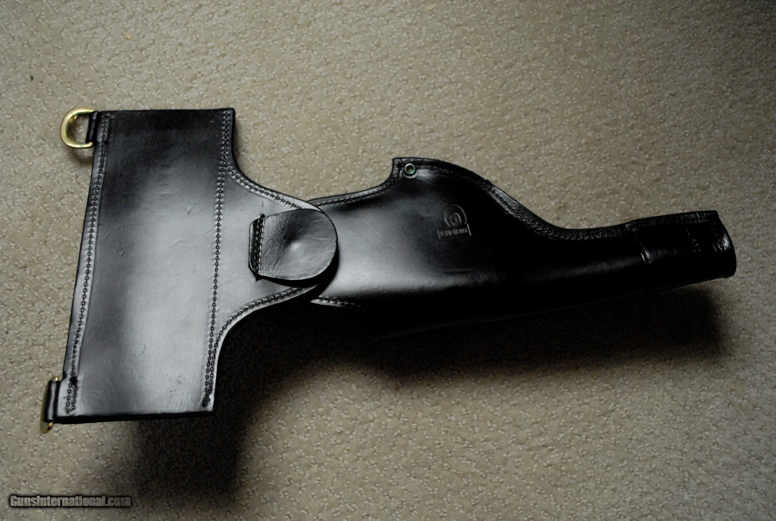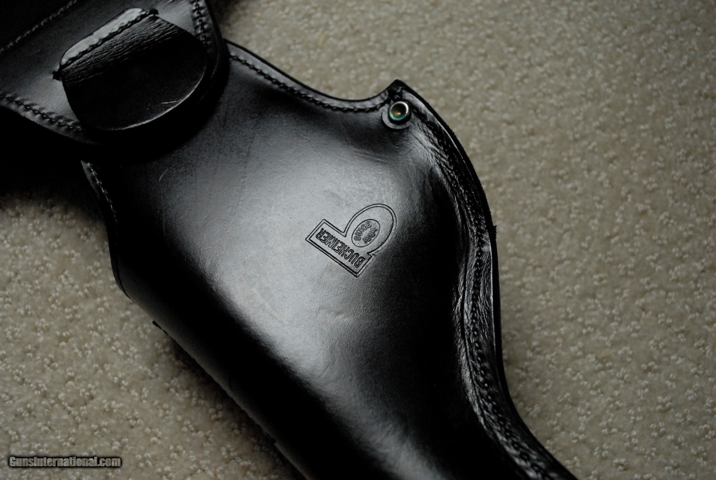 Description: Brand new unused police holster by Bucheimer. This is a spring loaded retention holster to house a 6 inch 38 special revolver. The kind used by uniformed officers when revolvers were the standard. Fantastic unused condition with sticker still covering the chrome pivot point. Great collectable SOLD |