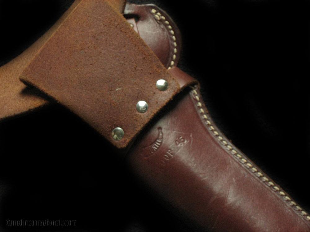 Description: Nice near new Hunter model 152 "Buscadero" rig with 22 cal loops, size medium, with matching holster for the Ruger single six 6" or similar single action revolvers. Spendy to get a new one. SOLD |
