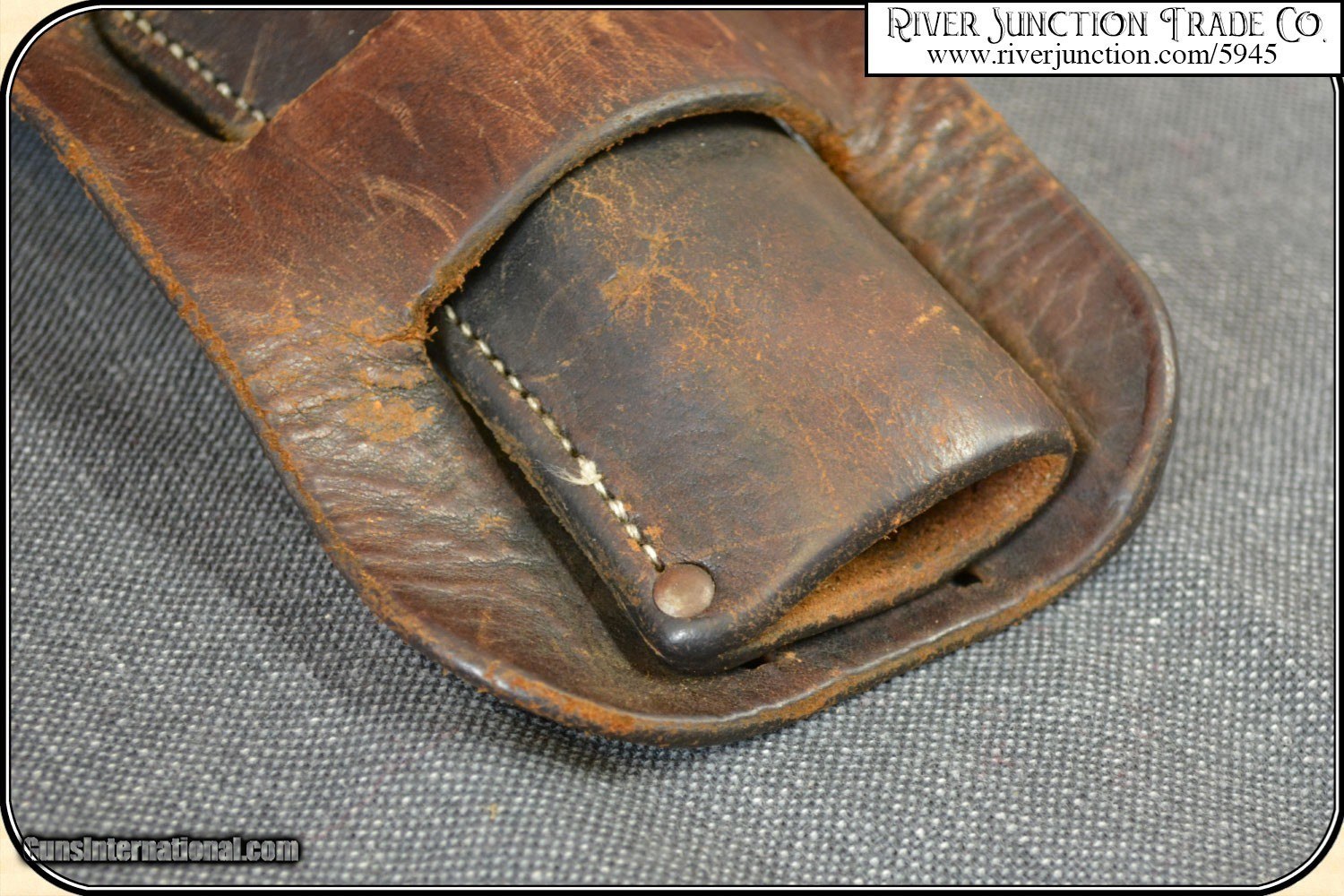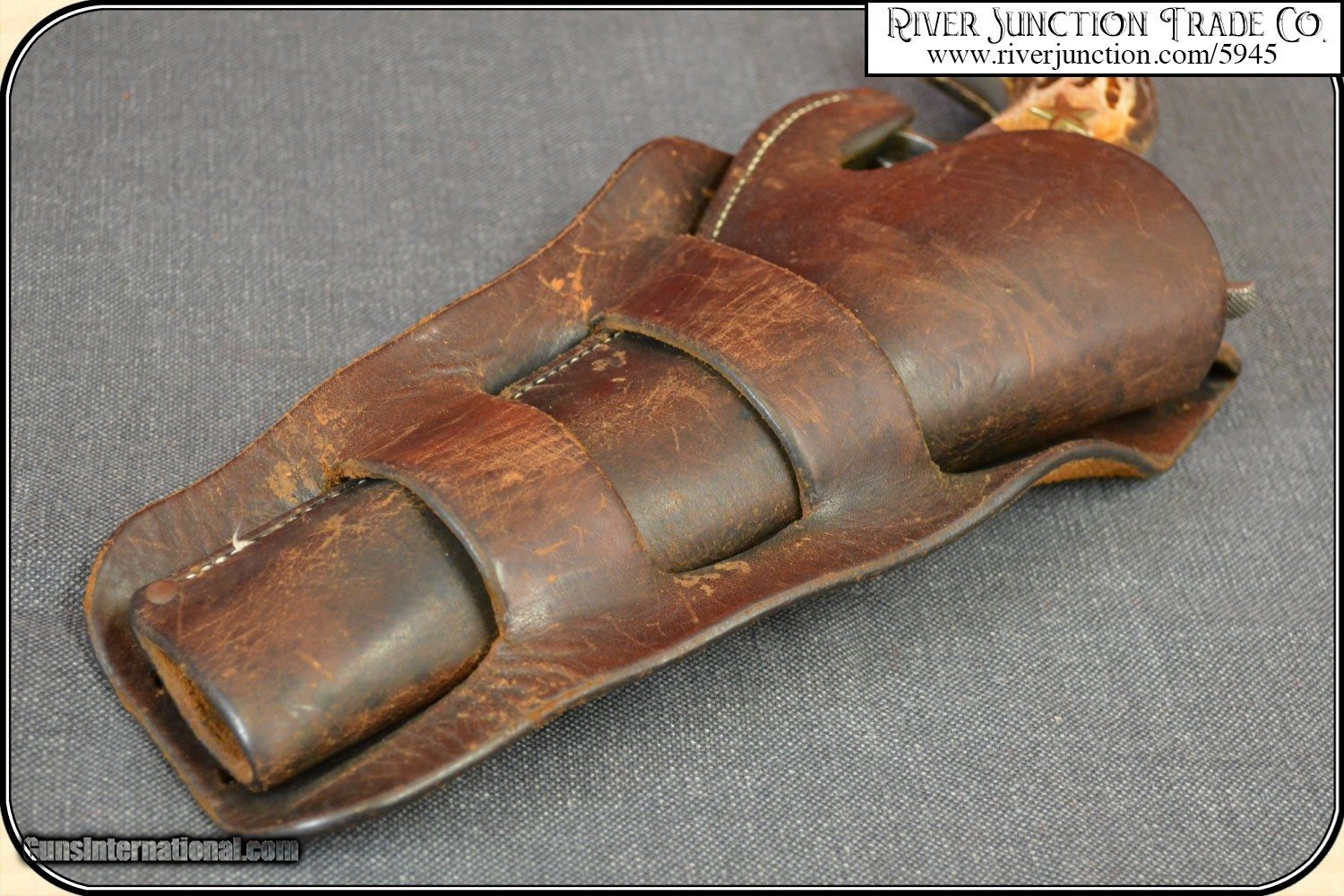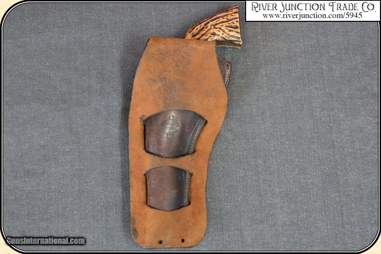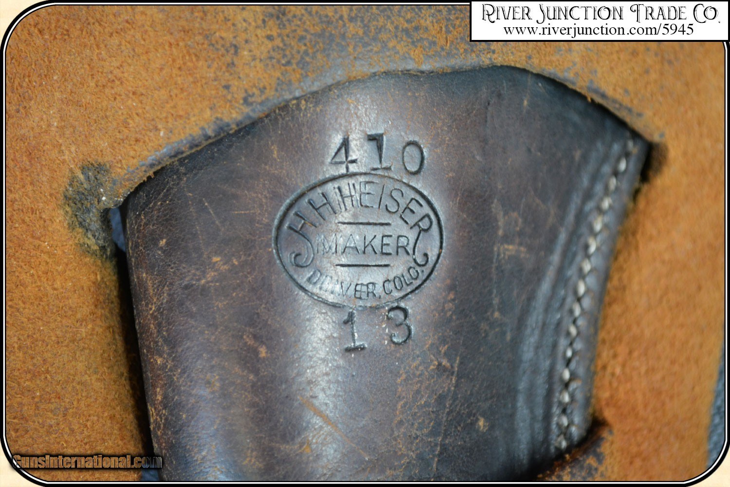 Description: EARLY "H.H. HEISER" HOLSTER Few people realize that Herman H. Heiser was an accomplished saddler in the 1860s and moved to Denver in 1874 to open a shop there. This holster takes a 4 3/4 or 5 1/2" Colt S.A.A. or a 6" D.A. perfectly. A unique addition suitable for the finest collection. A H. H. Heiser model #410 Double Loop Right Side Holster in very good condition. No loose stitching, no scars, only a few scratches, just nice even rich patina. The Hermann H. Heiser Manufacturing Co. made this beautiful holster from Premium Skirting Leather. This holster is properly marked with the H. H. Heiser Denver Colo. Trademark in an Oval. The mark, which dates this holster from 1910. You will note it has no safety strap as many Heiser holsters have, giving it the feel and appearance of an early frontier holster. The leather is fully alive and will provide a century of wear ready to use. Payment: Item, can be ordered on line with a credit card or paypal on our sight. Just Google (riverjunction) and type in the River Junction Trade Co. item number (5945) in the search box. Before you checkout you will see shipping cost and total. OR If you prefer: Pay by cash, postal money order, cashiers check, personal & business checks. We wait for checks to clear. We always answer questions and entertain offers. Have questions? Call me 563-880-4588. Jim SOLD |