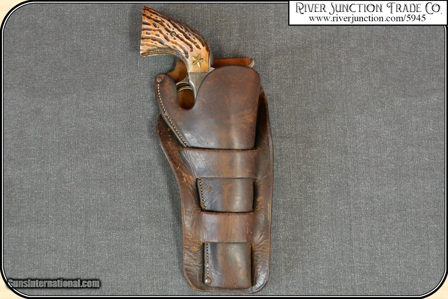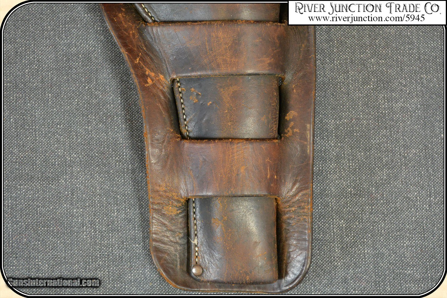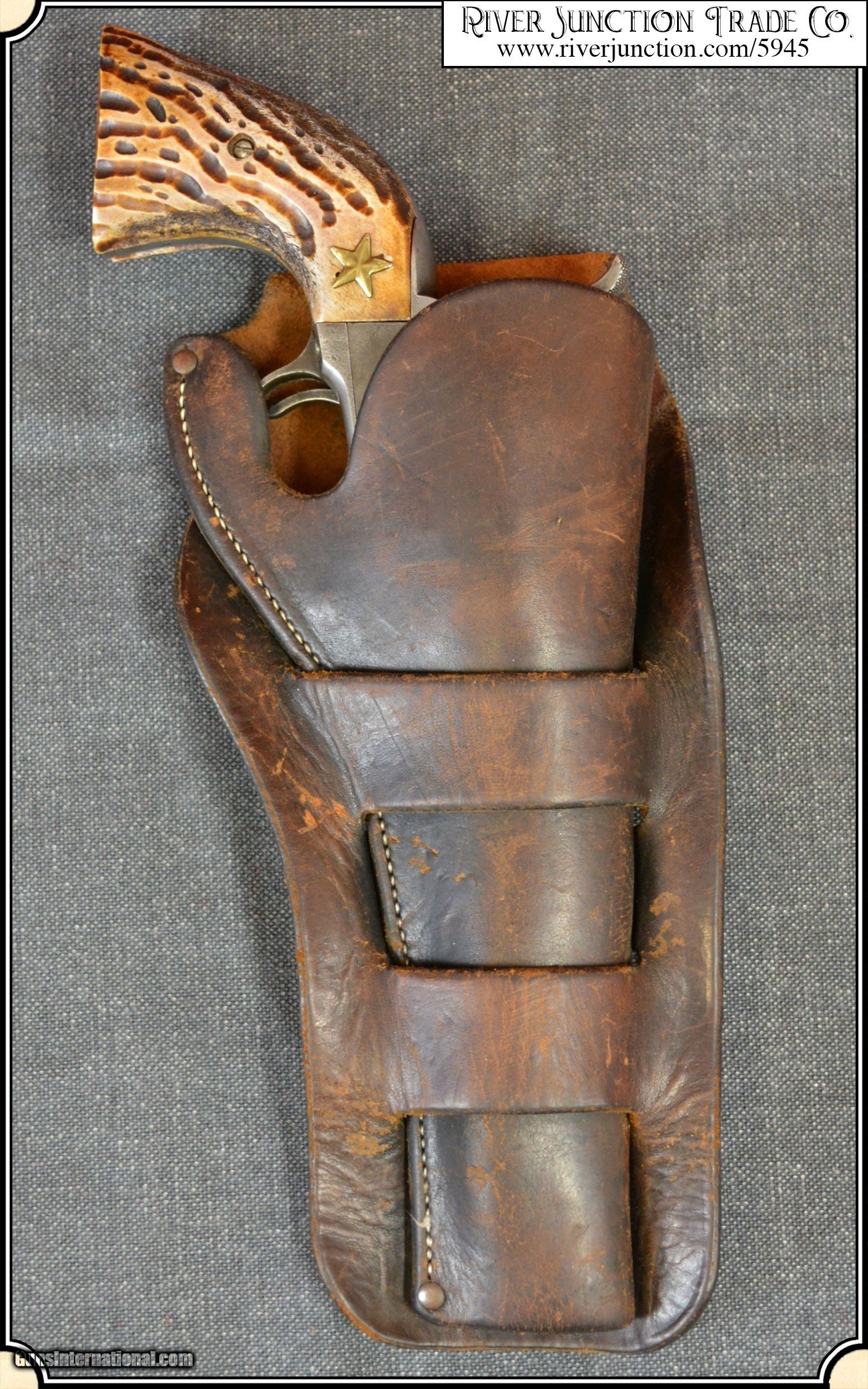 Description: EARLY "H.H. HEISER" HOLSTER Few people realize that Herman H. Heiser was an accomplished saddler in the 1860s and moved to Denver in 1874 to open a shop there. This holster takes a 4 3/4 or 5 1/2" Colt S.A.A. or a 6" D.A. perfectly. A unique addition suitable for the finest collection. A H. H. Heiser model #410 Double Loop Right Side Holster in very good condition. No loose stitching, no scars, only a few scratches, just nice even rich patina. The Hermann H. Heiser Manufacturing Co. made this beautiful holster from Premium Skirting Leather. This holster is properly marked with the H. H. Heiser Denver Colo. Trademark in an Oval. The mark, which dates this holster from 1910. You will note it has no safety strap as many Heiser holsters have, giving it the feel and appearance of an early frontier holster. The leather is fully alive and will provide a century of wear ready to use. Payment: Item, can be ordered on line with a credit card or paypal on our sight. Just Google (riverjunction) and type in the River Junction Trade Co. item number (5945) in the search box. Before you checkout you will see shipping cost and total. OR If you prefer: Pay by cash, postal money order, cashiers check, personal & business checks. We wait for checks to clear. We always answer questions and entertain offers. Have questions? Call me 563-880-4588. Jim SOLD |