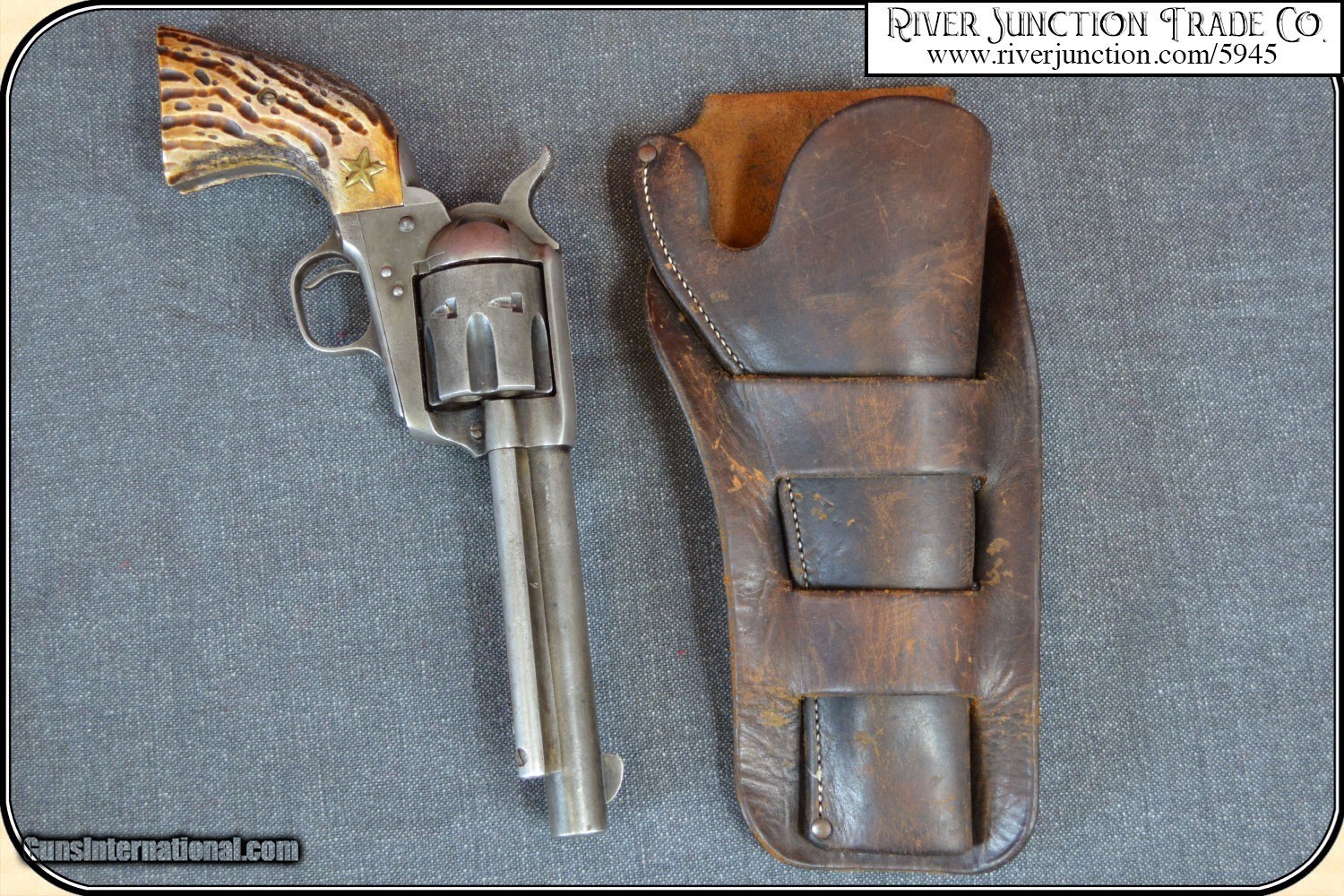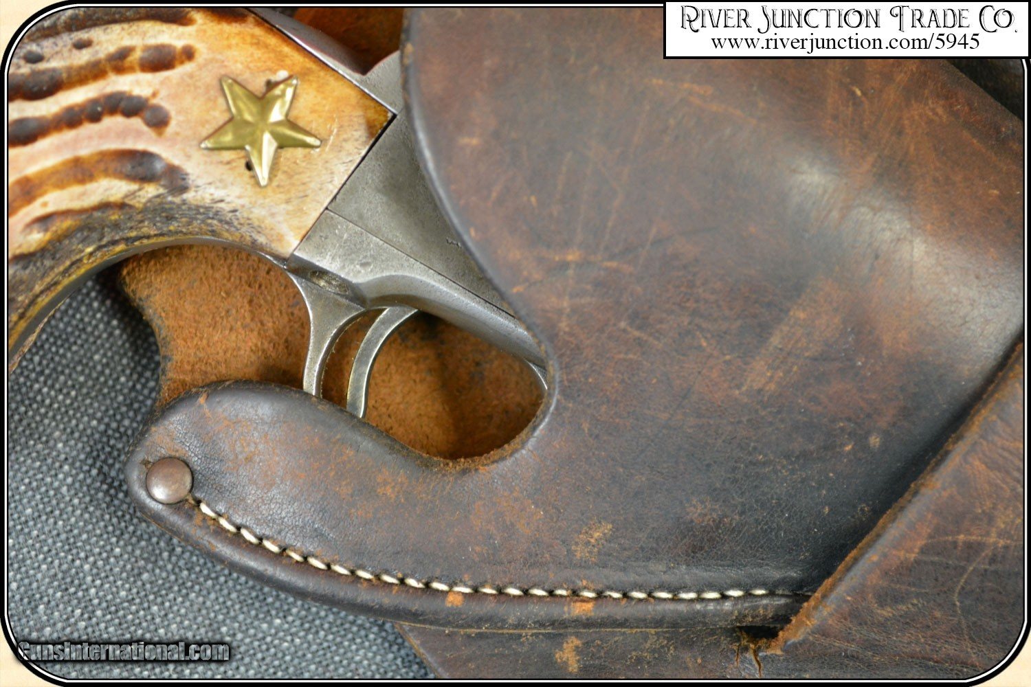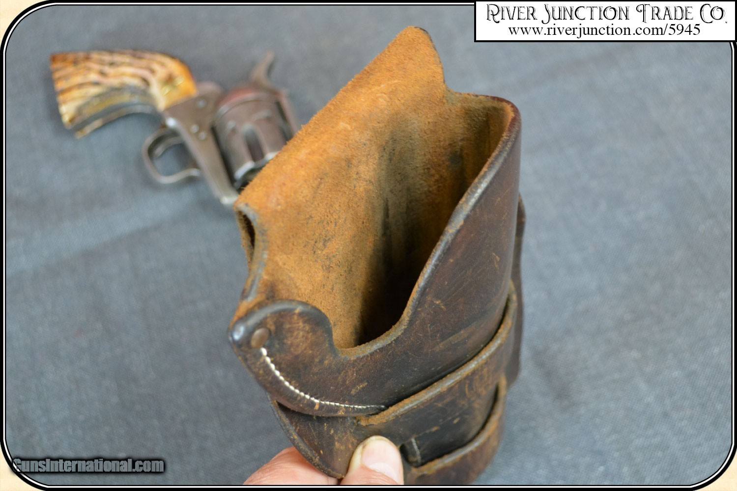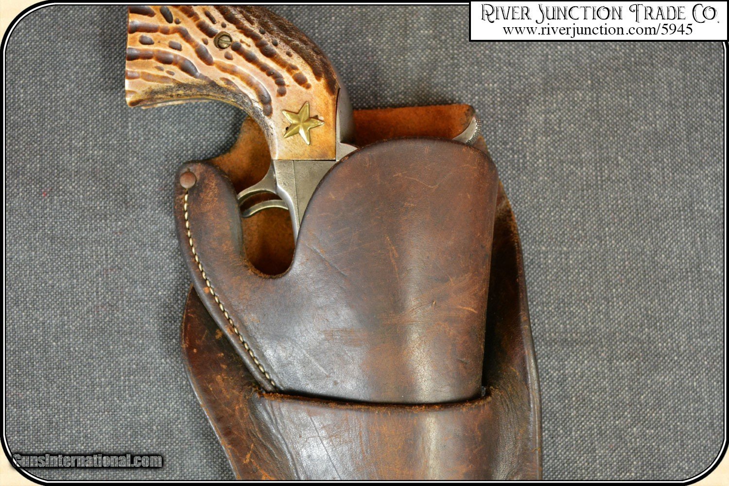 Description: EARLY "H.H. HEISER" HOLSTER Few people realize that Herman H. Heiser was an accomplished saddler in the 1860s and moved to Denver in 1874 to open a shop there. This holster takes a 4 3/4 or 5 1/2" Colt S.A.A. or a 6" D.A. perfectly. A unique addition suitable for the finest collection. A H. H. Heiser model #410 Double Loop Right Side Holster in very good condition. No loose stitching, no scars, only a few scratches, just nice even rich patina. The Hermann H. Heiser Manufacturing Co. made this beautiful holster from Premium Skirting Leather. This holster is properly marked with the H. H. Heiser Denver Colo. Trademark in an Oval. The mark, which dates this holster from 1910. You will note it has no safety strap as many Heiser holsters have, giving it the feel and appearance of an early frontier holster. The leather is fully alive and will provide a century of wear ready to use. Payment: Item, can be ordered on line with a credit card or paypal on our sight. Just Google (riverjunction) and type in the River Junction Trade Co. item number (5945) in the search box. Before you checkout you will see shipping cost and total. OR If you prefer: Pay by cash, postal money order, cashiers check, personal & business checks. We wait for checks to clear. We always answer questions and entertain offers. Have questions? Call me 563-880-4588. Jim SOLD |