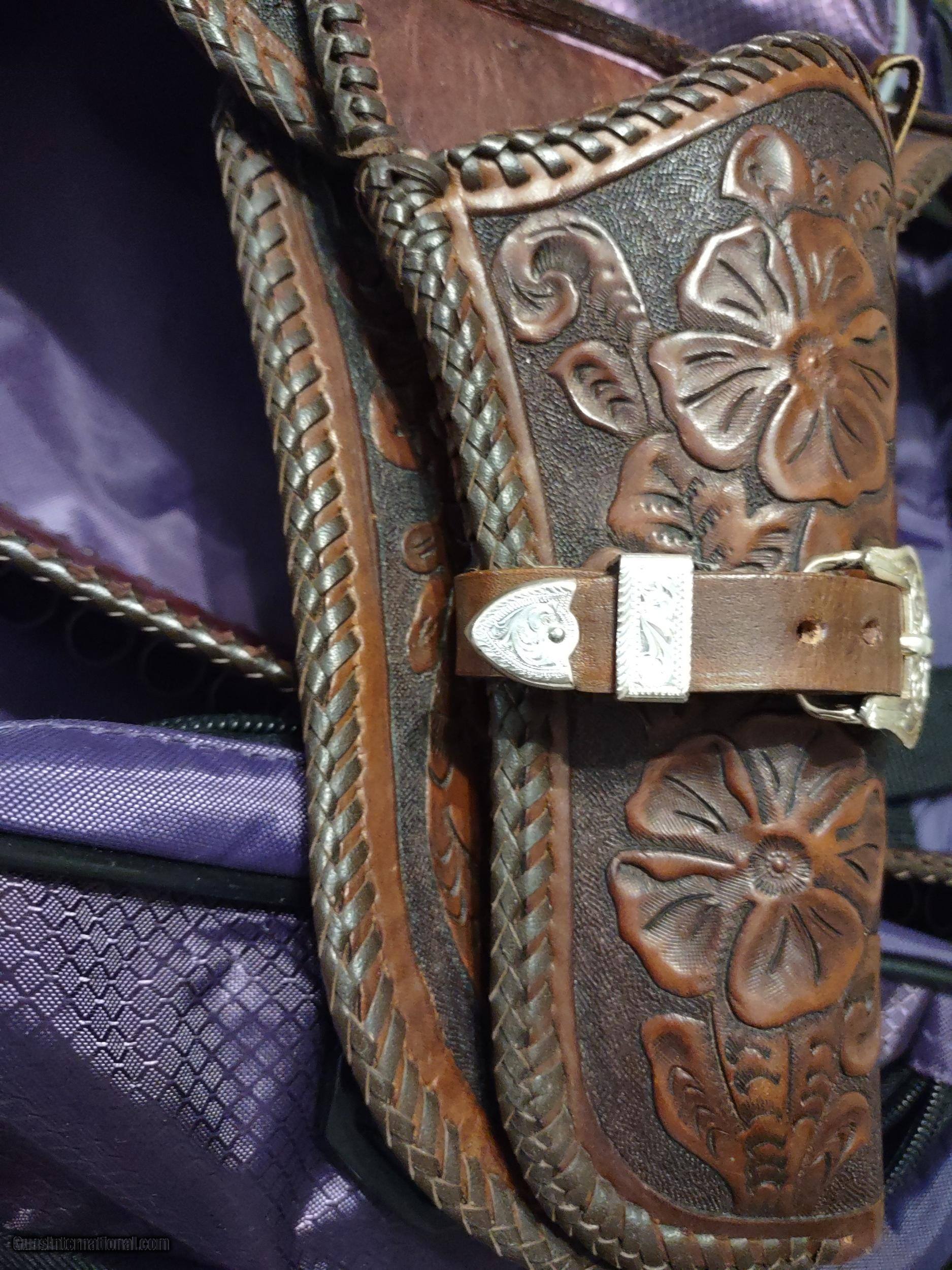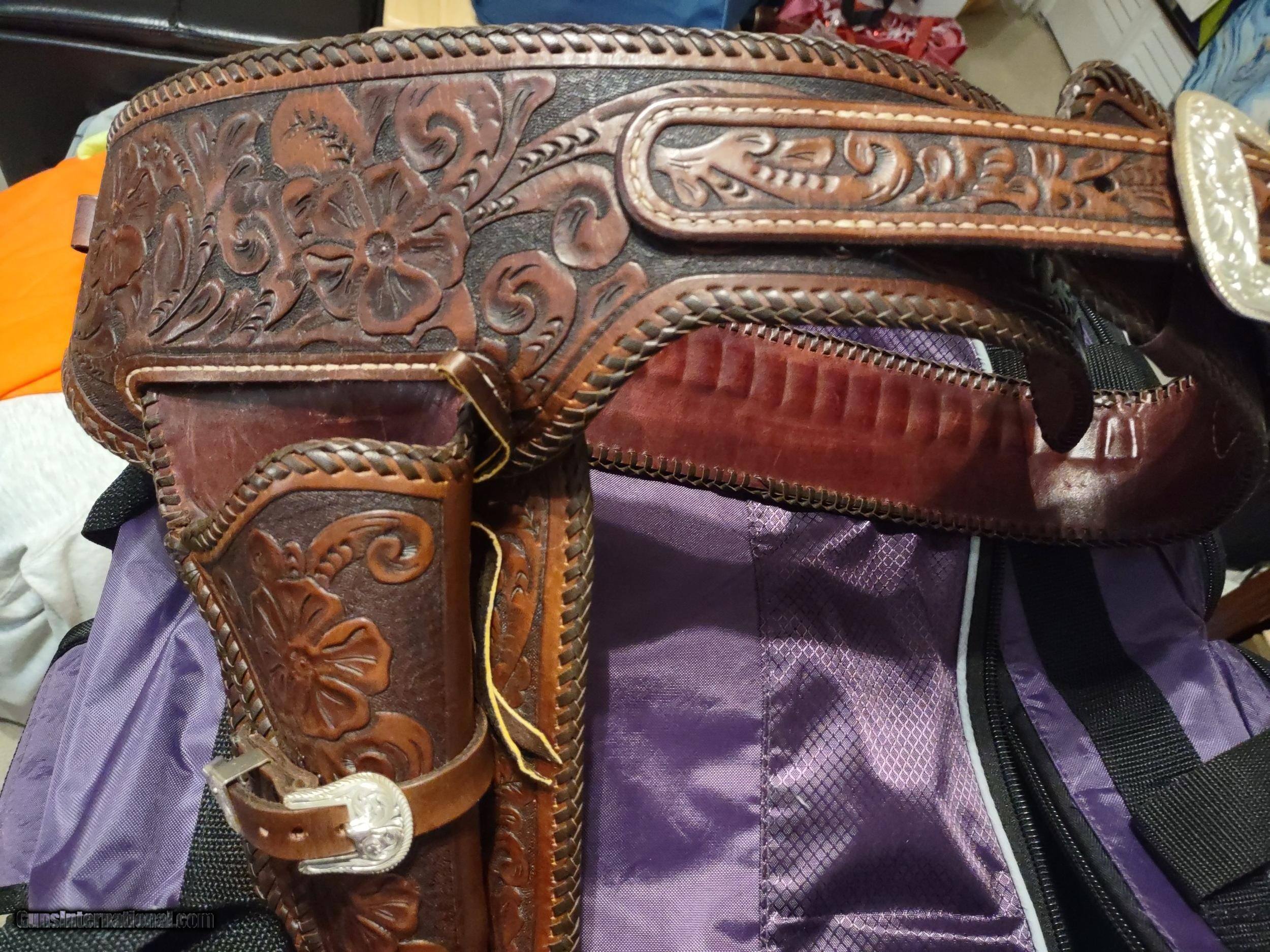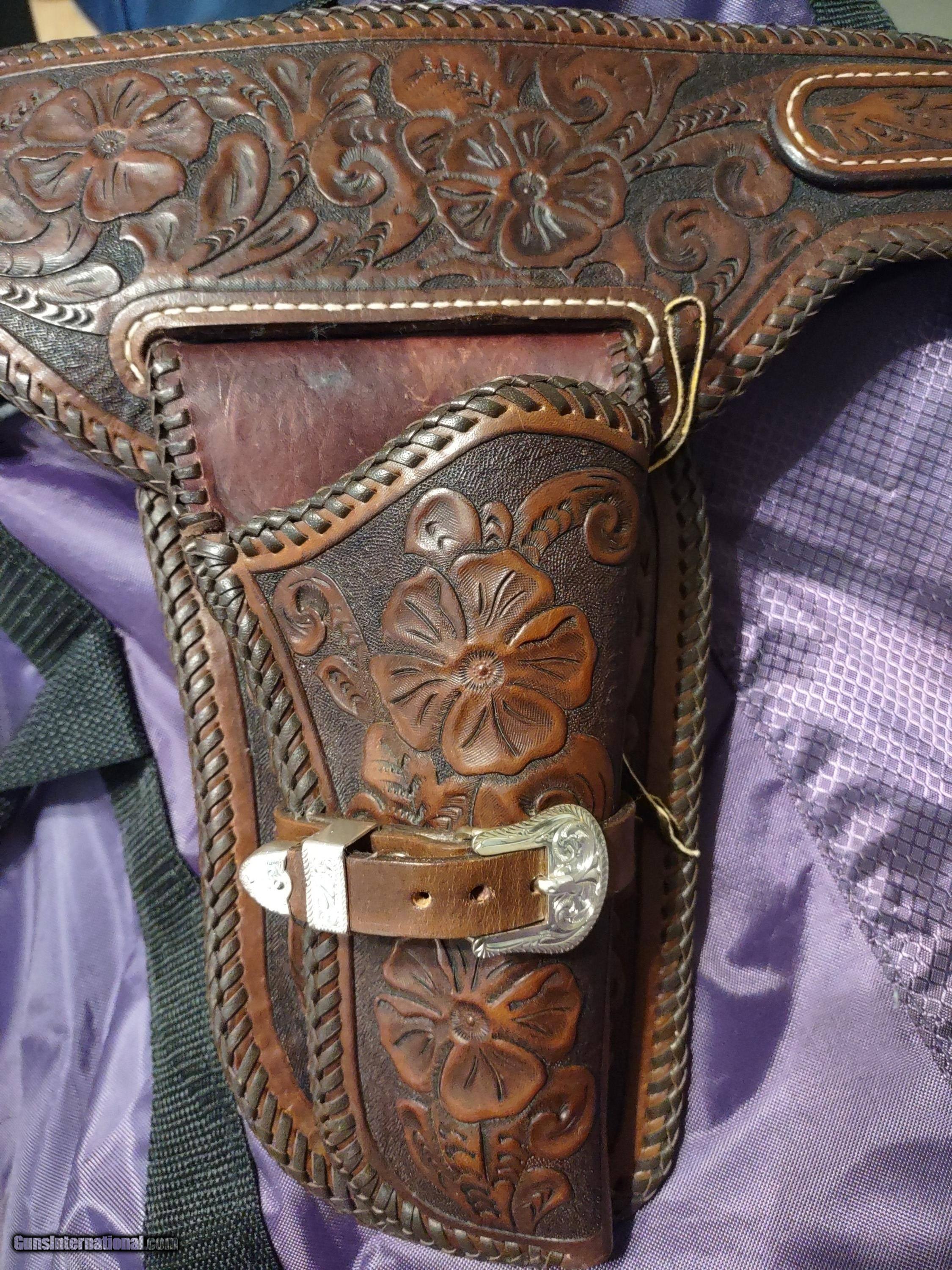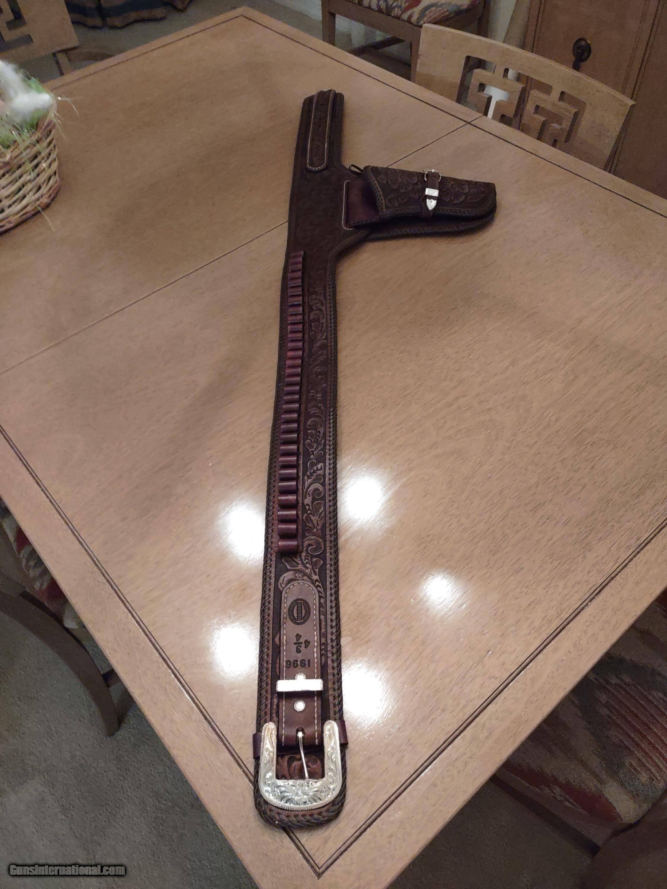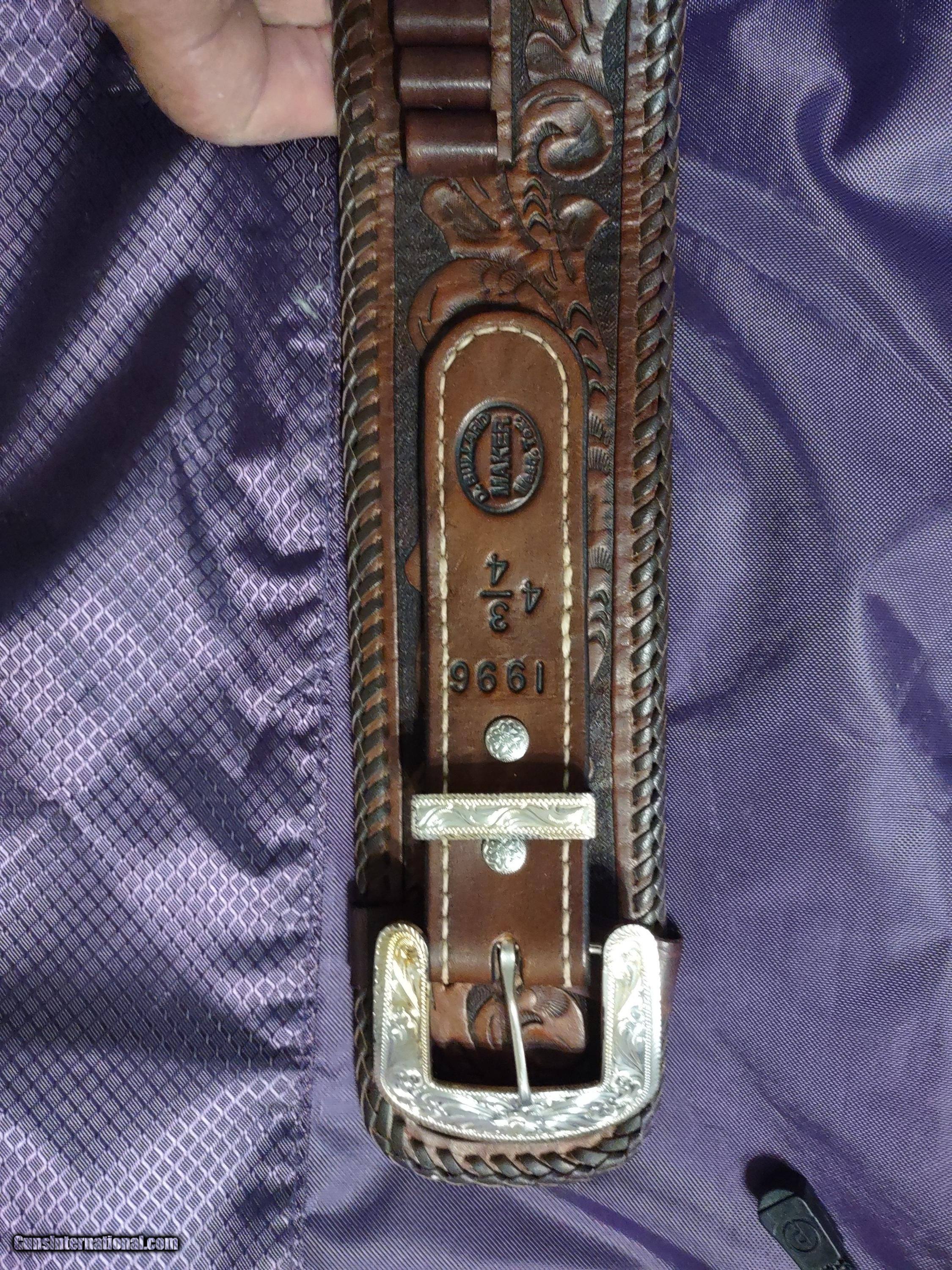 Description: D. BULLARD LEATHER COMPANY (formerly in Mesquite, Texas now in Cooper, Texas) gorgeous 3" wide Western, right hand, revolver rig with 30 cartridge loops for .44 or .45 caliber ammo and will comfortably fit a waist from 35" to 41" with overall length of 49". The holster is for a revolver with a 4" or 5" barrel. This belt was meticulously hand carved in a floral motif and accented with genuine silver plate buckles, tips and guides from Montana Silversmiths in Columbus, Montana. This rig is all original and in perfect condition. A real masterpiece...the best I have ever seen! The price is $475 delivered to your home or workplace. Call or text me at 318-780-4242 if you are interested. SOLD |