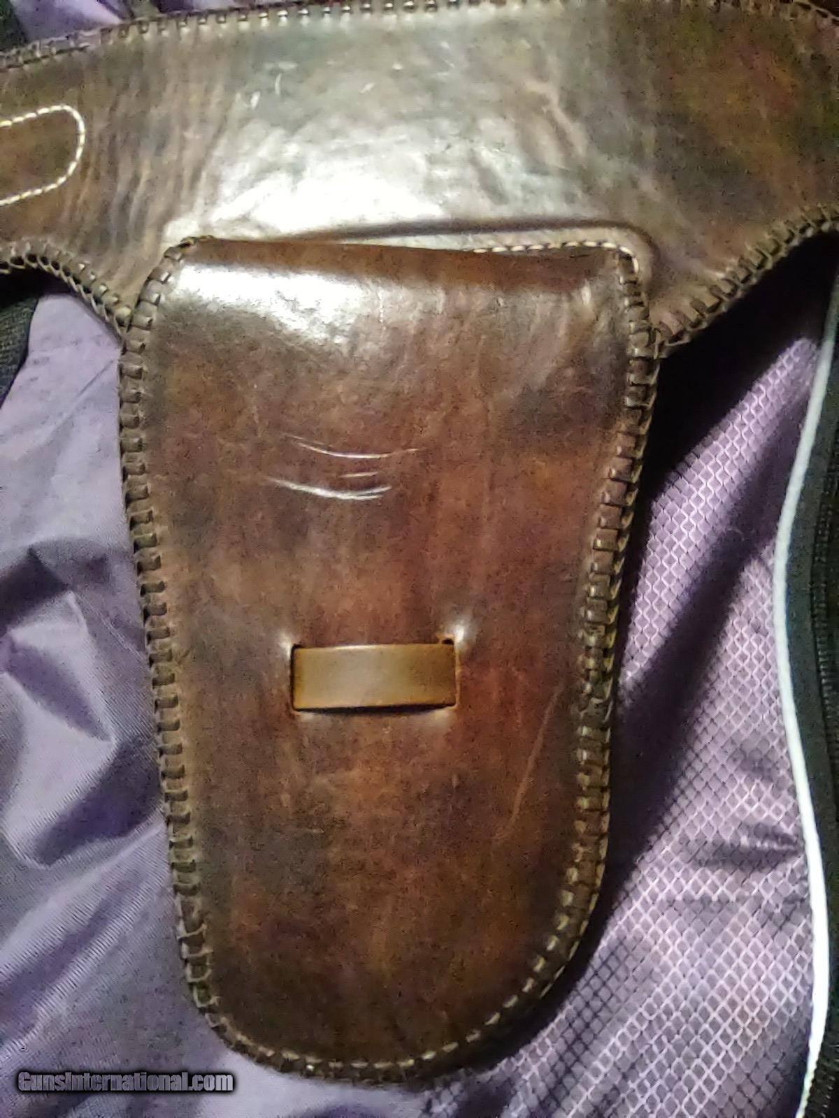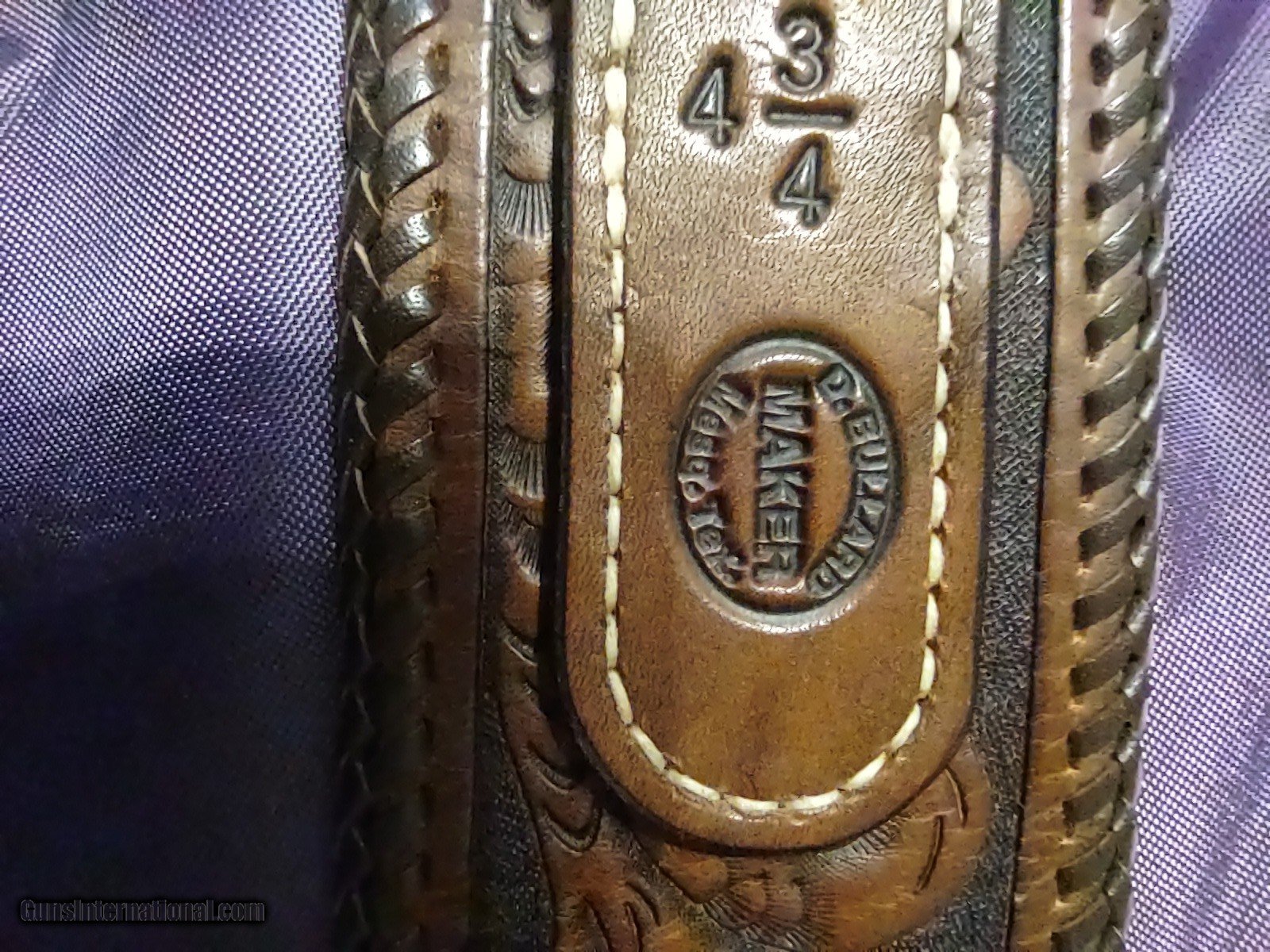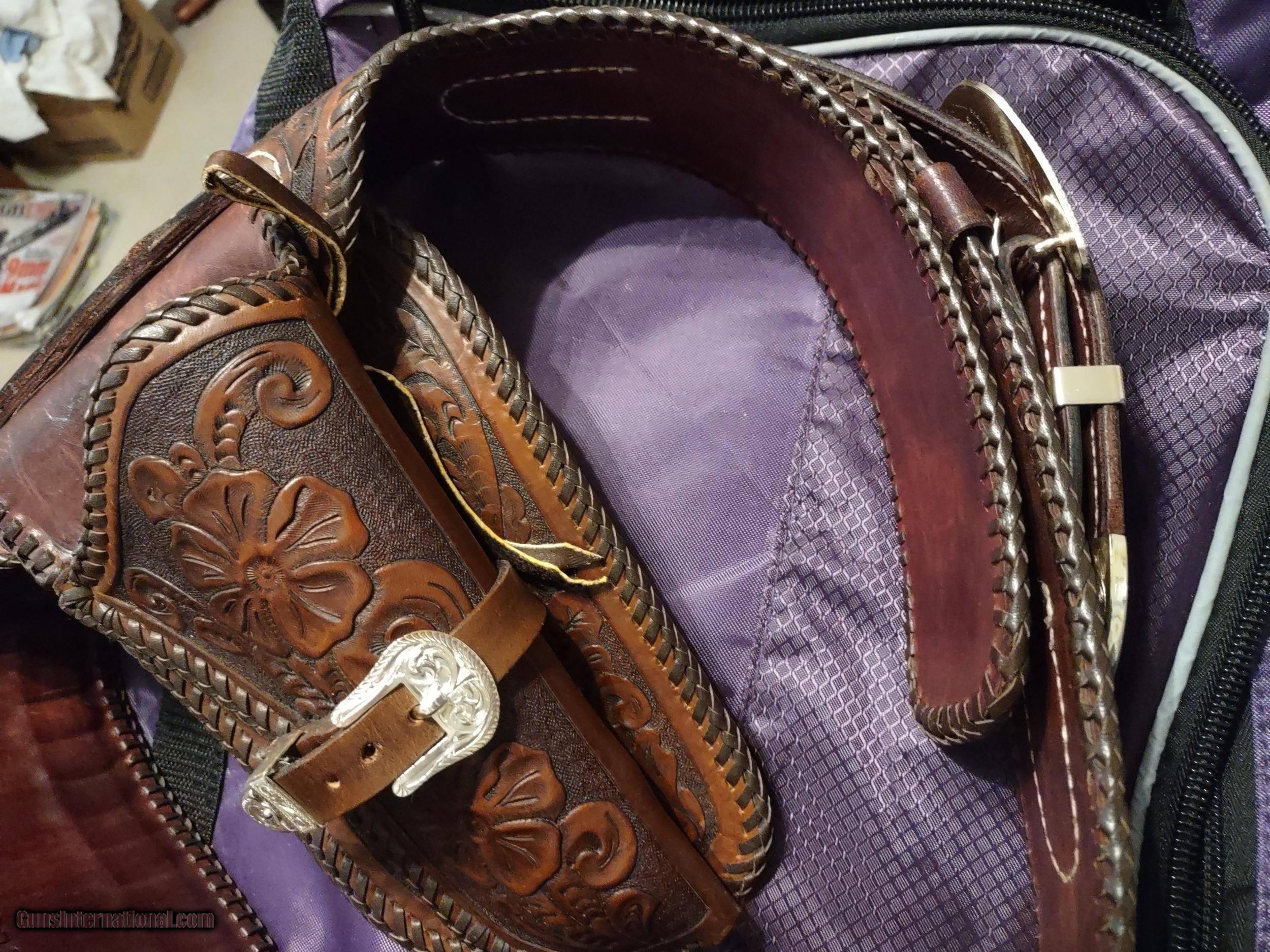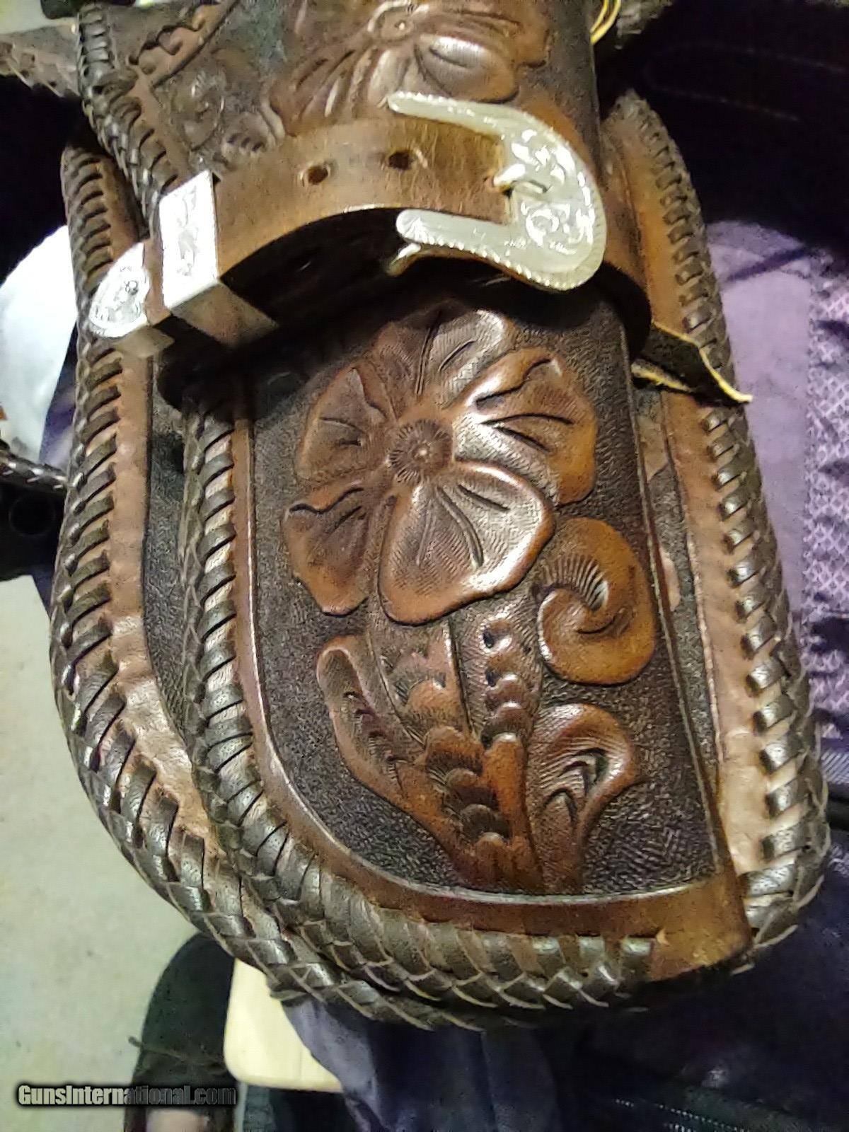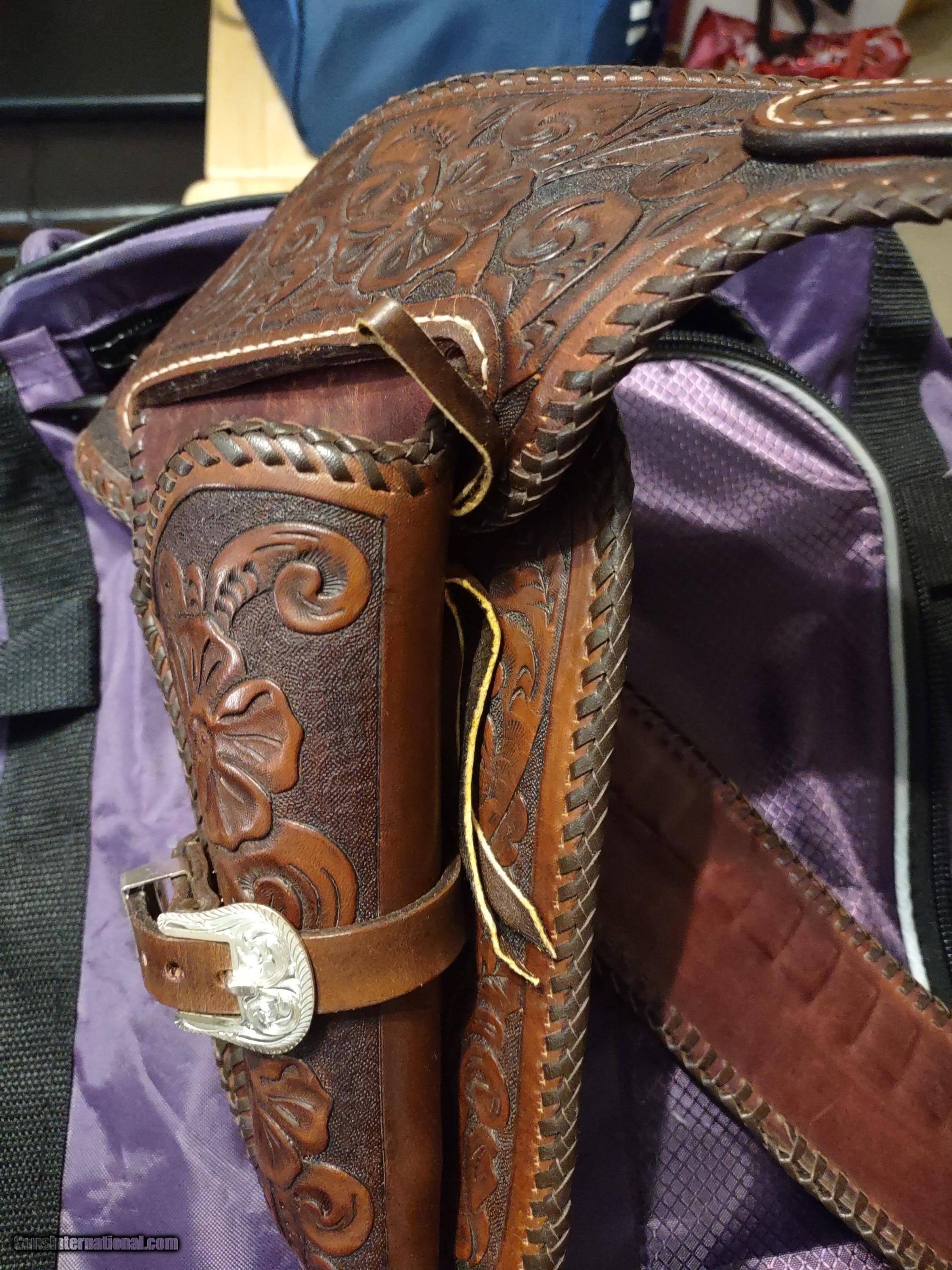Description: D. BULLARD LEATHER COMPANY (formerly in Mesquite, Texas now in Cooper, Texas) gorgeous 3" wide Western, right hand, revolver rig with 30 cartridge loops for .44 or .45 caliber ammo and will comfortably fit a waist from 35" to 41" with overall length of 49". The holster is for a revolver with a 4" or 5" barrel. This belt was meticulously hand carved in a floral motif and accented with genuine silver plate buckles, tips and guides from Montana Silversmiths in Columbus, Montana. This rig is all original and in perfect condition. A real masterpiece...the best I have ever seen! The price is $475 delivered to your home or workplace. Call or text me at 318-780-4242 if you are interested. SOLD |