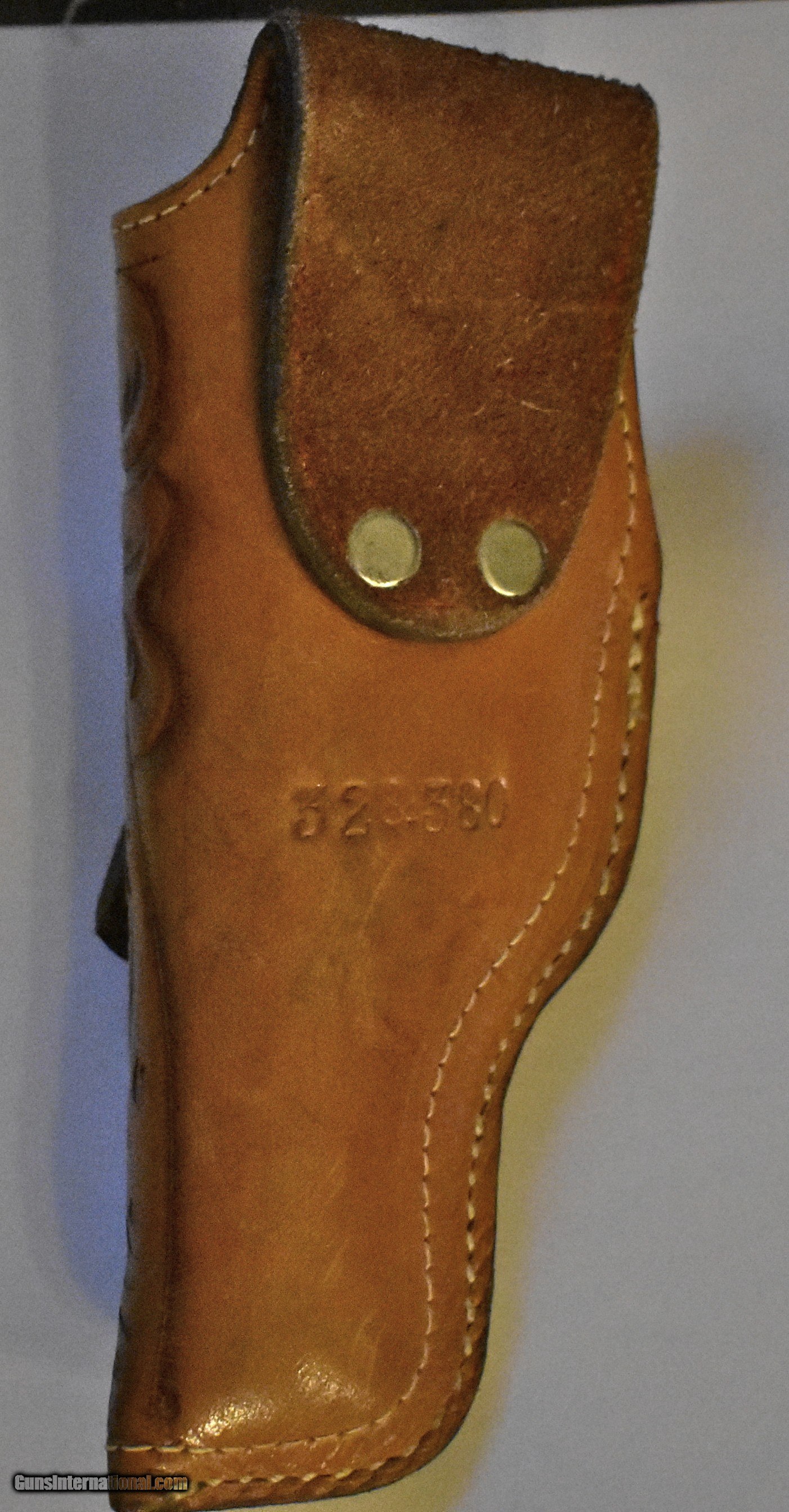 Description: An embossed leather holster for a Colt 32 or 380 semi auto pistol. Circa 1940s or 1950s. Excellent condition showing almost no use. No makers name on it,but high quality workmanship. Stamped 32/380 on the back loop. A nice vintage addition if you have a Colt auto. SOLD |