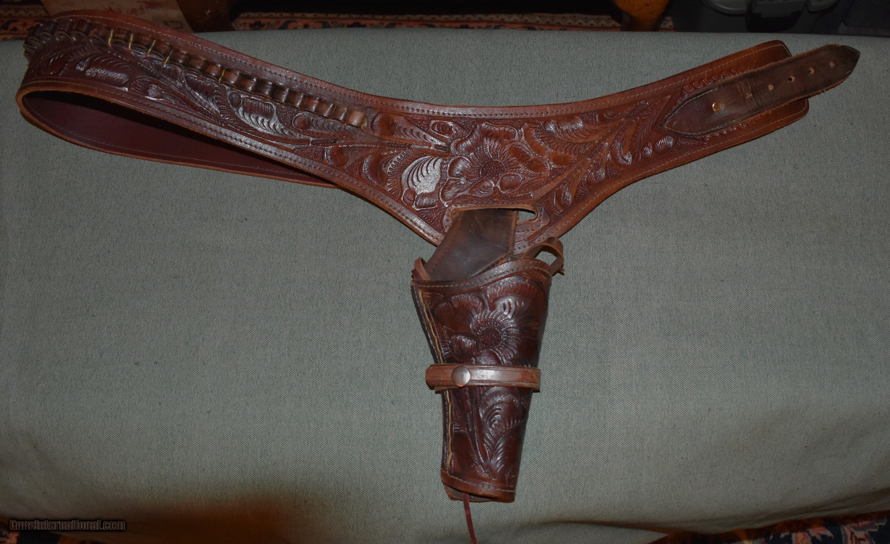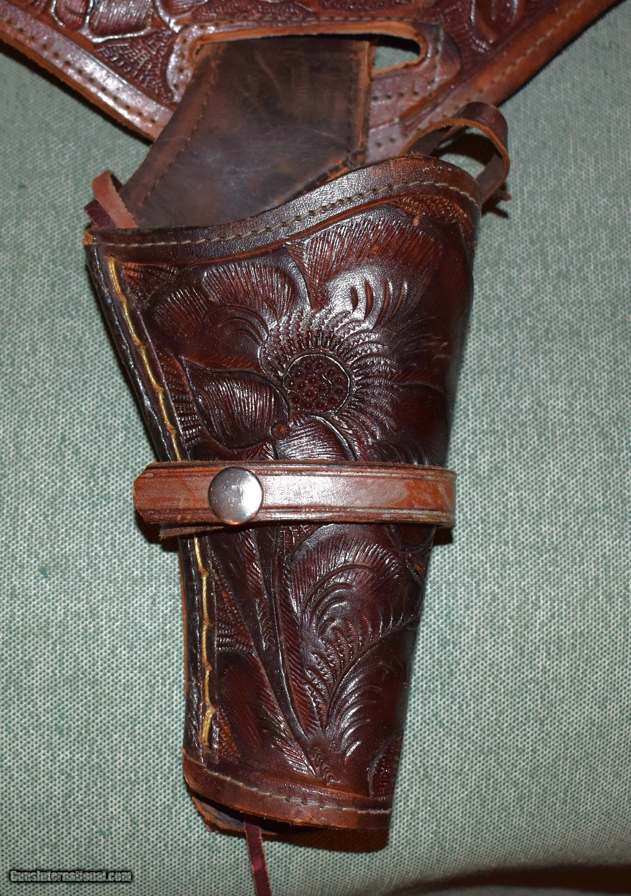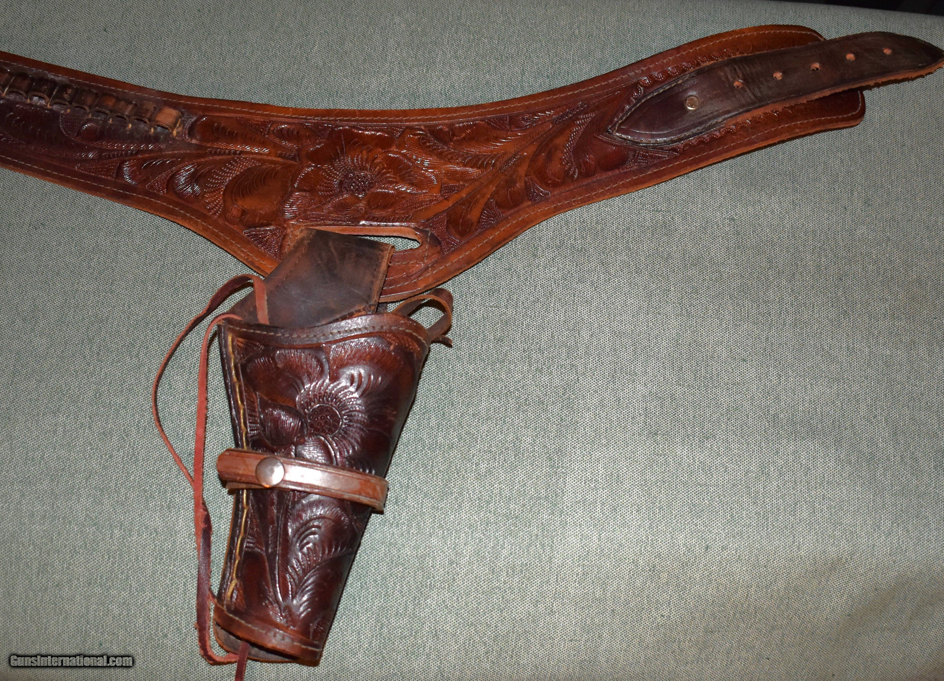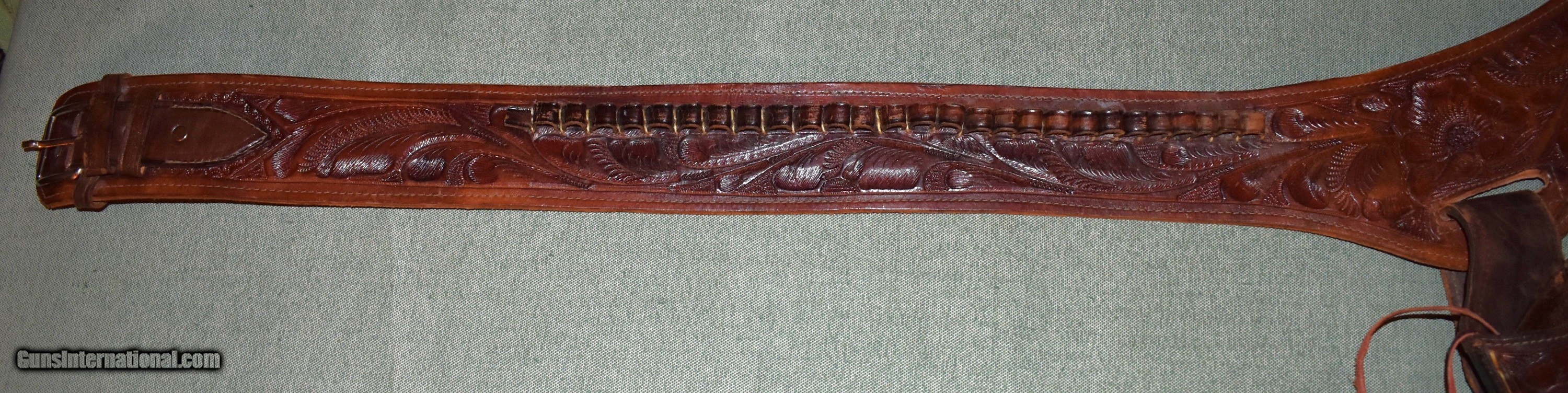 Description: A nicely embossed leather shell belt and holster Very good condition. Will fit 36" to 40" waist. The holster will fit a 5" barreled revolver. Price includes shipping. SOLD |