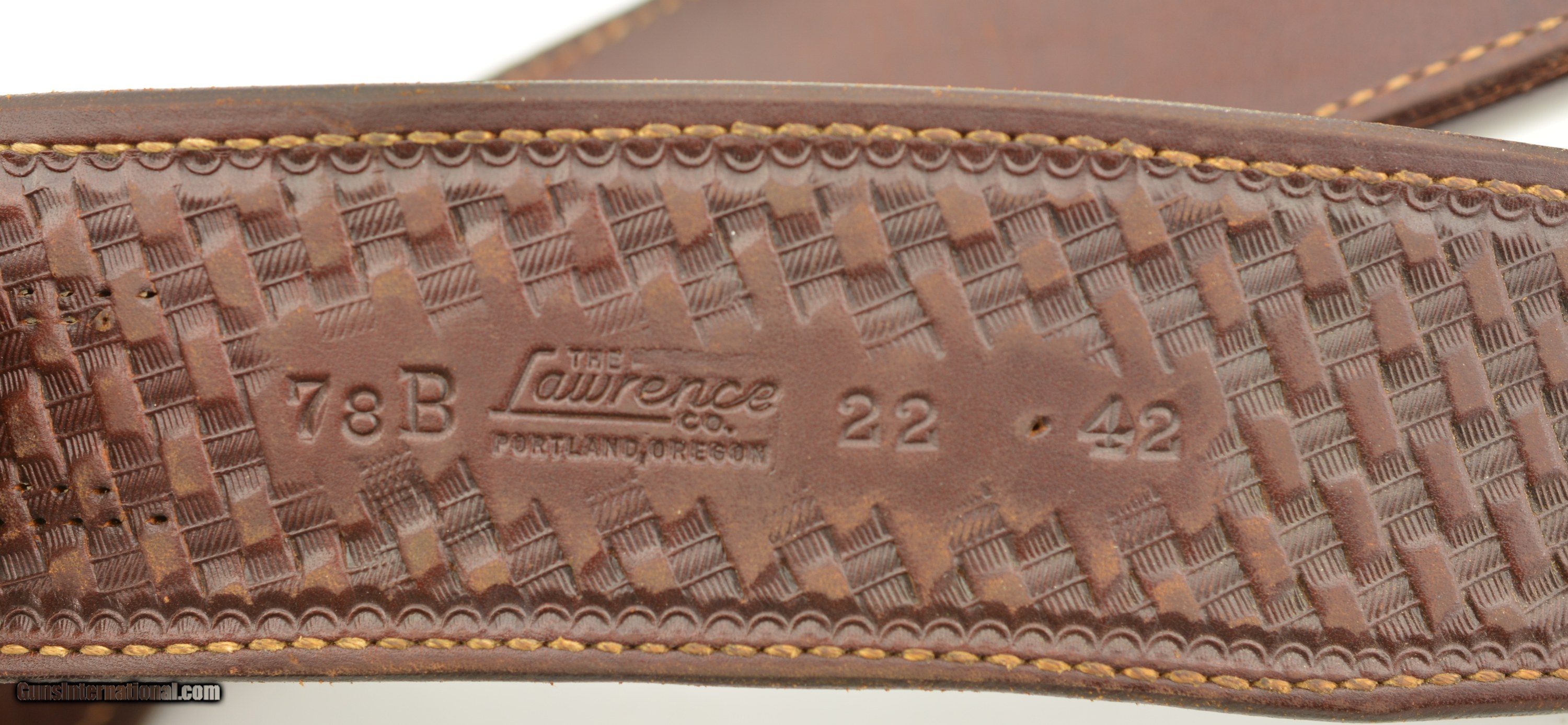 Description: Holster has a maker mark 78B/ THE GEORGE / LAWRENCE CO. / PORTLAND OREGON / 657. The holster is in nice overall condition, only thing I would point out is the leather just above the opening to the top, it shows marks from many returns to holster. All the stitching appears tight and intact. The holster is for revolver with over 4 inch up to a 6.5 barrel. The brown leather belt is 2.5 inch wide with a very strong basket weave. It has the same makers marks 78B , 22 and is labeled 42 for size. It has 25 loops for 22 cal. Has many years of service to go. Please see pictures for details. SOLD Manufacturer: Lawrence Model: Holster |
