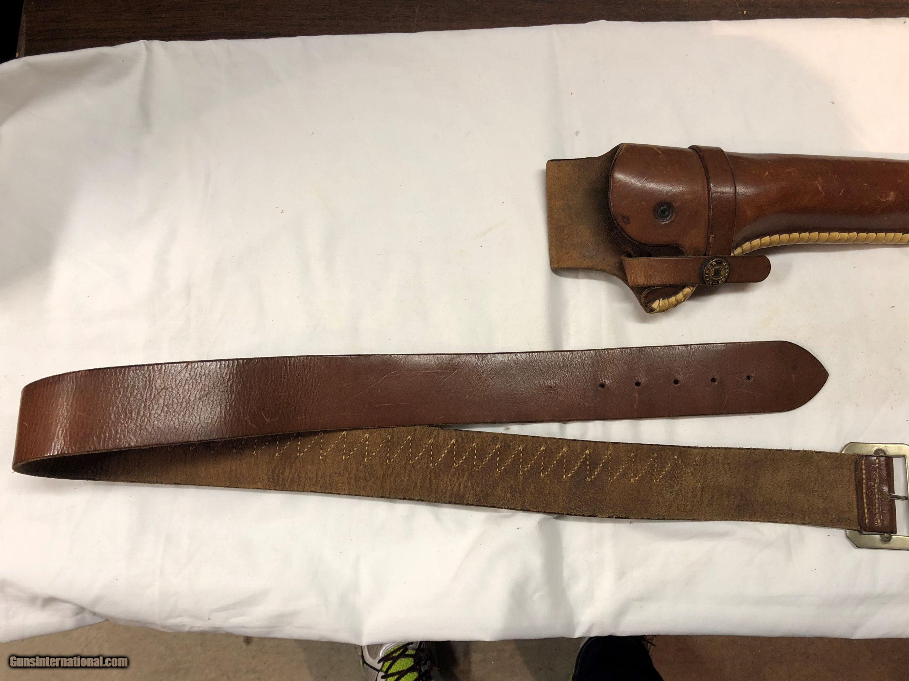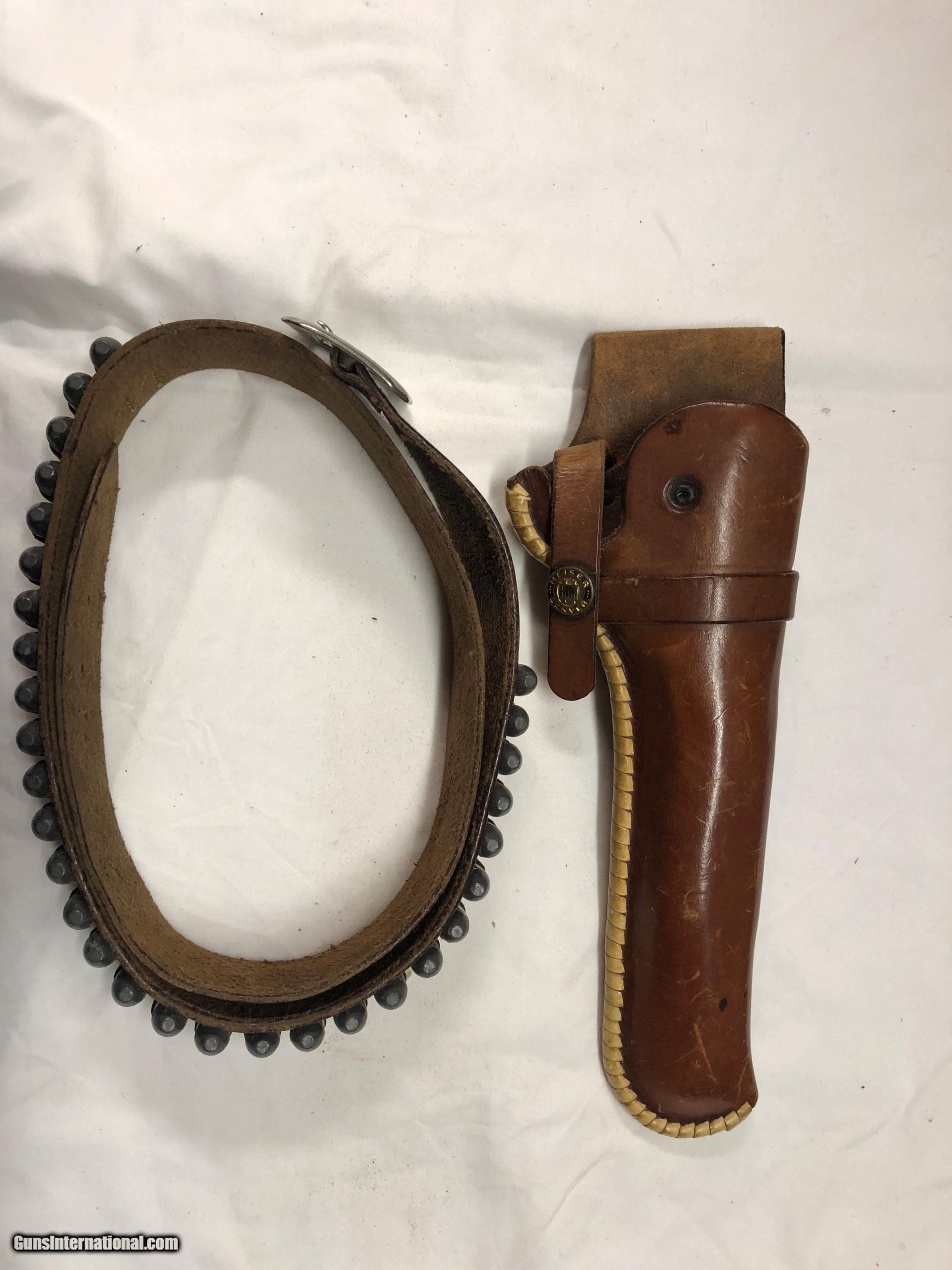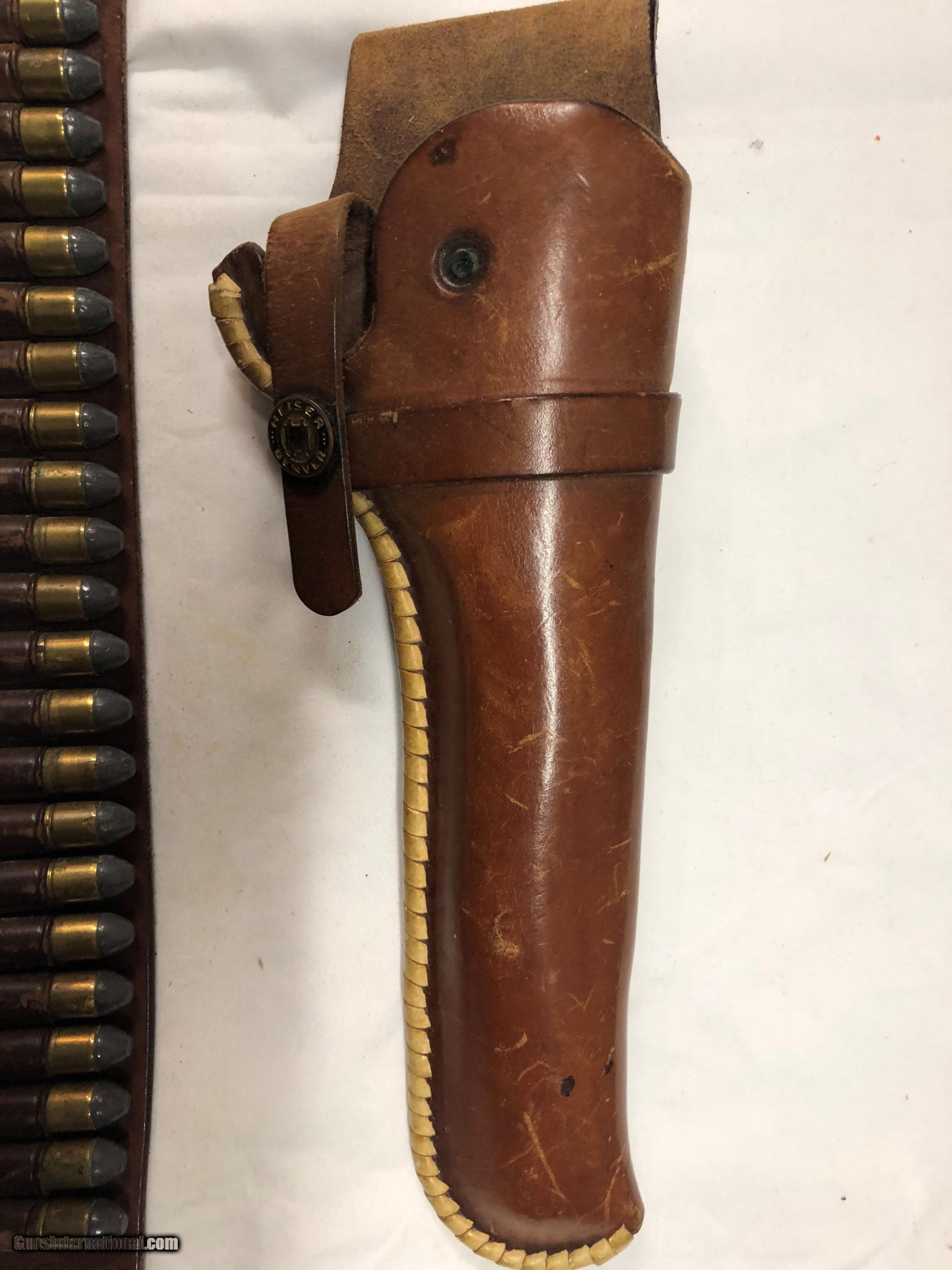 Description: Heiser-Denver holster and gun belt for 7 1/2" Calt SAA. VG condition. Circa early 1900's. Available with or without the period ammo at no differance in selling price. Belt is 44" long. 30 cartridge loops for 45 LC. Snap on holster is broken. SOLD |