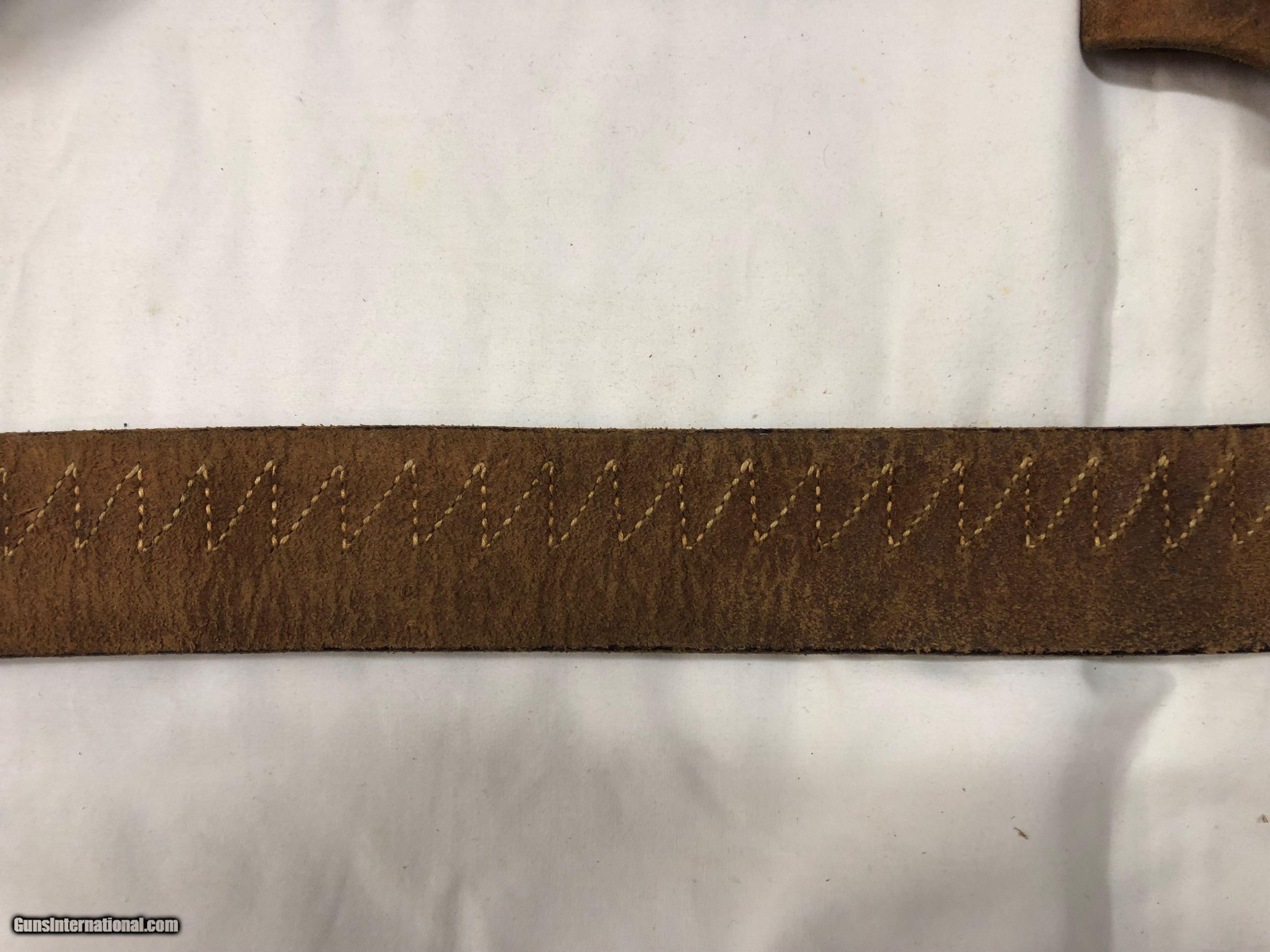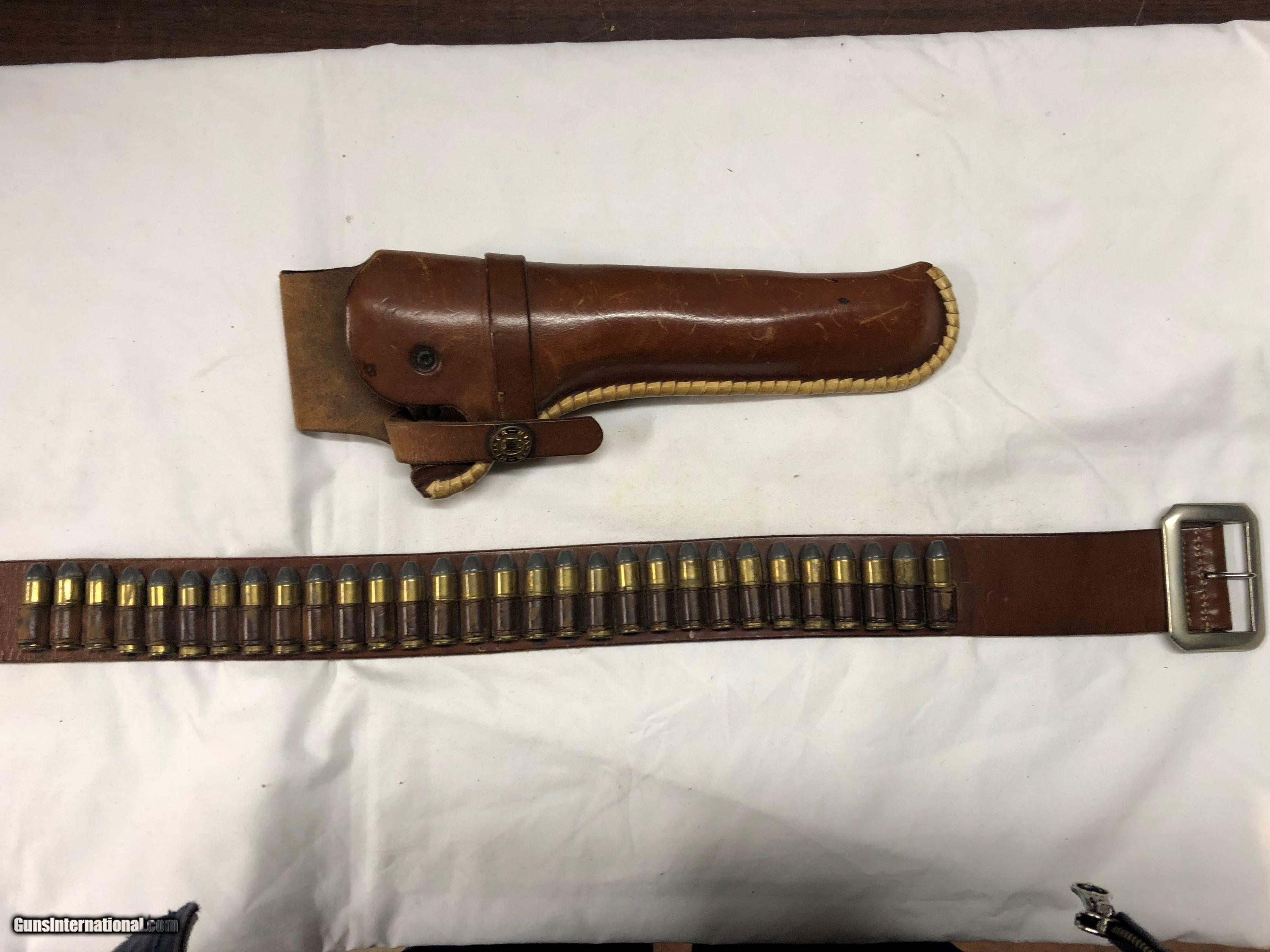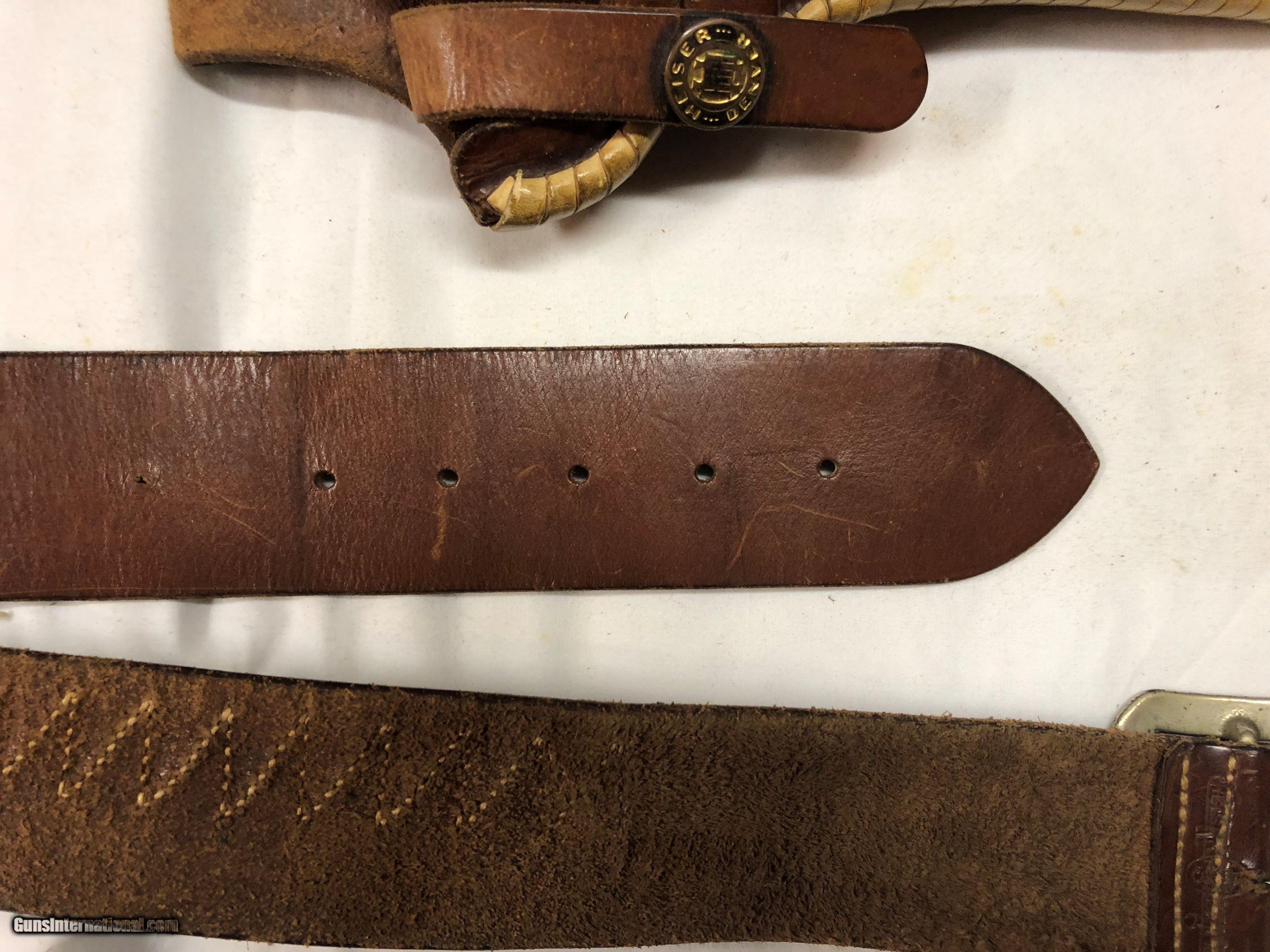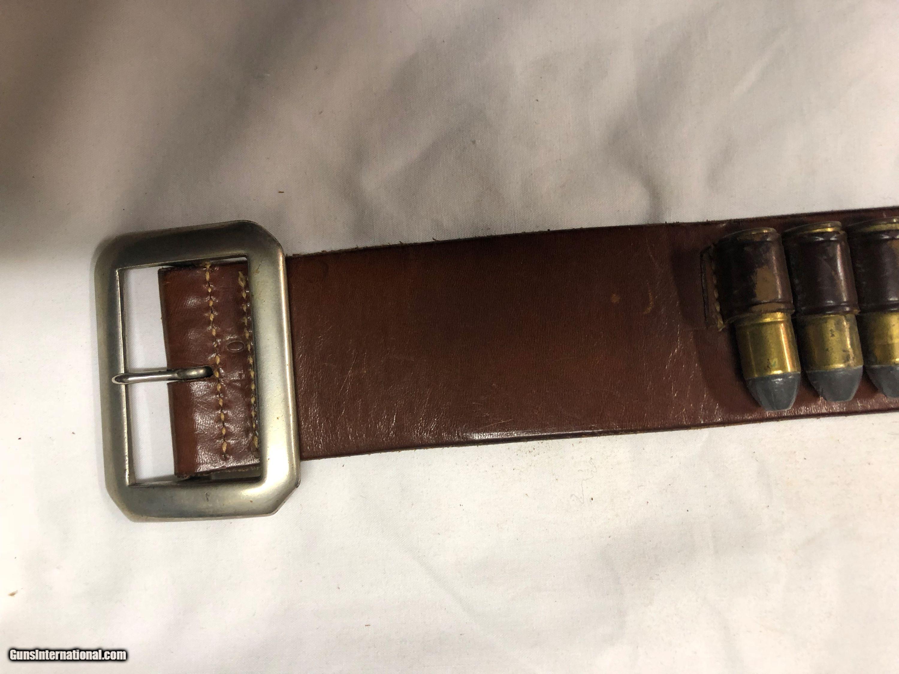 Description: Heiser-Denver holster and gun belt for 7 1/2" Calt SAA. VG condition. Circa early 1900's. Available with or without the period ammo at no differance in selling price. Belt is 44" long. 30 cartridge loops for 45 LC. Snap on holster is broken. SOLD |