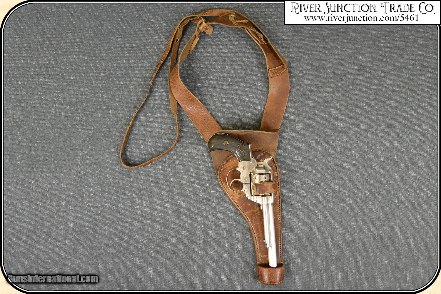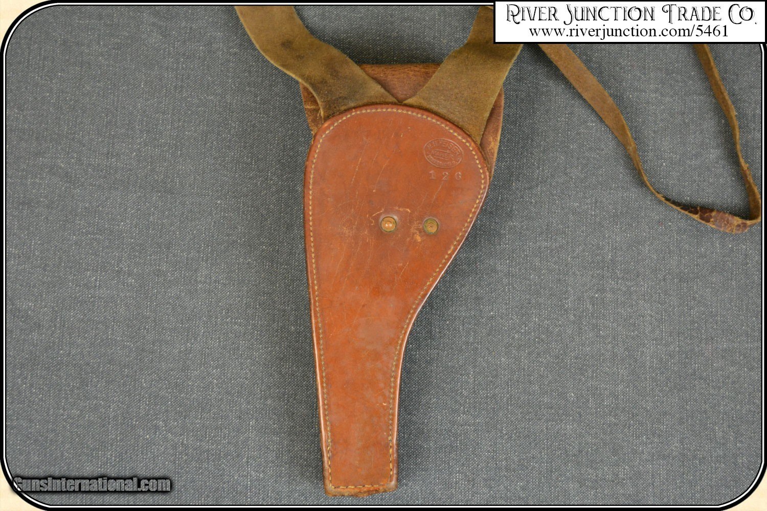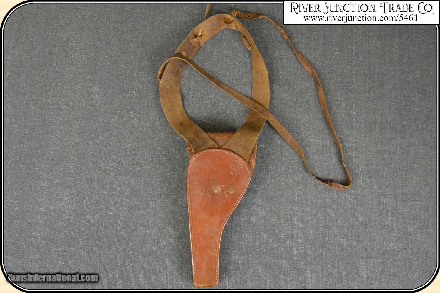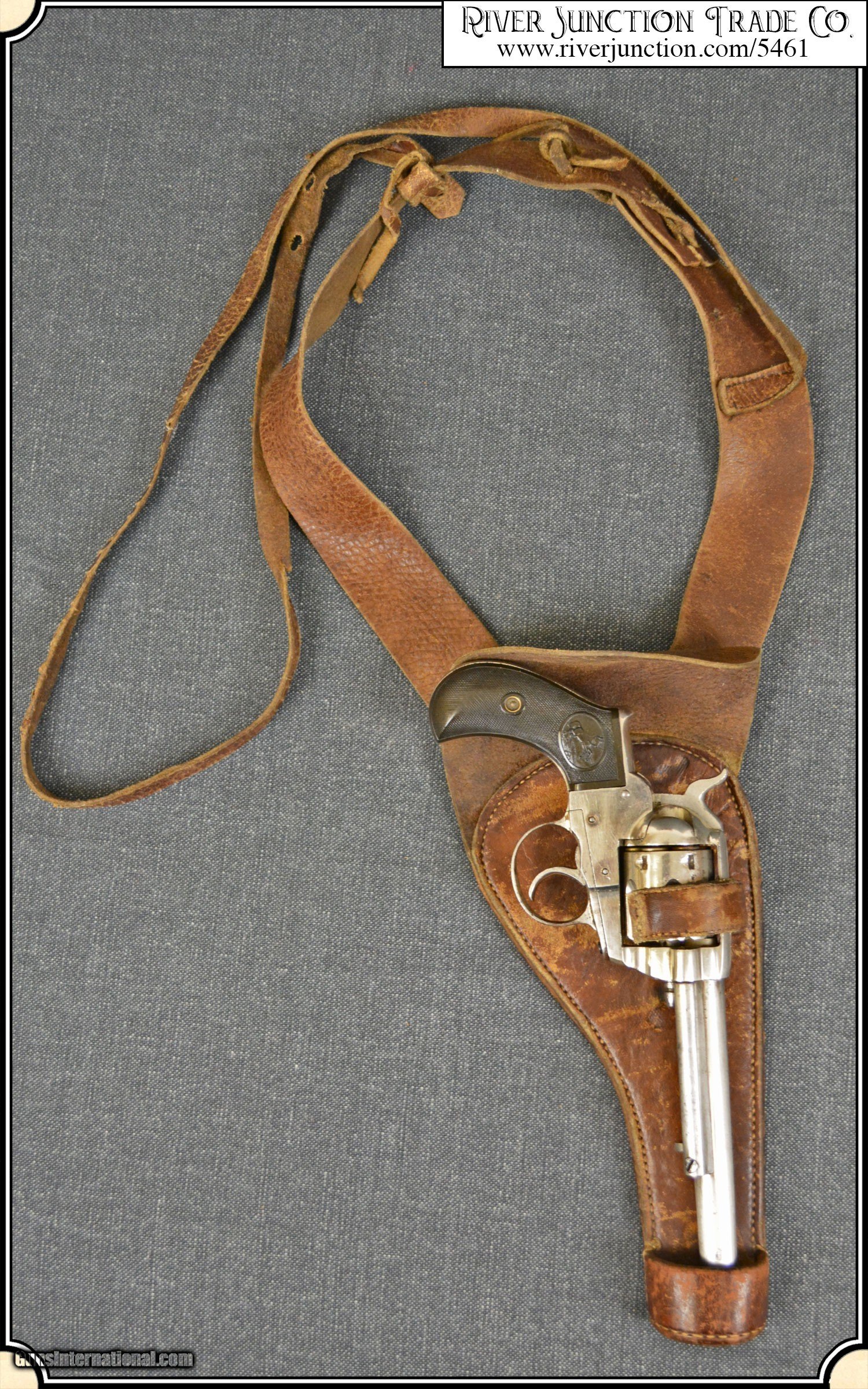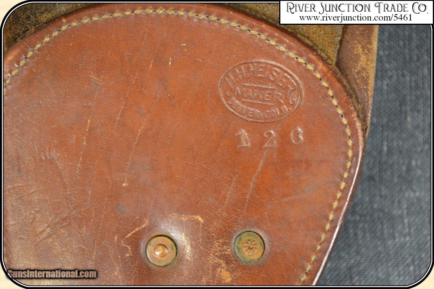 Description: H.H. Heiser, Denver, Colorado maker leather shoulder holster for a Small frame revolver such as a Colt Lightning revolver, in overall very good condition with some scuffs here and there. Circa early1900’s. My Lightning is not included. Payment: Item, can be ordered on line with a credit card or paypal on our sight. Just Google (riverjunction) and type in the River Junction Trade Co. item number (5461) in the search box. Before you checkout you will see shipping cost and total. OR If you prefer: Pay by cash, postal money order, cashiers check, personal & business checks. We wait for checks to clear. We always answer questions and entertain offers. Have questions? Call me 563-880-4588. Jim SOLD |