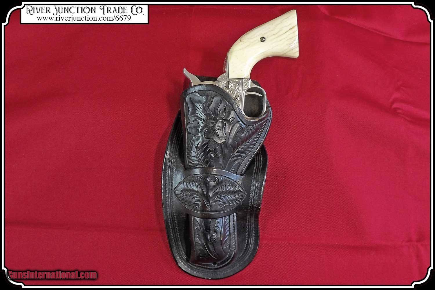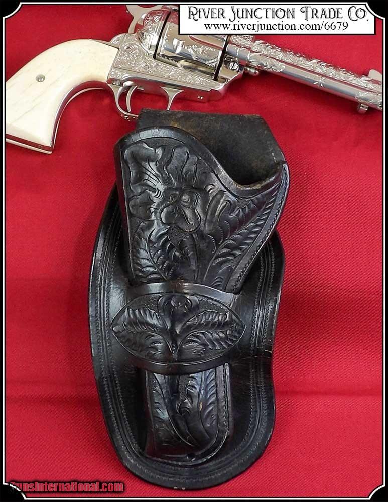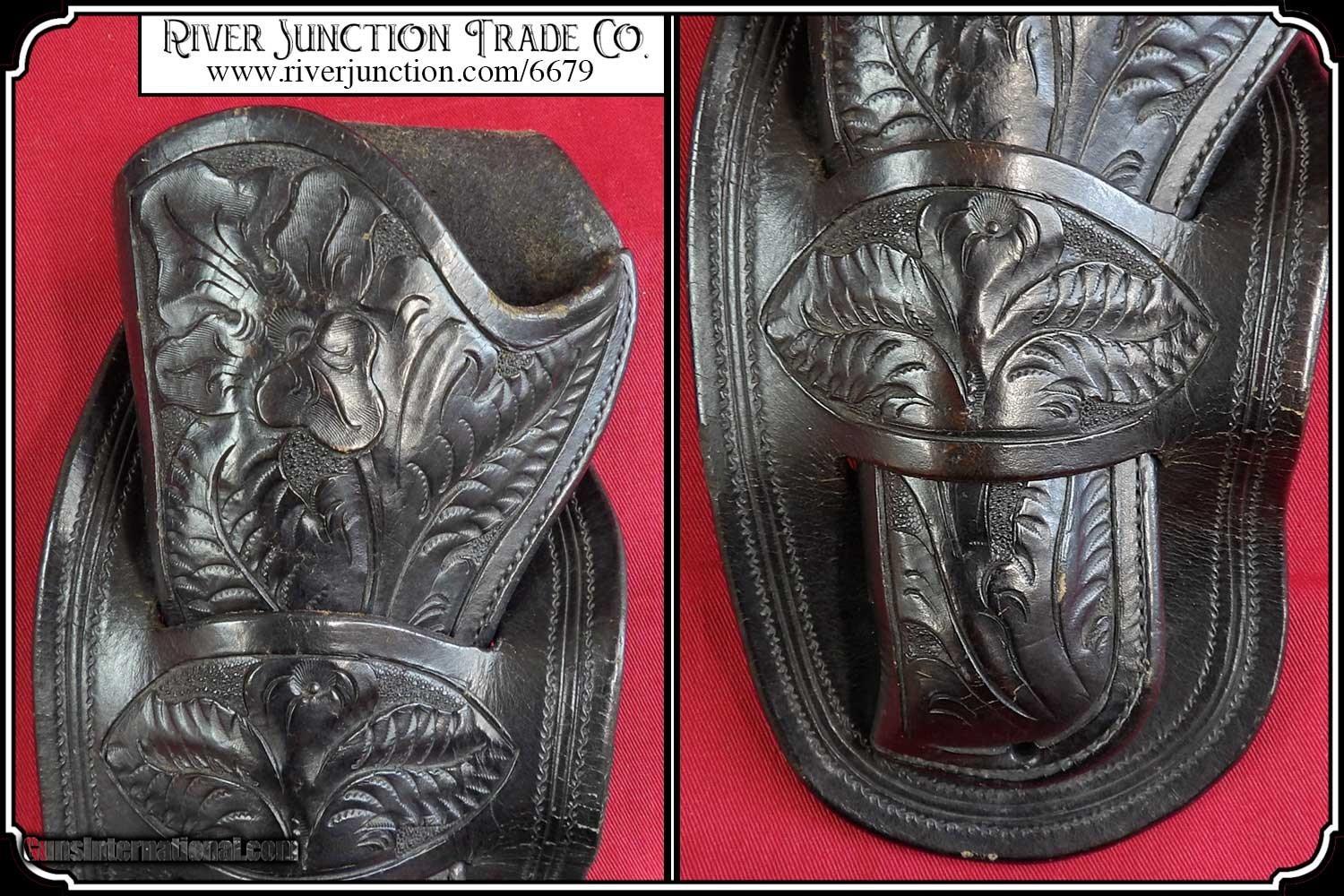Description: A beautiful hand tooled LEFT HAND holster for a 4 5/8 barreled Colt Single Action. It is LIGHTLY USED and the leather has a century of wear left in it. {Show Piece Holster worthy of a Show Piece Smoke Wagon} holster. My Colt is not included. "QUALITY ARTICLES ARE MADE FOR MEN WHO ARE TIRED OF THE EXTRAVAGANCE OF BUYING CHEAP THINGS" Payment: Item, can be ordered on line with a credit card or paypal on our sight. Just Google (riverjunction) and type in the River Junction Trade Co. item number (6679) in the search box. Before you checkout you will see shipping cost and total. OR If you prefer: Pay by cash, postal money order, cashiers check, personal & business checks. We wait for checks to clear. We always answer questions and entertain offers. Have questions? Call me 563-880-4588. Jim SOLD |