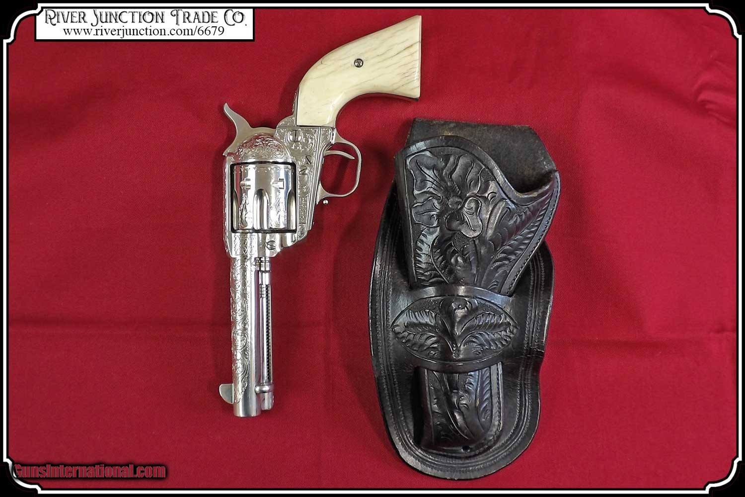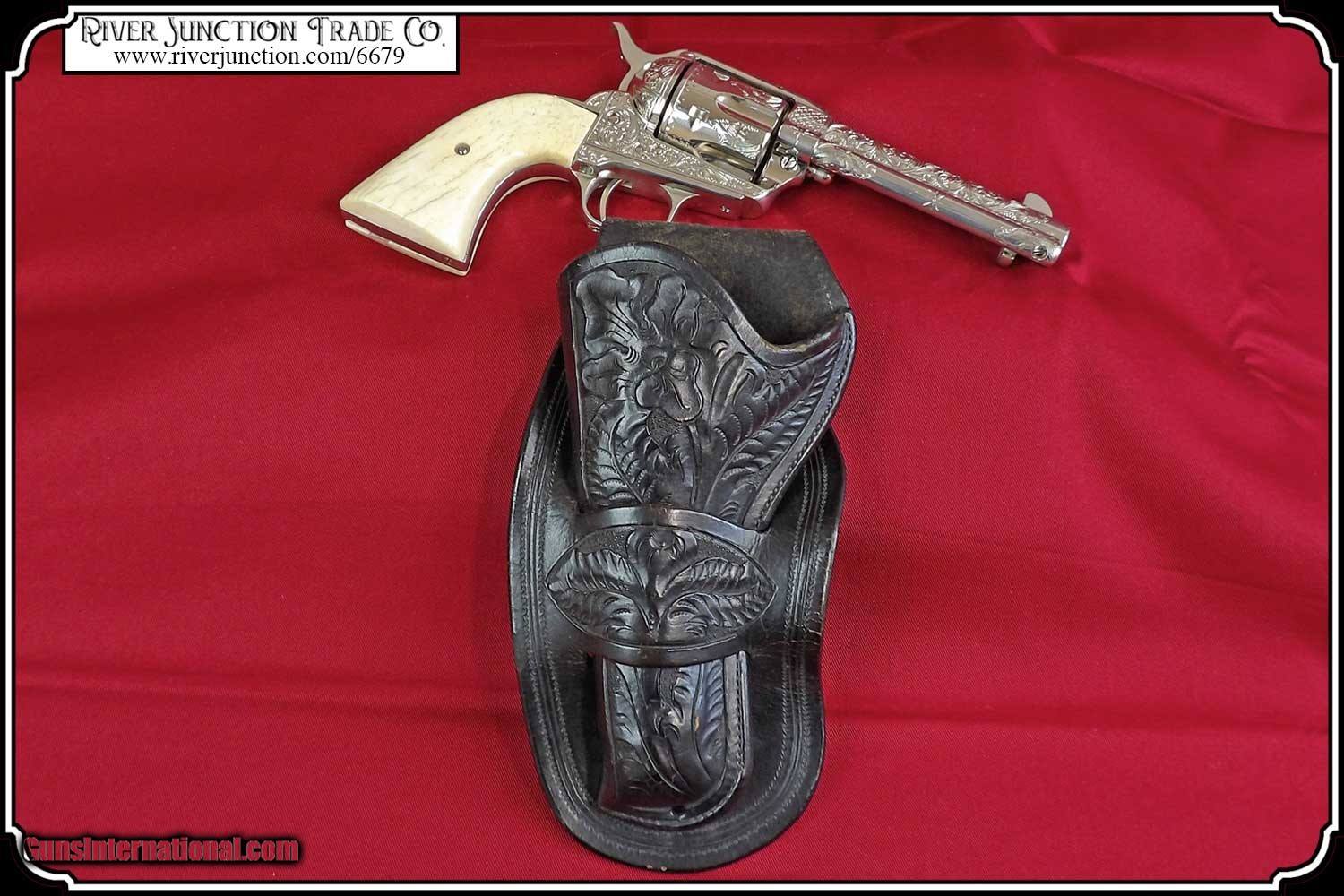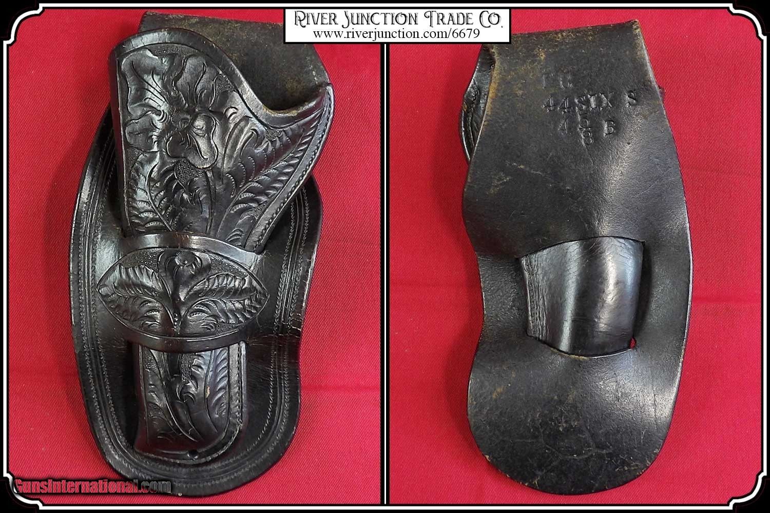 Description: A beautiful hand tooled LEFT HAND holster for a 4 5/8 barreled Colt Single Action. It is LIGHTLY USED and the leather has a century of wear left in it. {Show Piece Holster worthy of a Show Piece Smoke Wagon} holster. My Colt is not included. "QUALITY ARTICLES ARE MADE FOR MEN WHO ARE TIRED OF THE EXTRAVAGANCE OF BUYING CHEAP THINGS" Payment: Item, can be ordered on line with a credit card or paypal on our sight. Just Google (riverjunction) and type in the River Junction Trade Co. item number (6679) in the search box. Before you checkout you will see shipping cost and total. OR If you prefer: Pay by cash, postal money order, cashiers check, personal & business checks. We wait for checks to clear. We always answer questions and entertain offers. Have questions? Call me 563-880-4588. Jim SOLD |