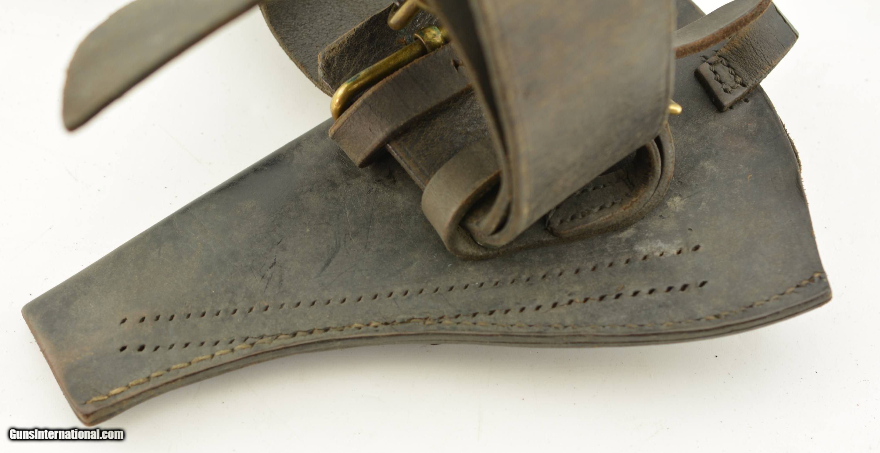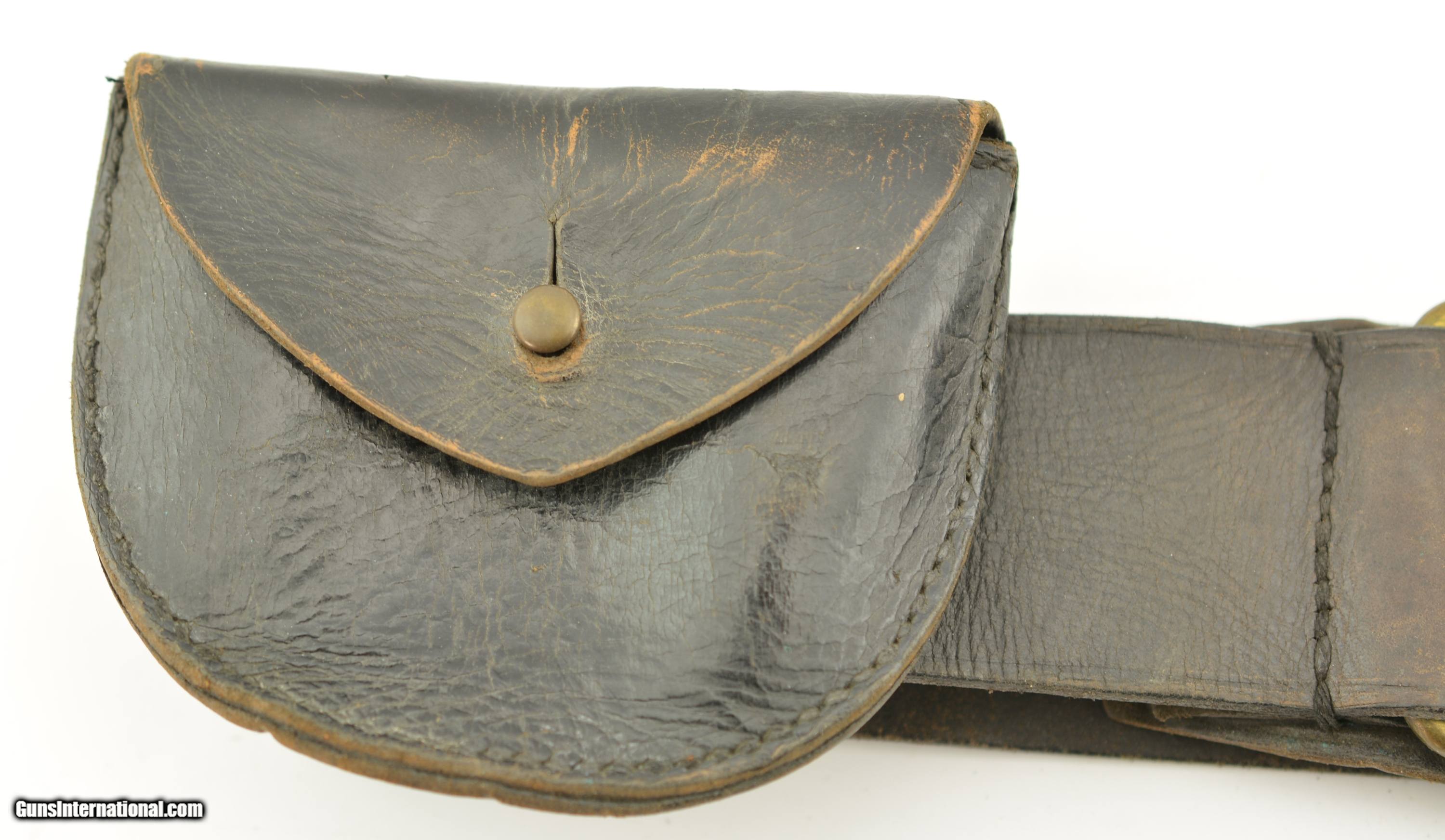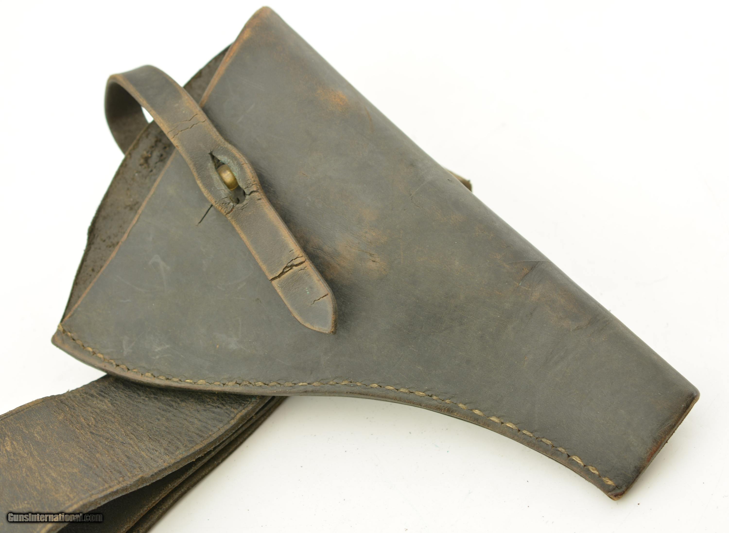 Description: This is a black, possibly officers, revolver rig. The belt is marked made by Hobson & Sons out of London in 1948 and has the classic snake buckle clasp. The belt is fully functional and supple with nice brass, small age cracks and fading of the black, will fit a small waist. The holster is in very good original condition with the cleaning rod holder removed, has two hanging straps with a good strap and hardware, I can not find a makers mark. The ammo pouch is in very good condition again with some signs of age and use. SOLD |