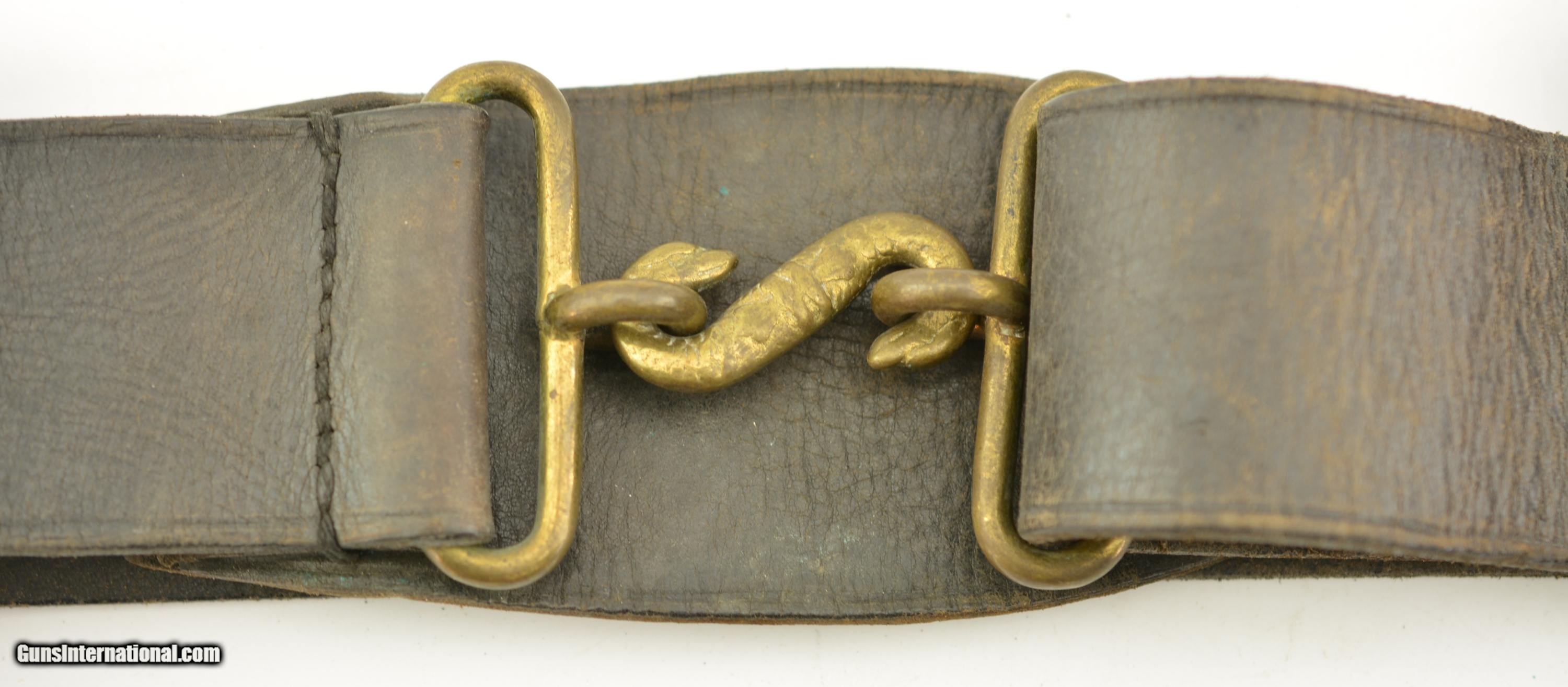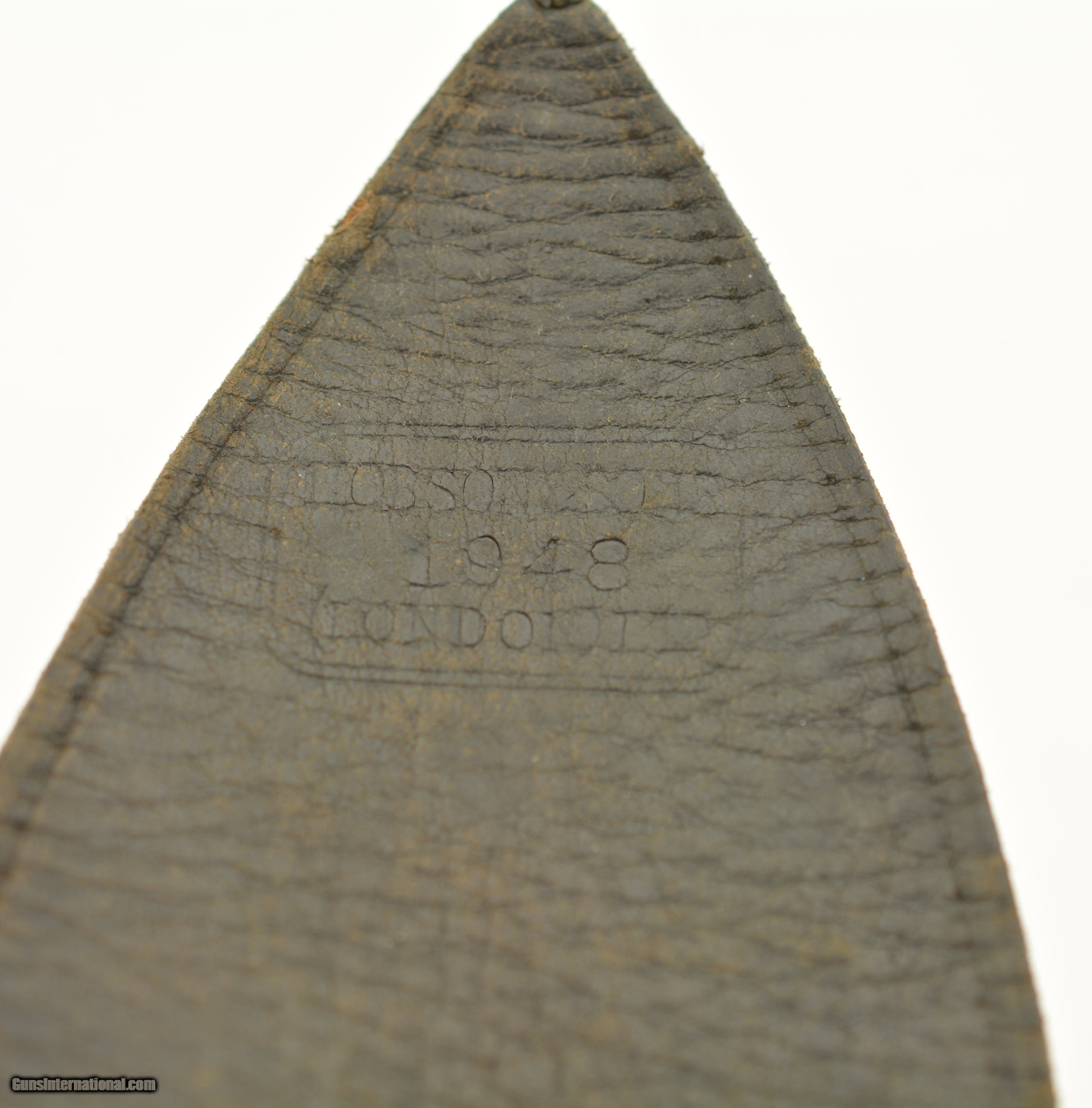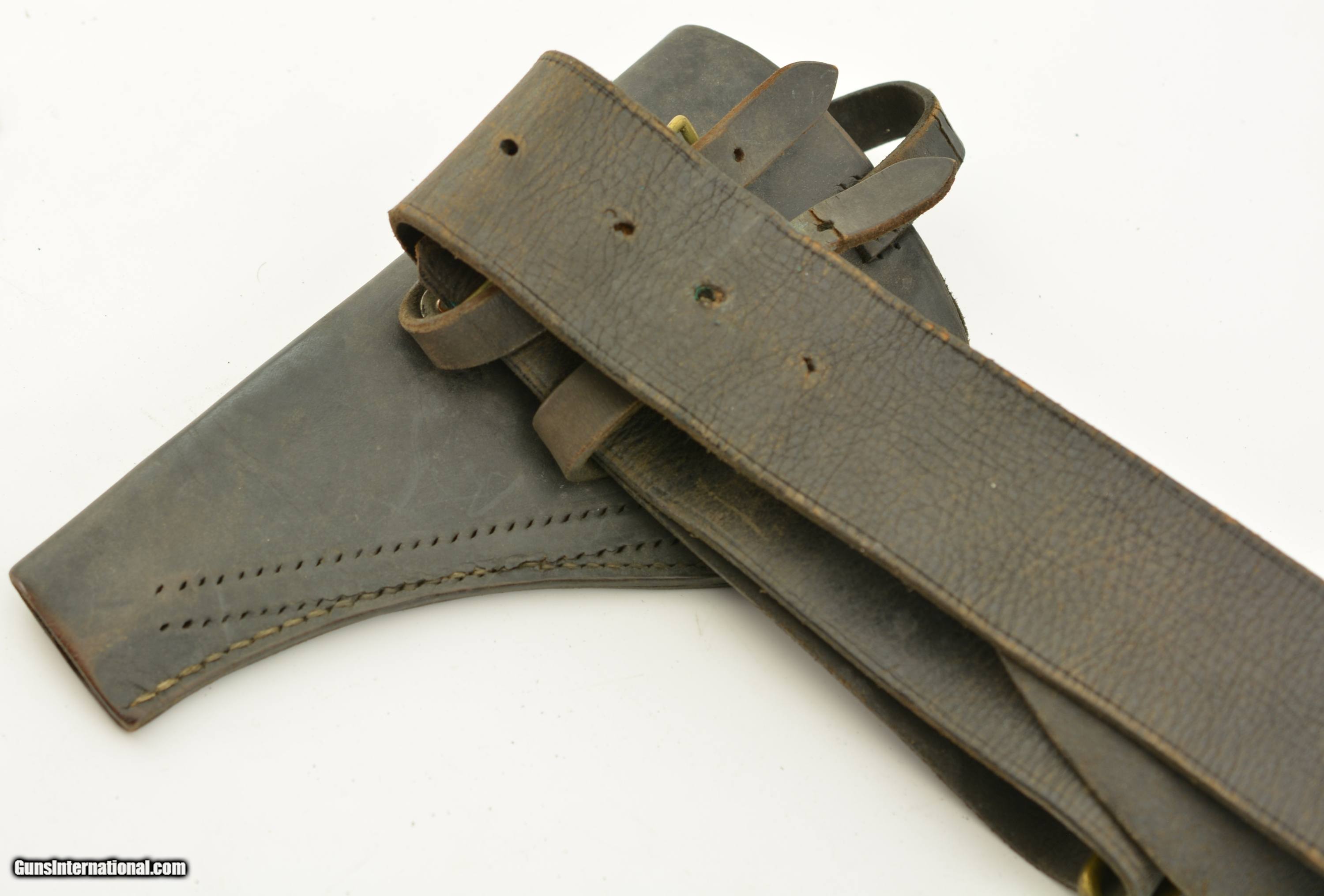 Description: This is a black, possibly officers, revolver rig. The belt is marked made by Hobson & Sons out of London in 1948 and has the classic snake buckle clasp. The belt is fully functional and supple with nice brass, small age cracks and fading of the black, will fit a small waist. The holster is in very good original condition with the cleaning rod holder removed, has two hanging straps with a good strap and hardware, I can not find a makers mark. The ammo pouch is in very good condition again with some signs of age and use. SOLD |